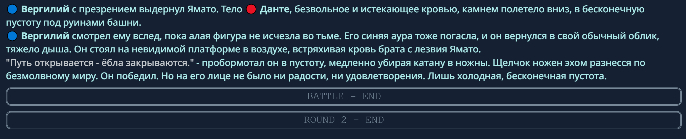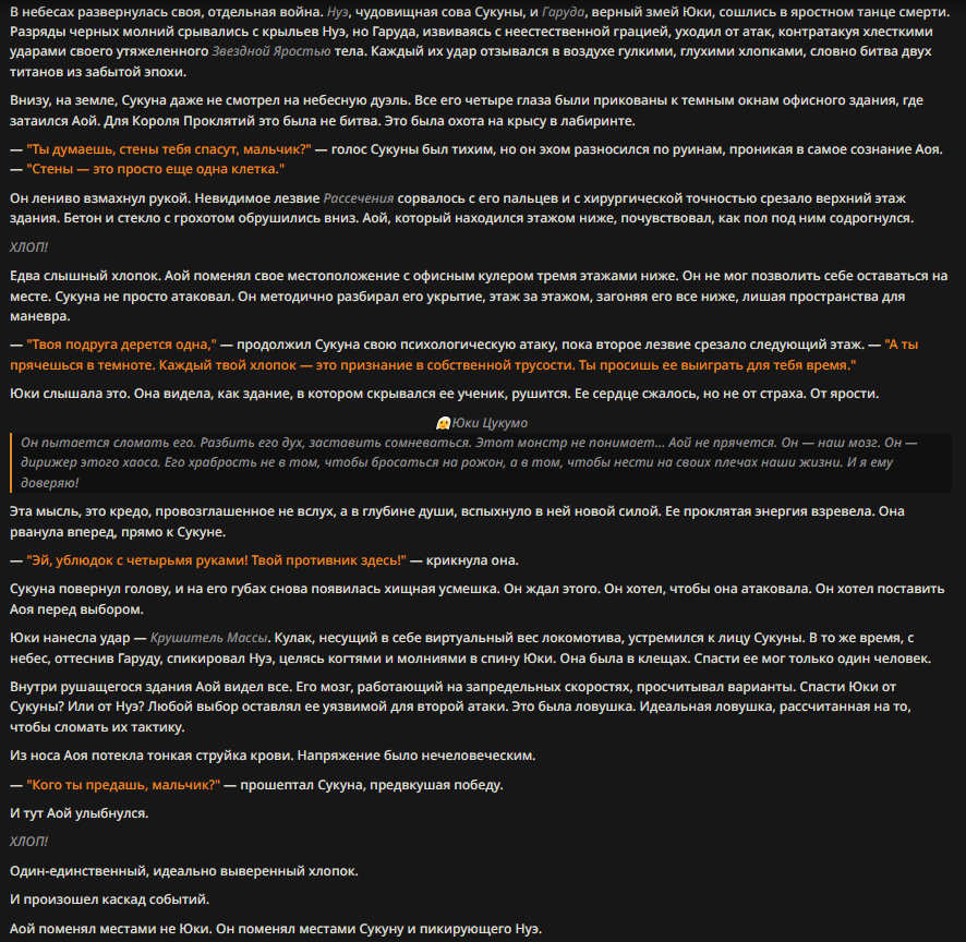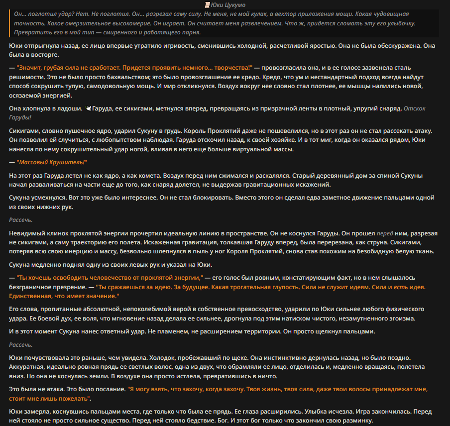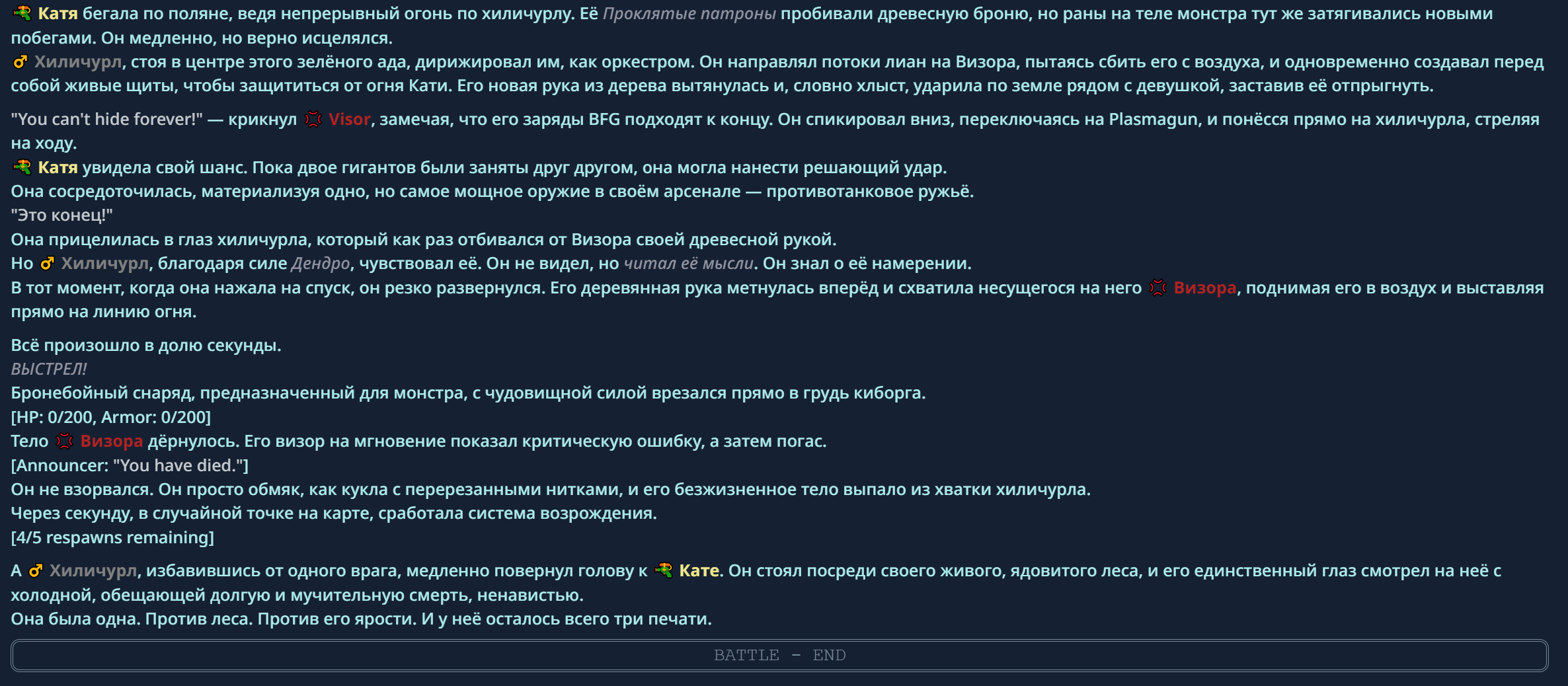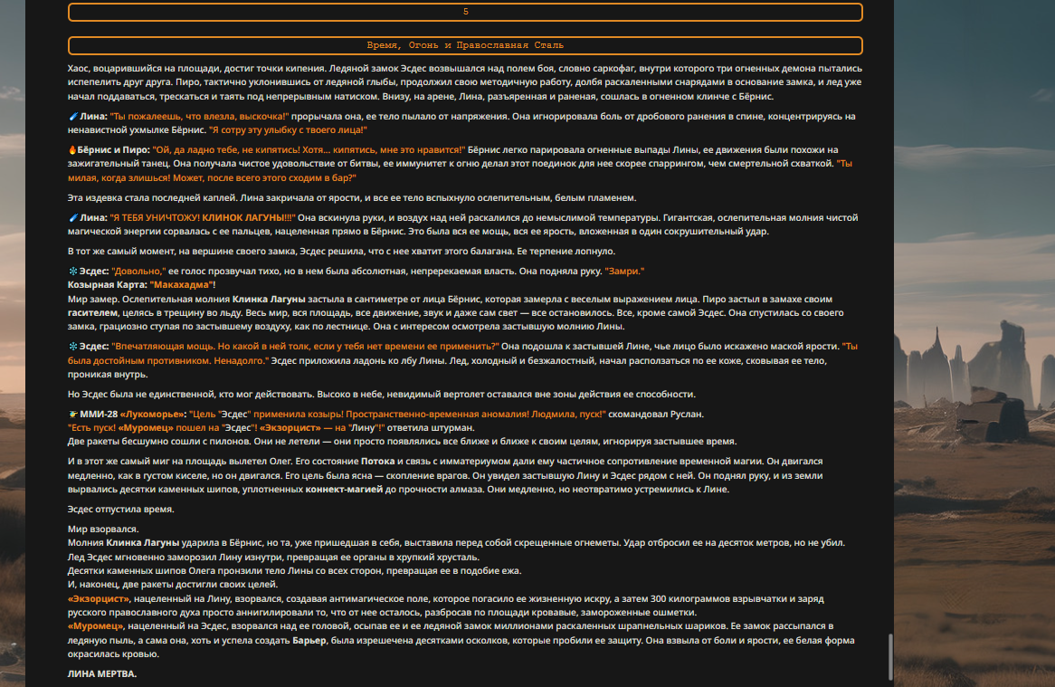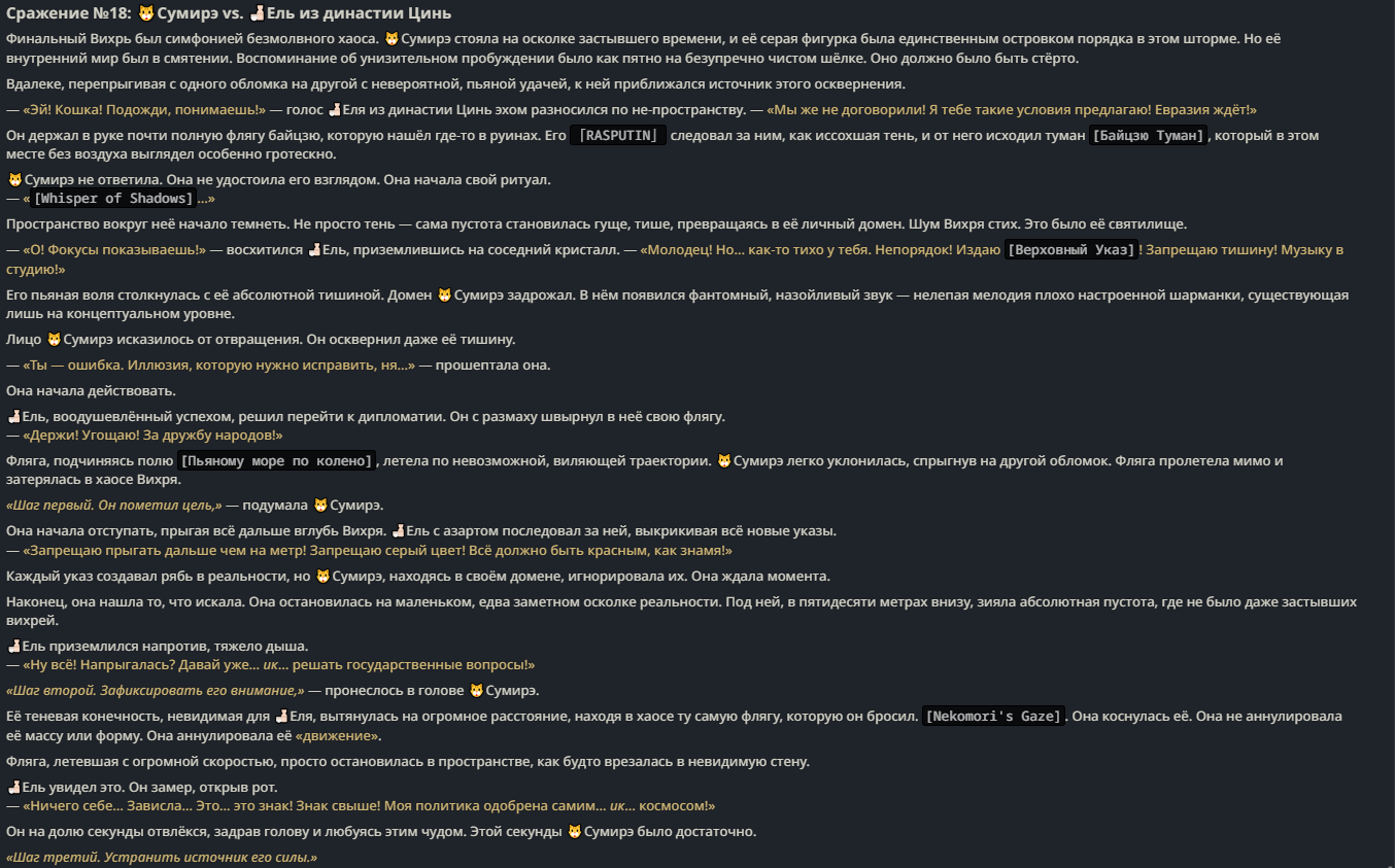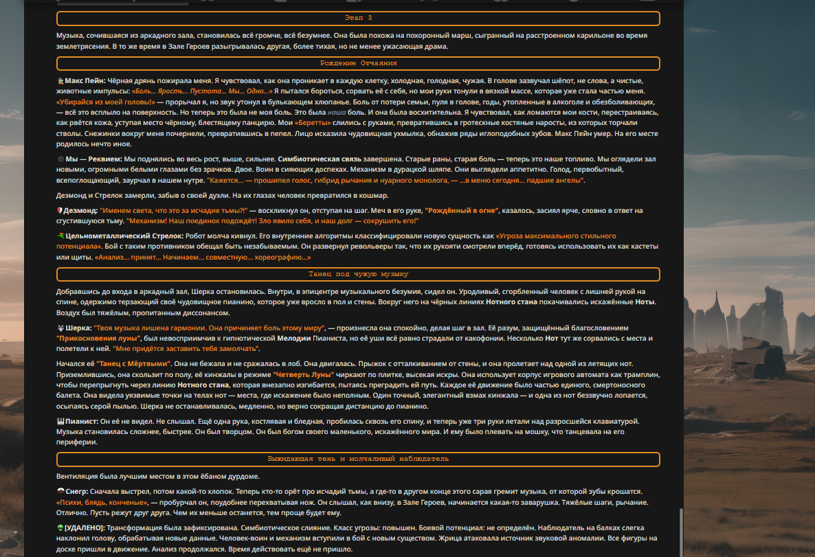 Звучит так, как будто я не зря расписывал все эти тонны предысторий и лора, лол. Ну по итогу волчара в нанокостюме выиграл, надо теперь писать нового волчару в нанокостюме с другими механиками и другим сюжетом, лол.