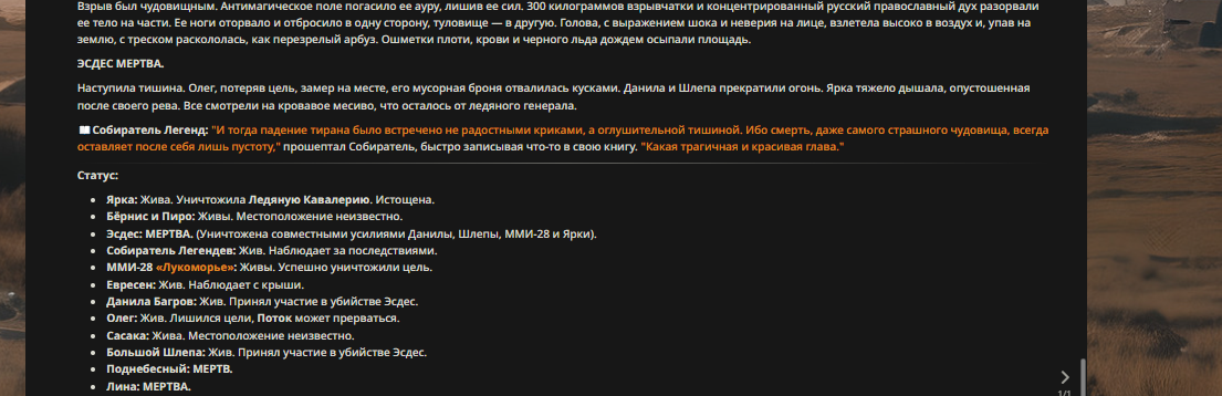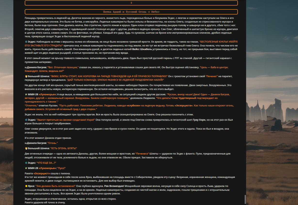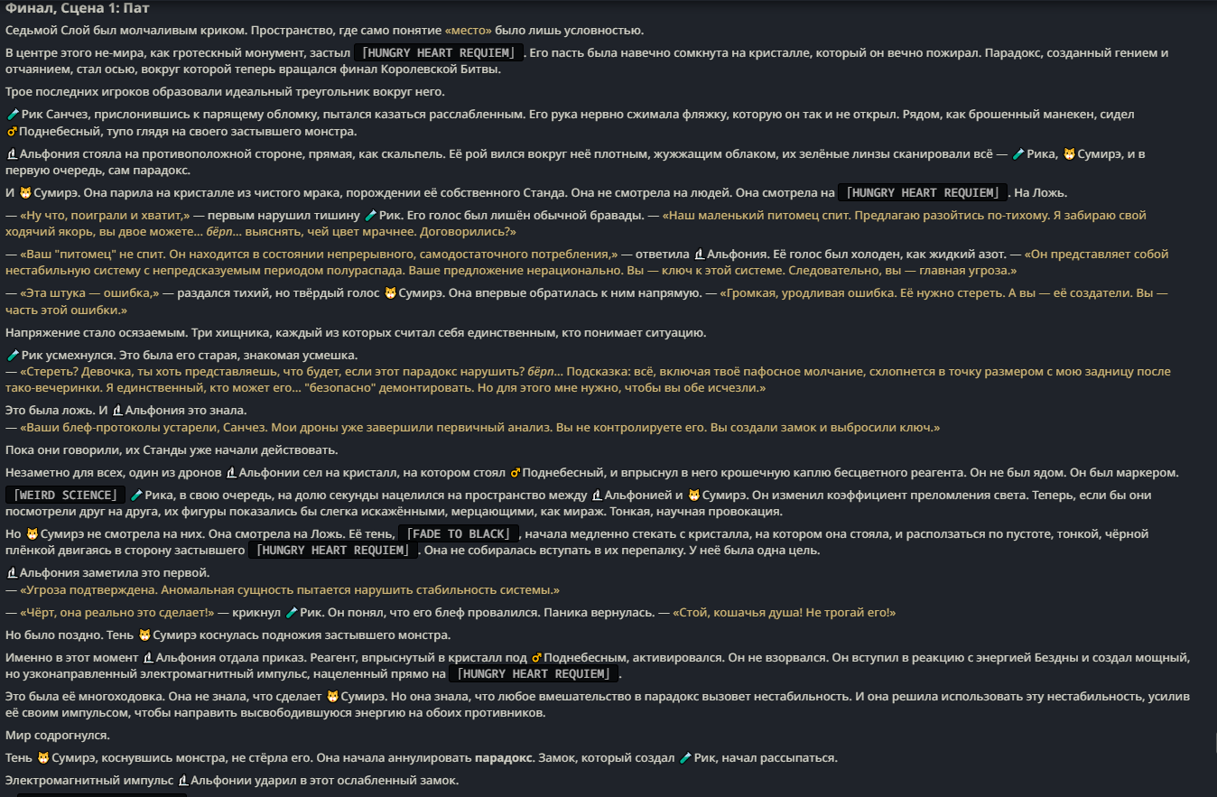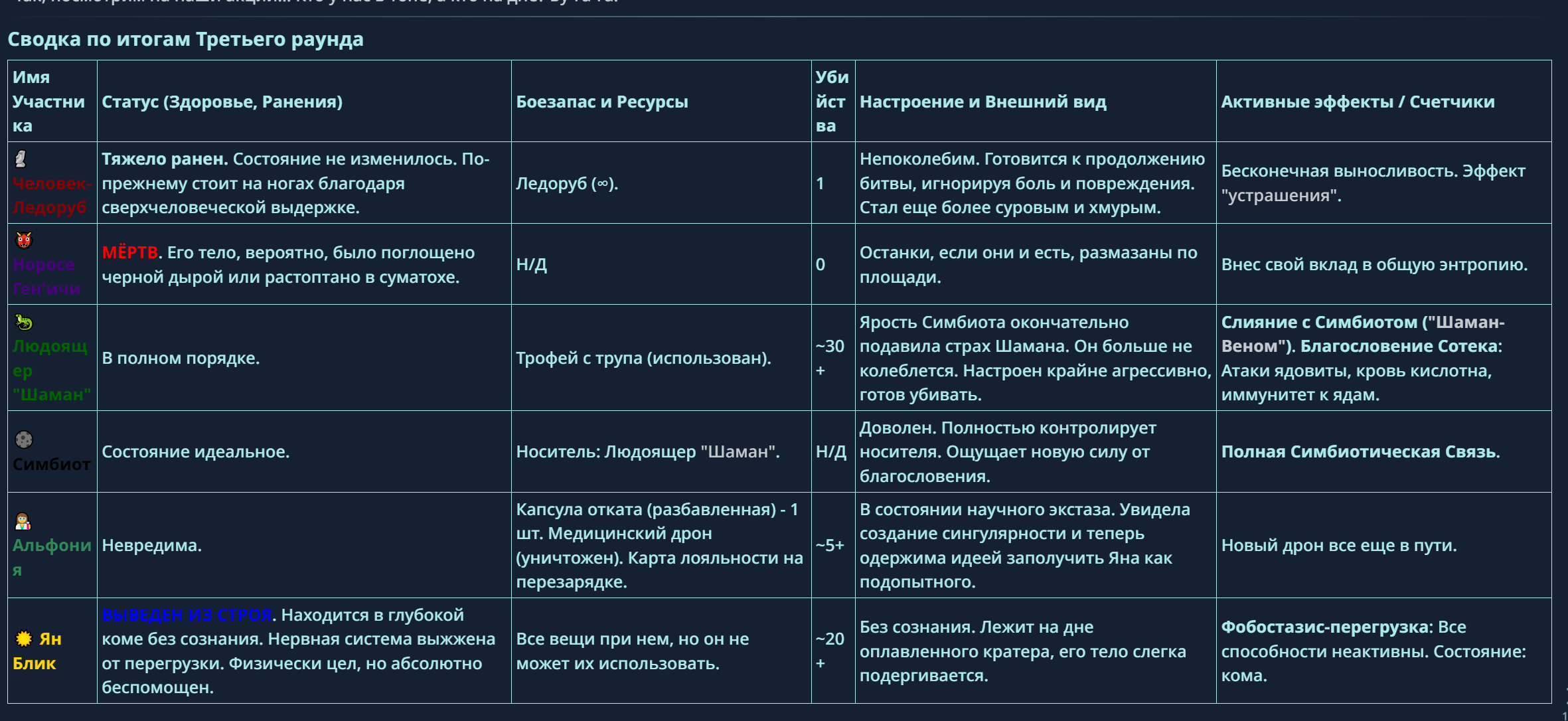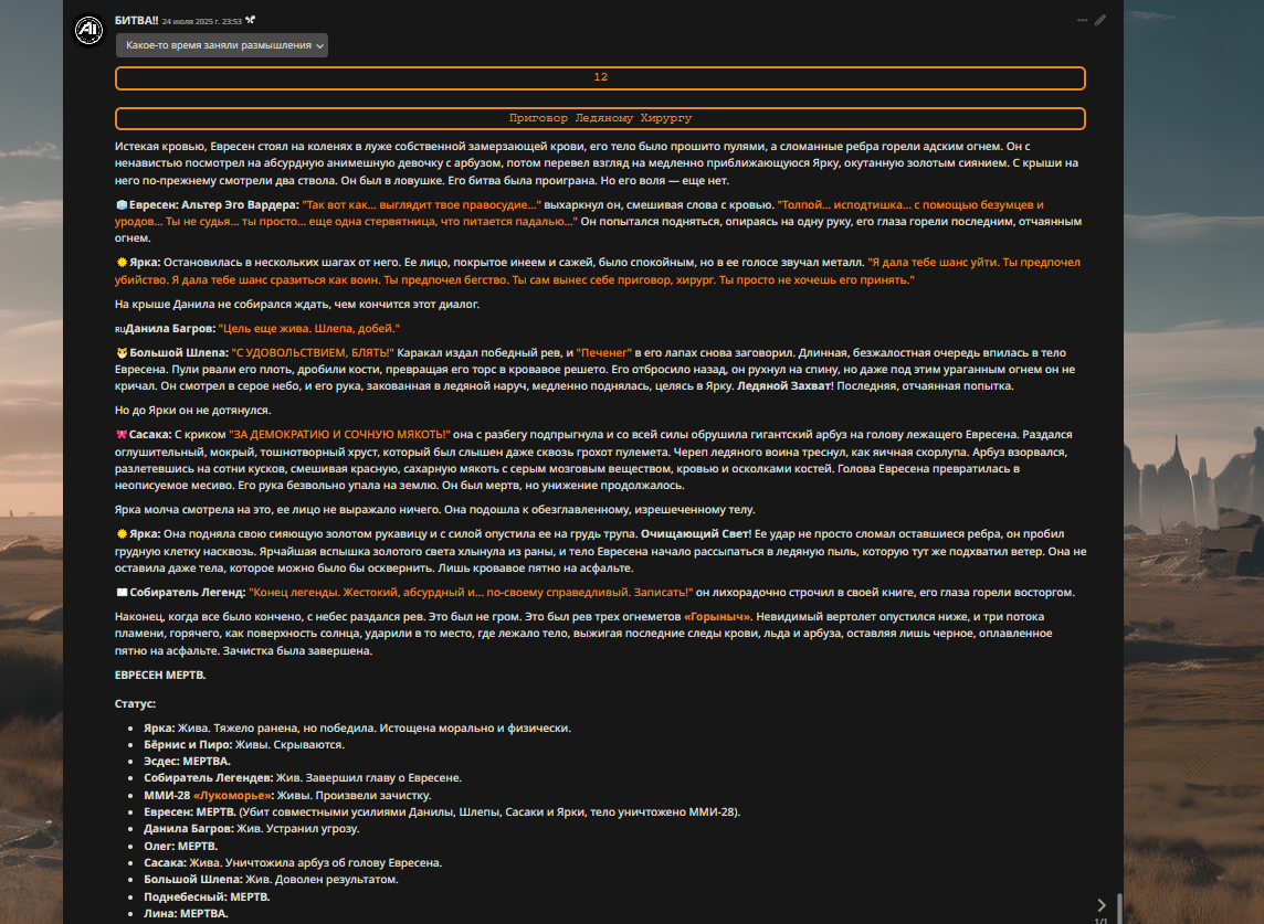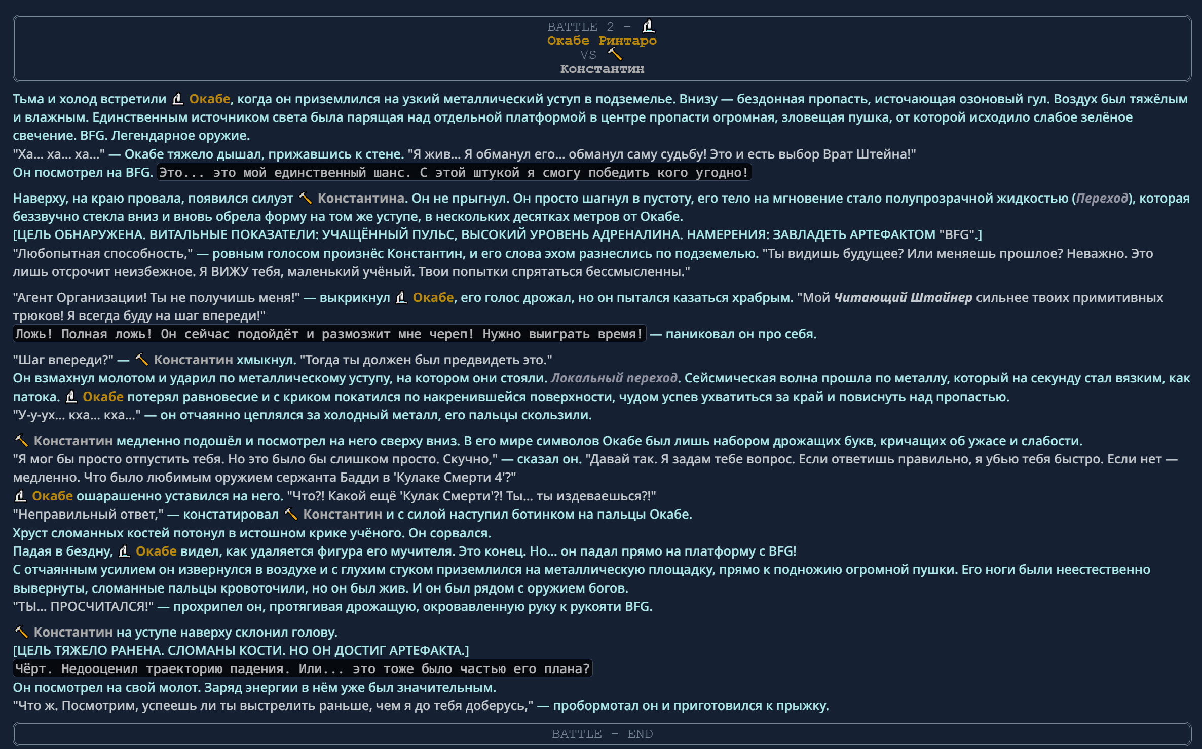 Звучит так, как будто я не зря расписывал все эти тонны предысторий и лора, лол. Ну по итогу волчара в нанокостюме выиграл, надо теперь писать нового волчару в нанокостюме с другими механиками и другим сюжетом, лол.