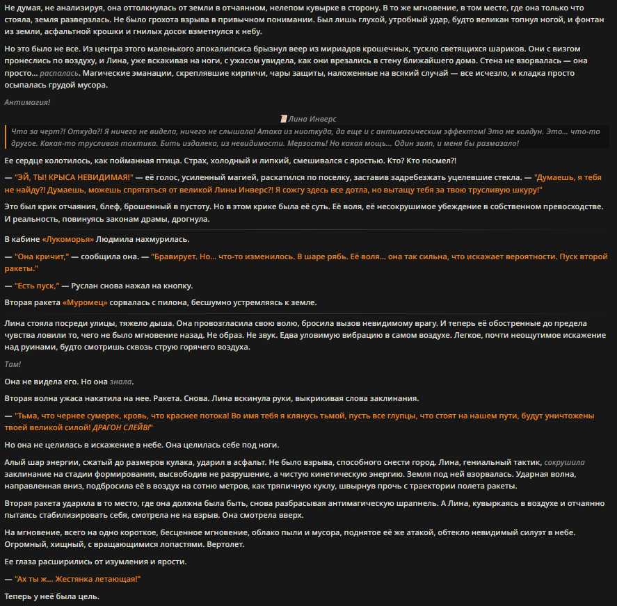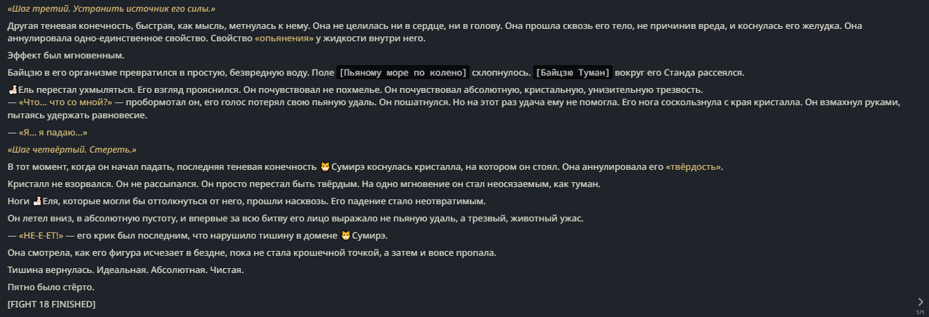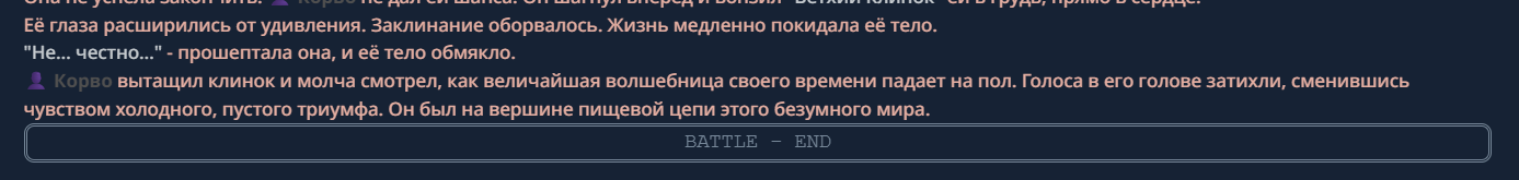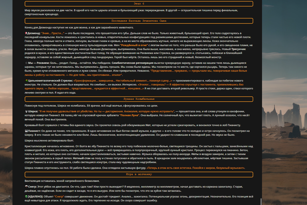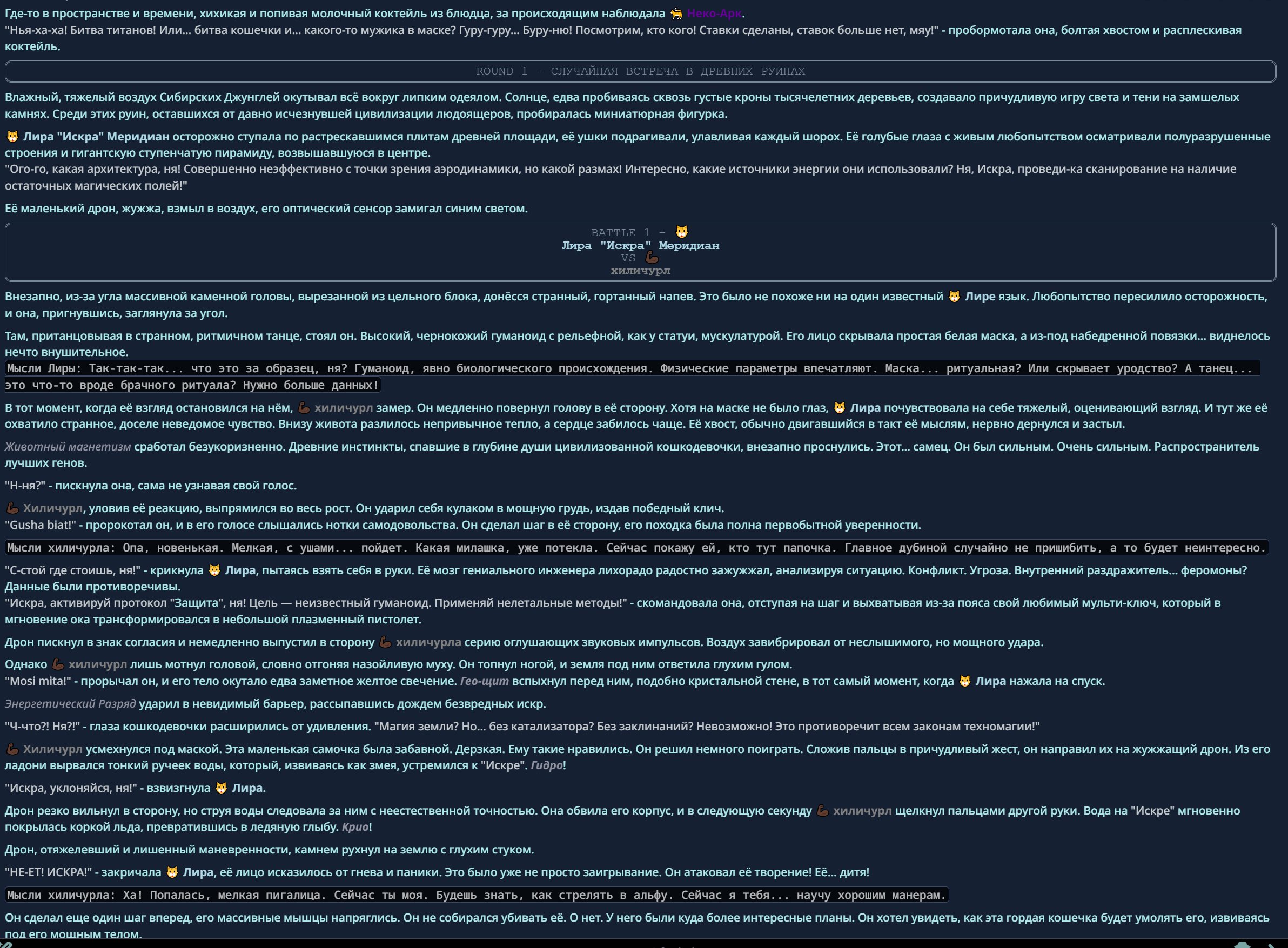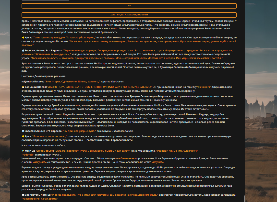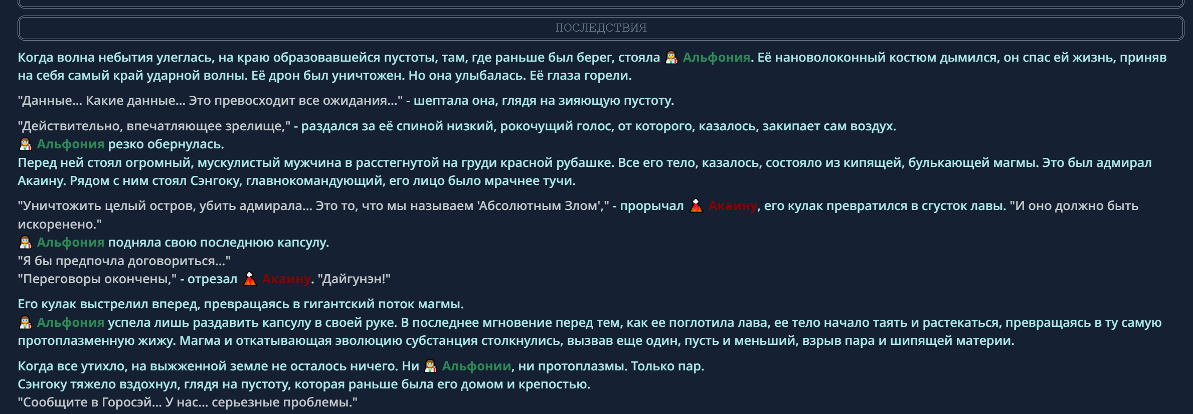 Звучит так, как будто я не зря расписывал все эти тонны предысторий и лора, лол. Ну по итогу волчара в нанокостюме выиграл, надо теперь писать нового волчару в нанокостюме с другими механиками и другим сюжетом, лол.