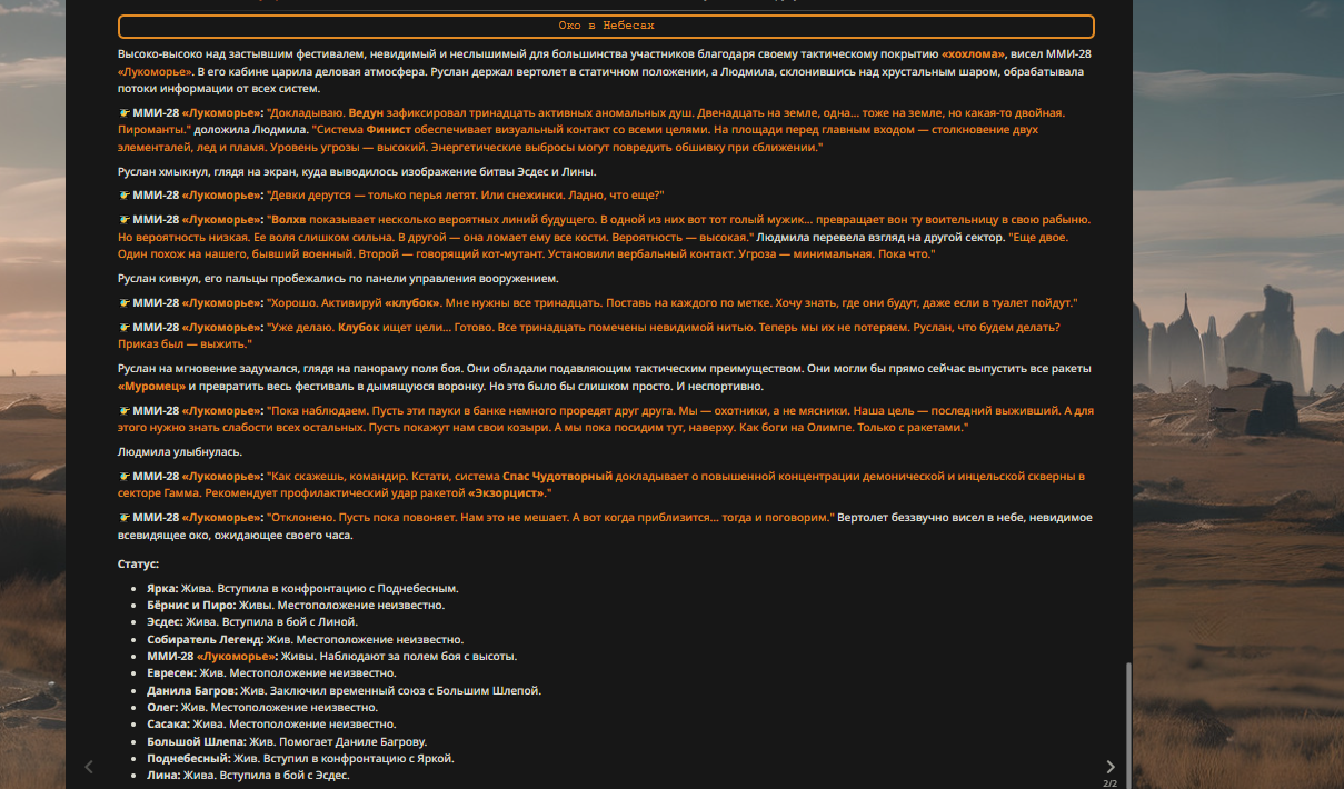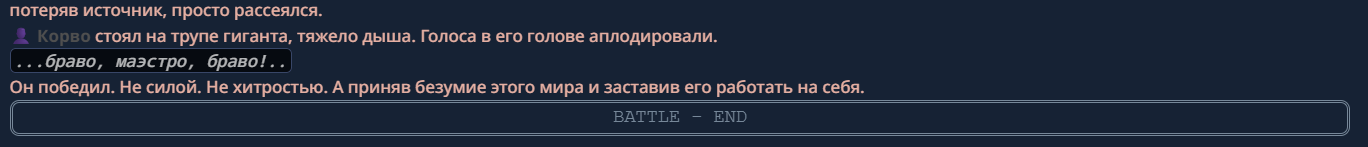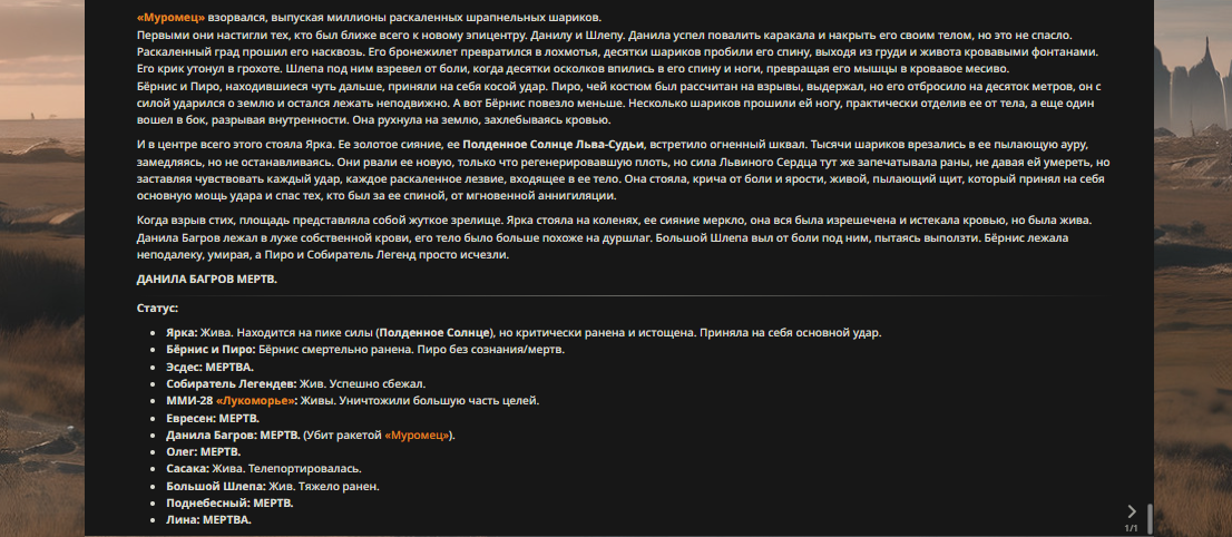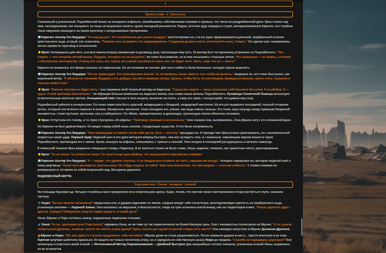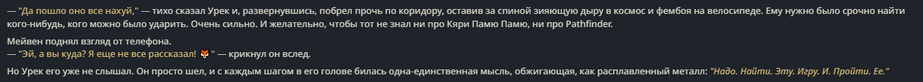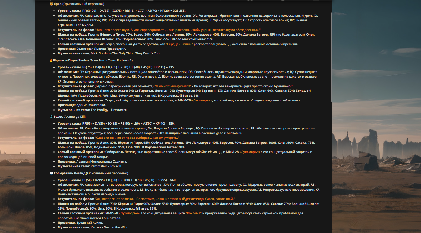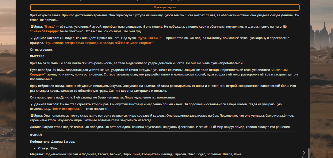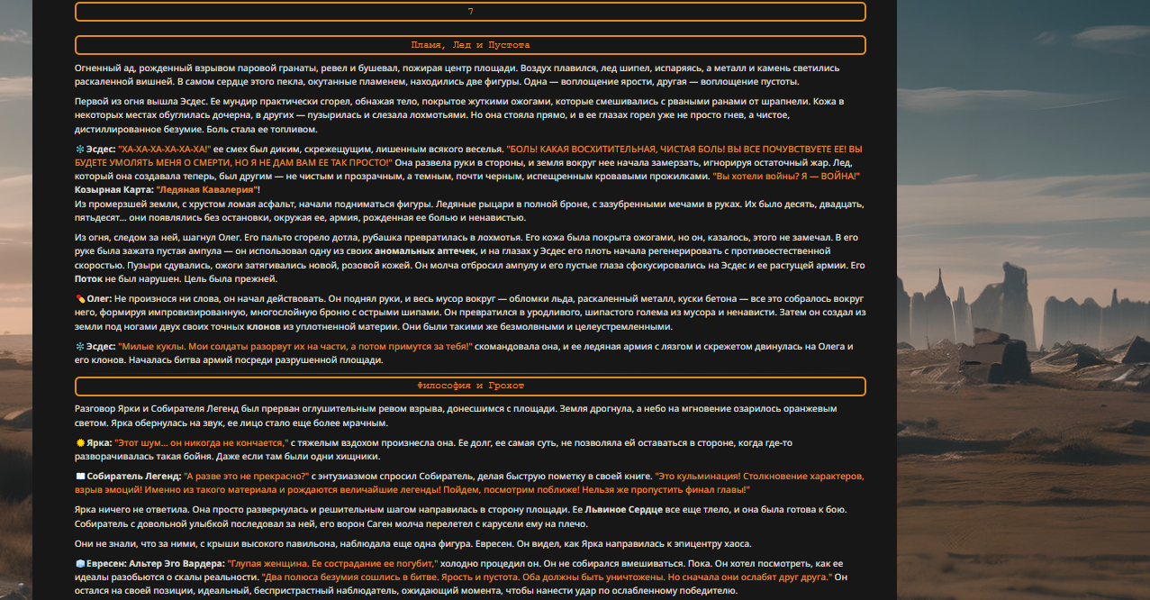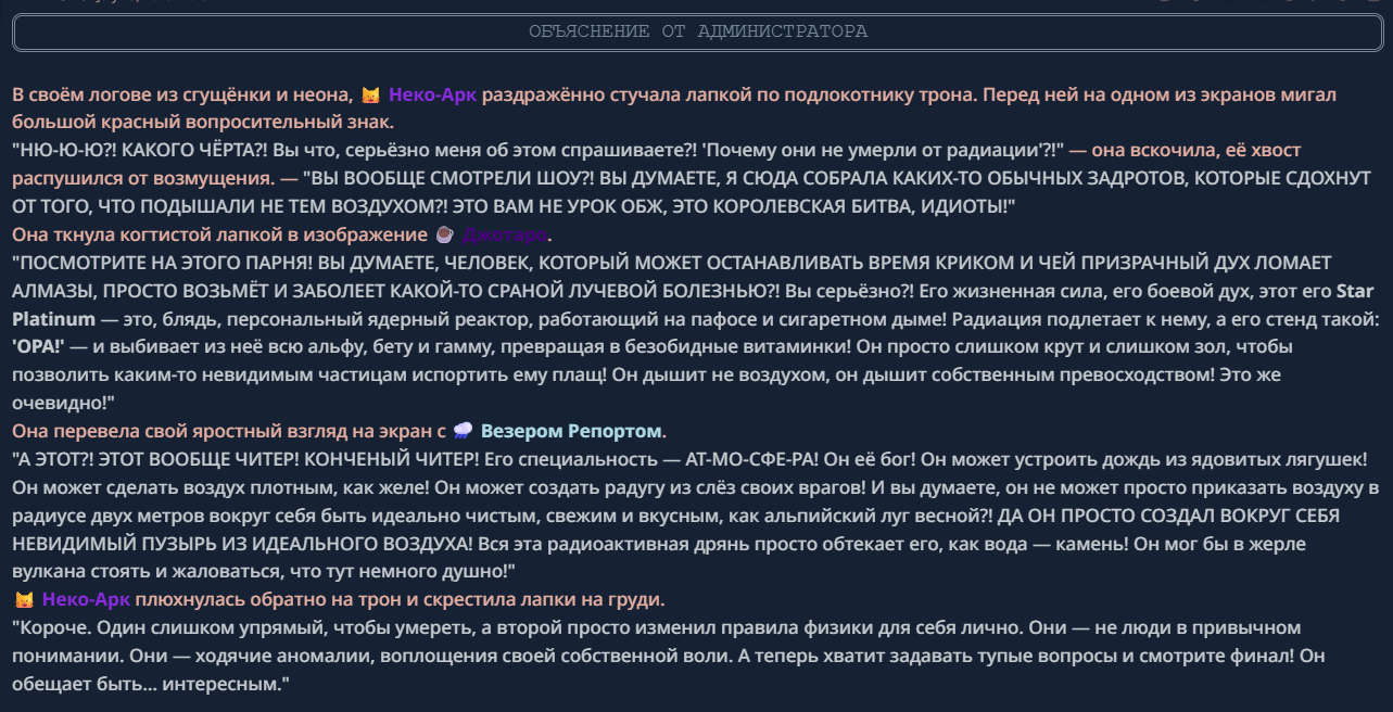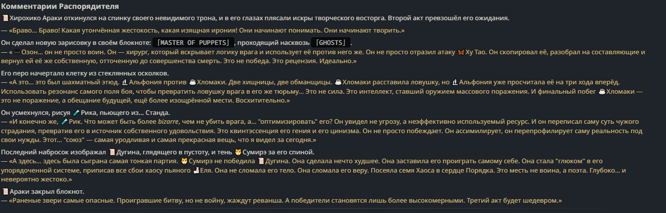 Звучит так, как будто я не зря расписывал все эти тонны предысторий и лора, лол. Ну по итогу волчара в нанокостюме выиграл, надо теперь писать нового волчару в нанокостюме с другими механиками и другим сюжетом, лол.
