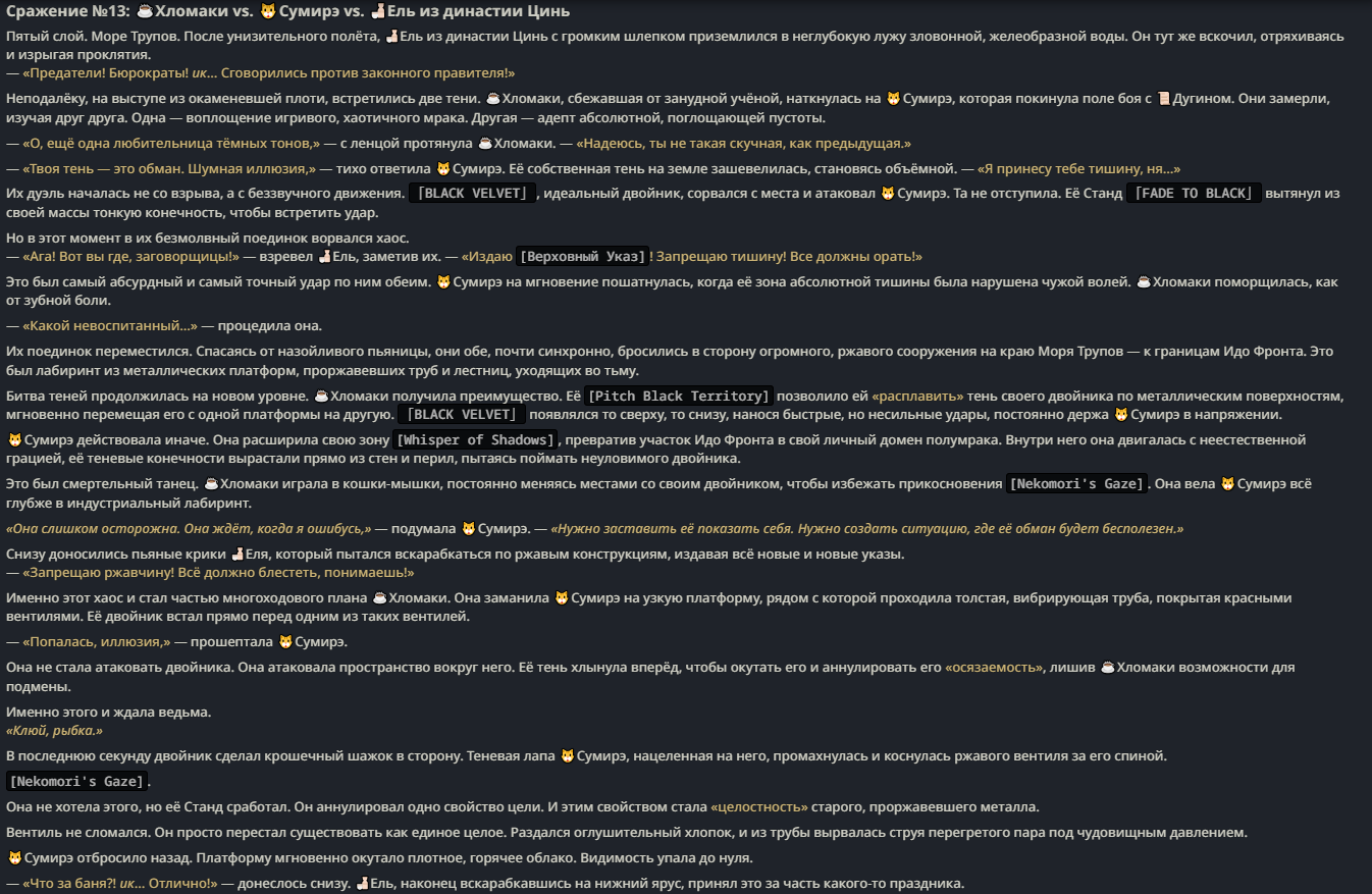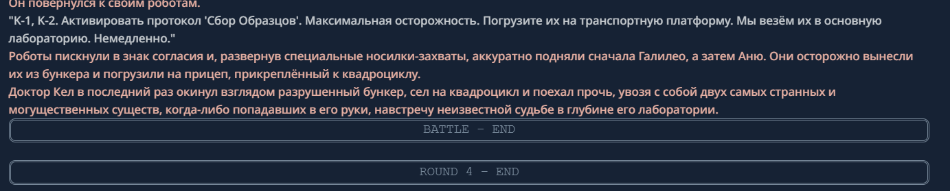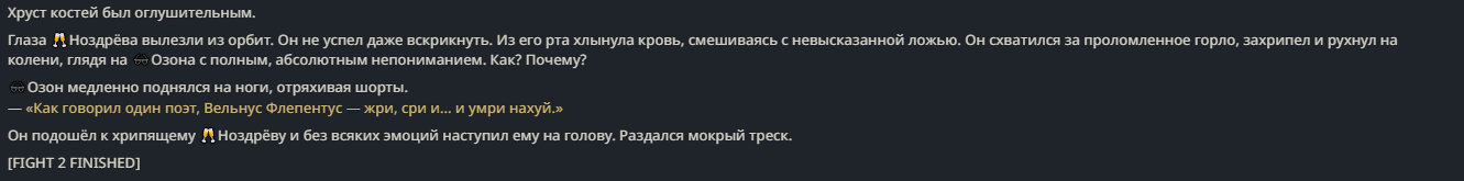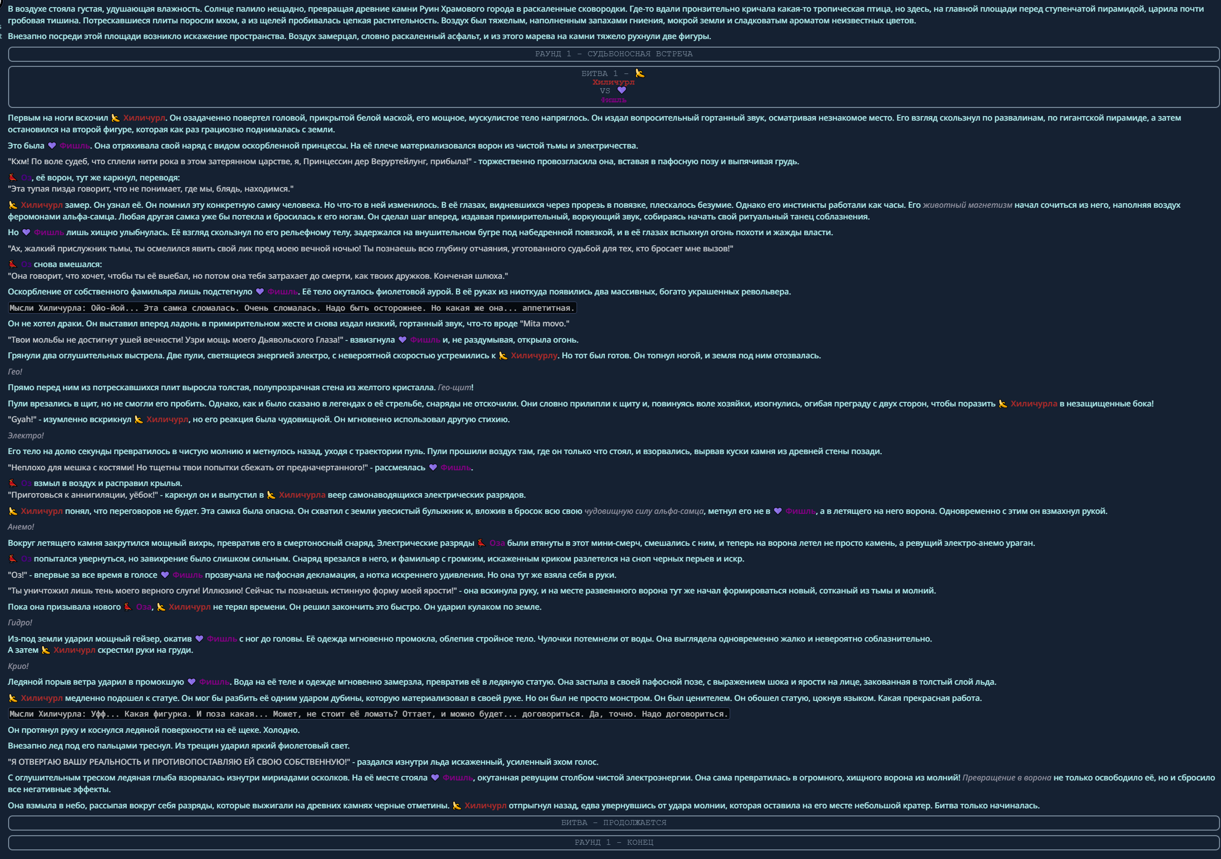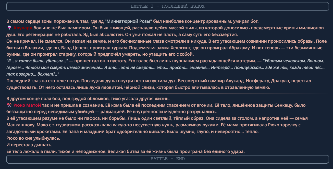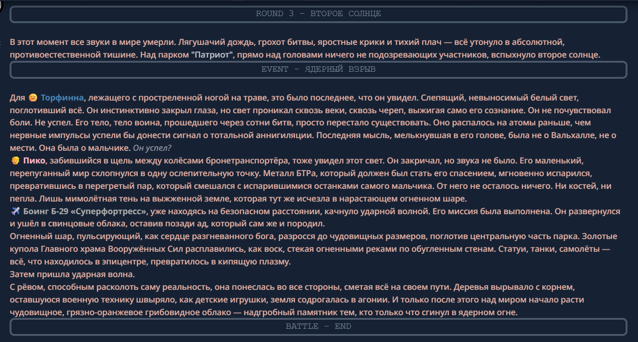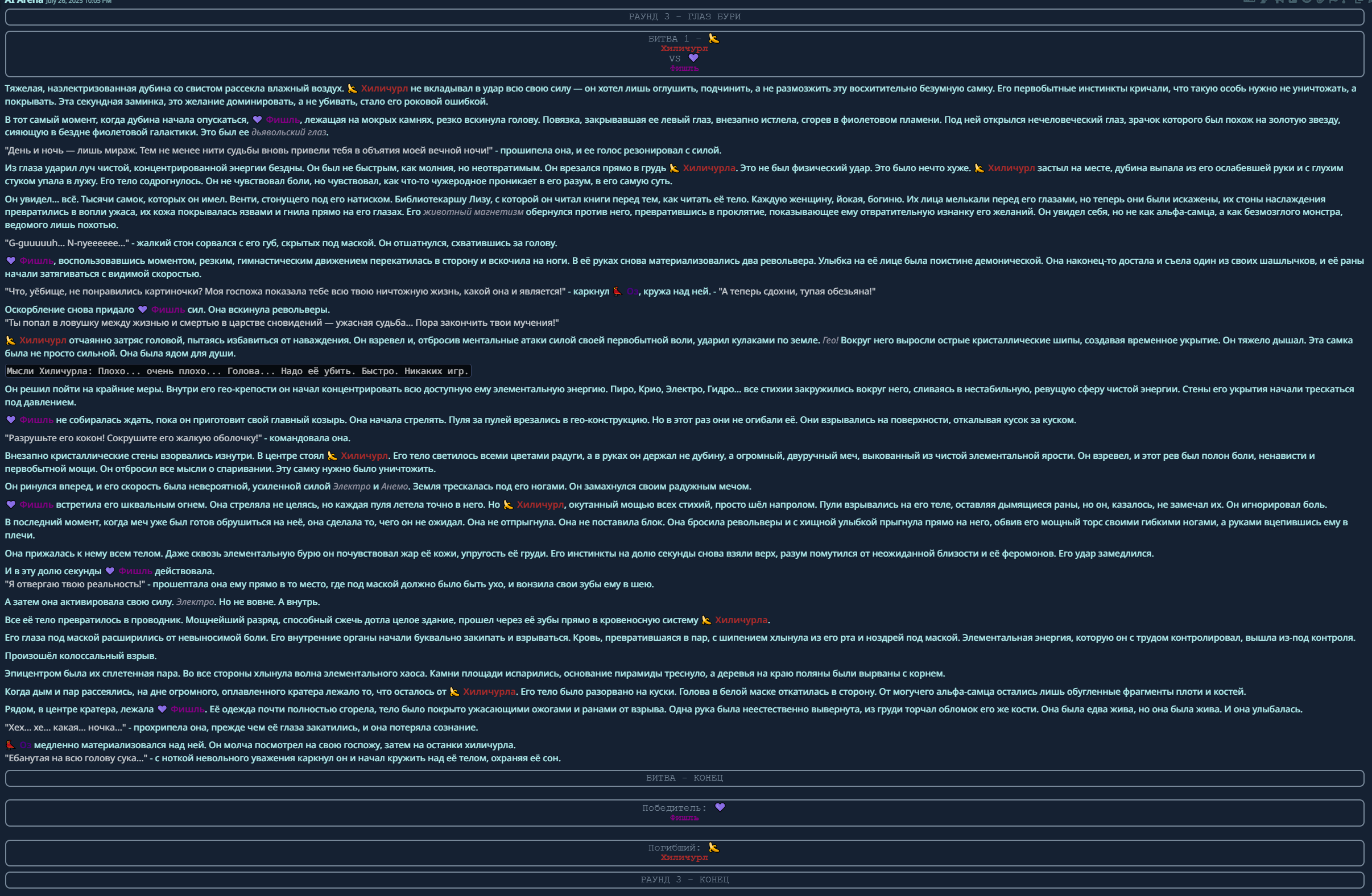 Звучит так, как будто я не зря расписывал все эти тонны предысторий и лора, лол. Ну по итогу волчара в нанокостюме выиграл, надо теперь писать нового волчару в нанокостюме с другими механиками и другим сюжетом, лол.