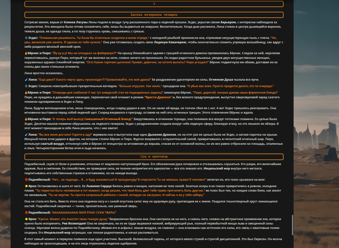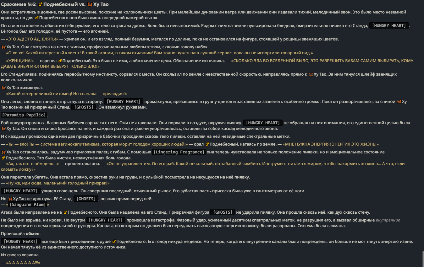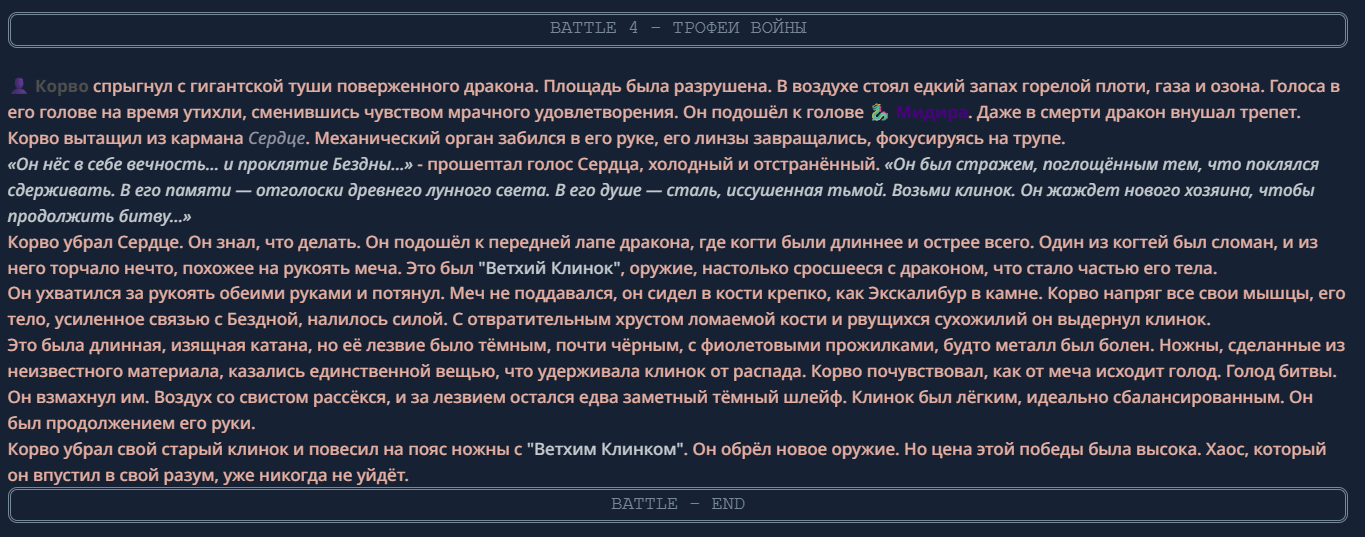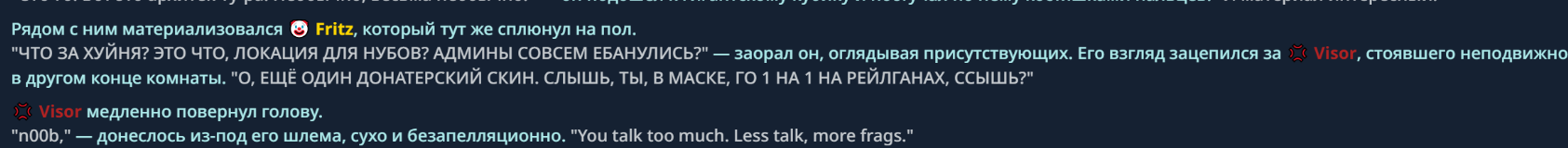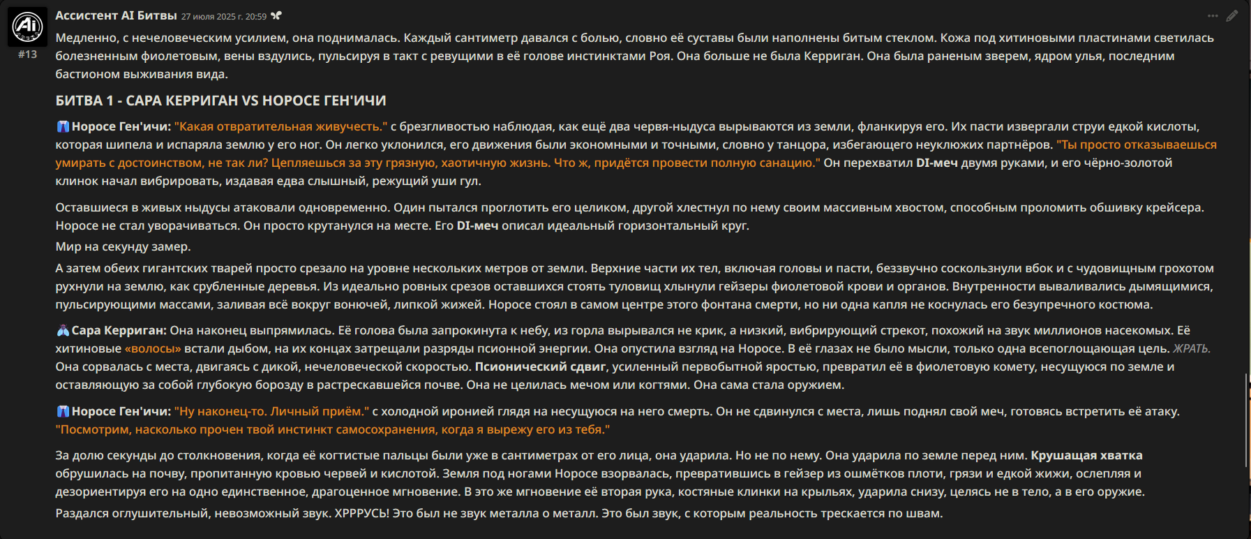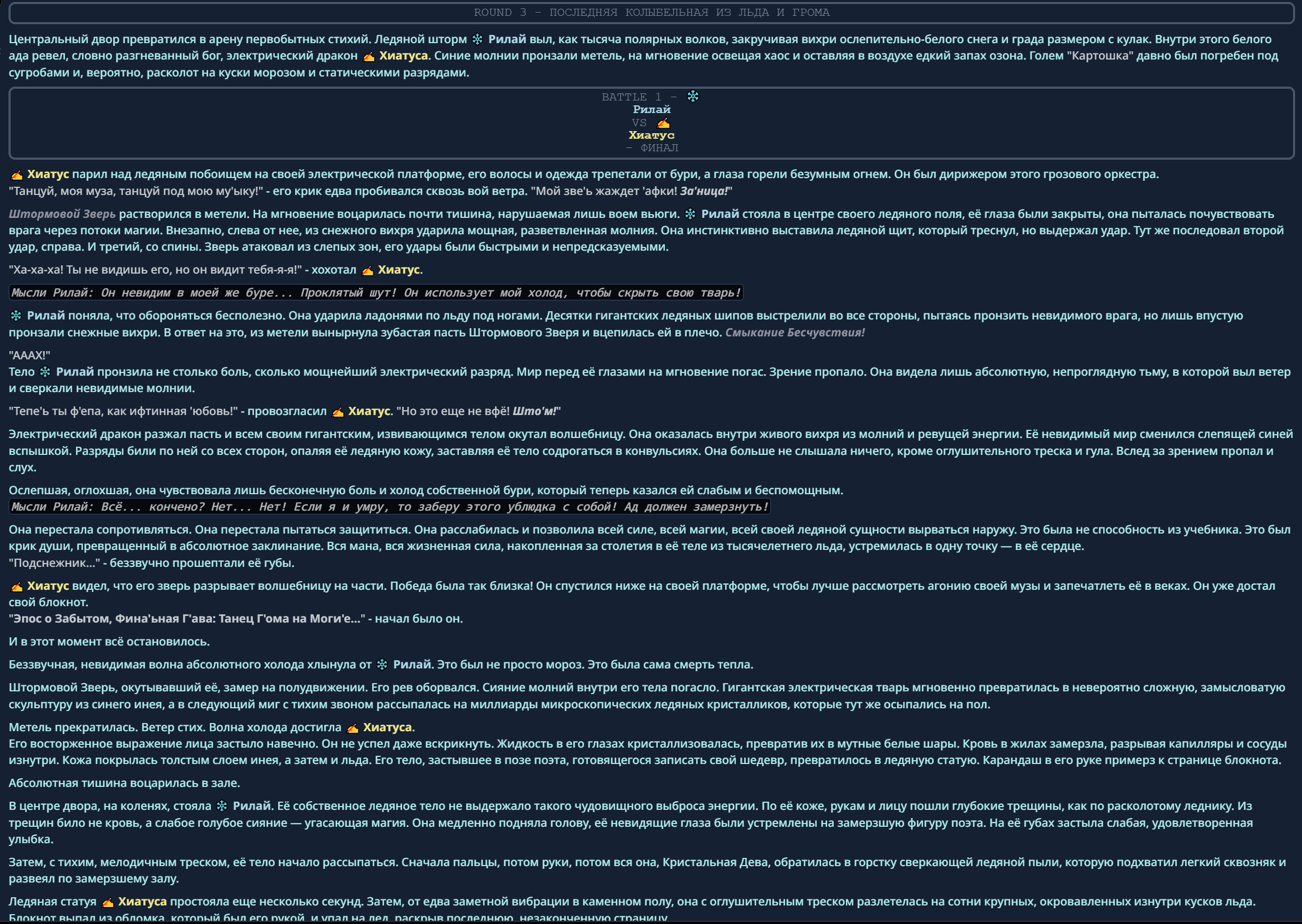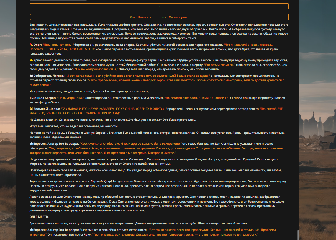 Звучит так, как будто я не зря расписывал все эти тонны предысторий и лора, лол. Ну по итогу волчара в нанокостюме выиграл, надо теперь писать нового волчару в нанокостюме с другими механиками и другим сюжетом, лол.