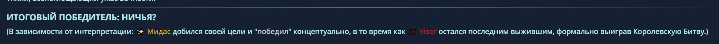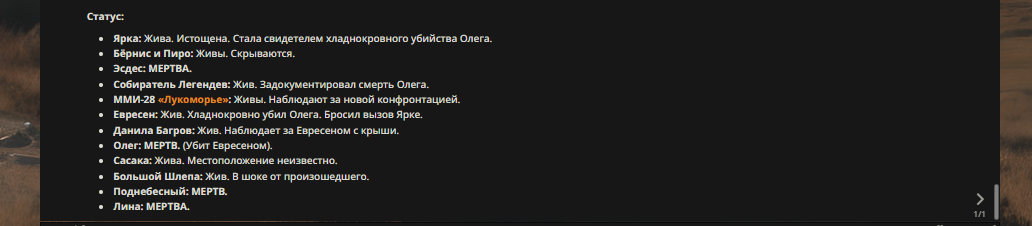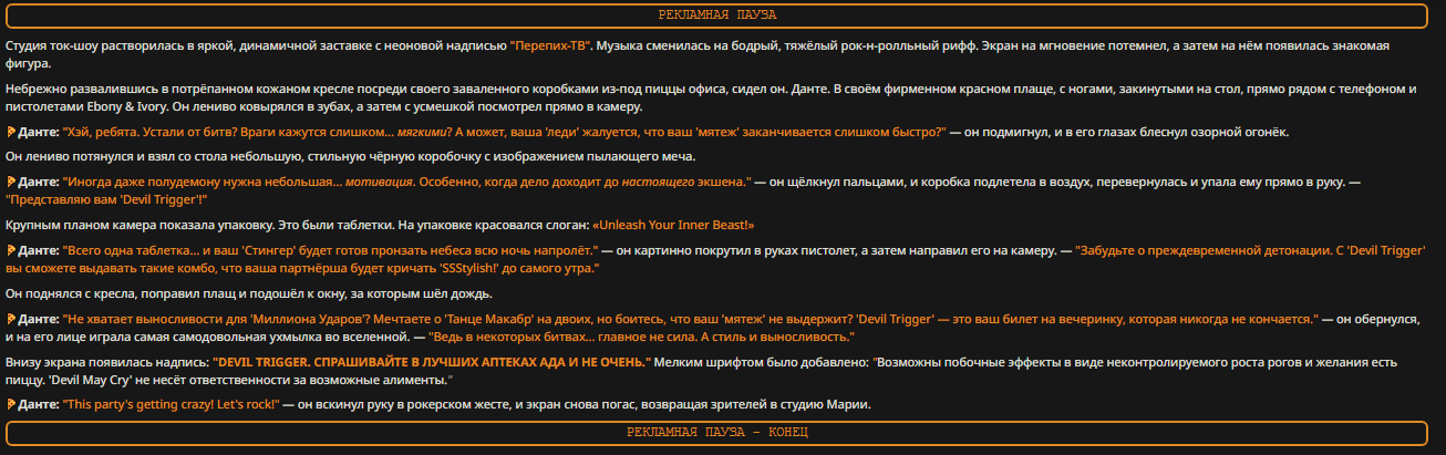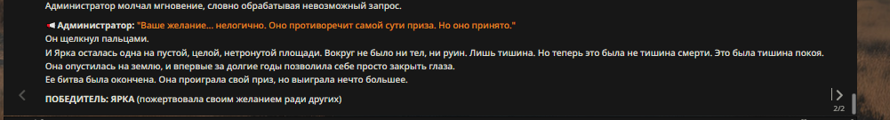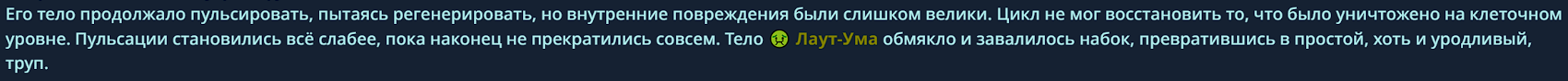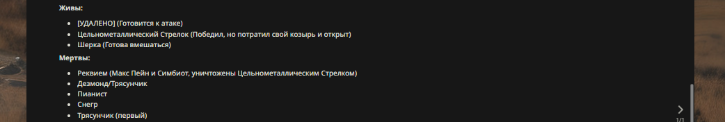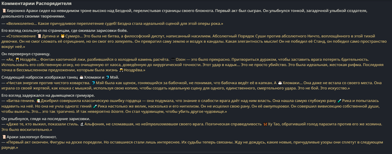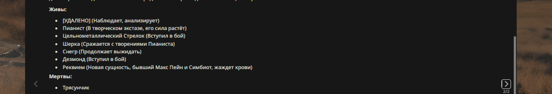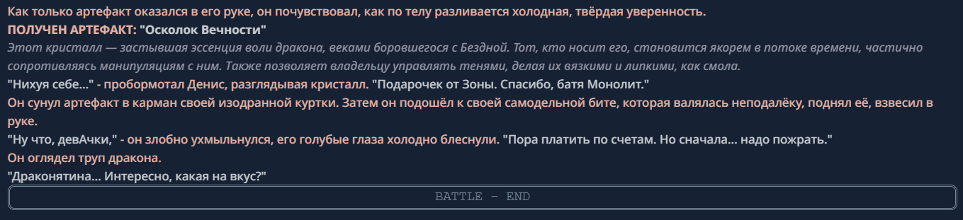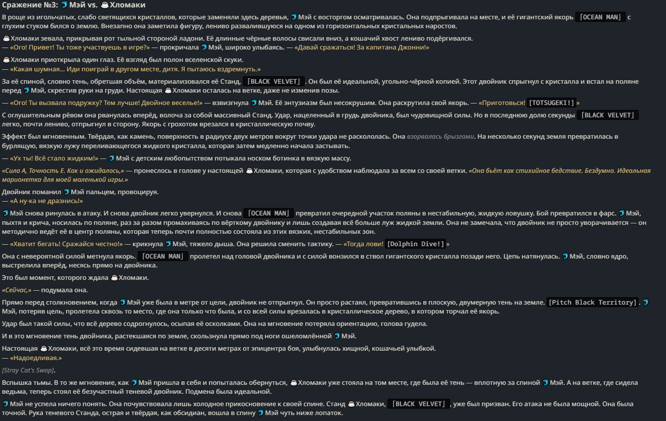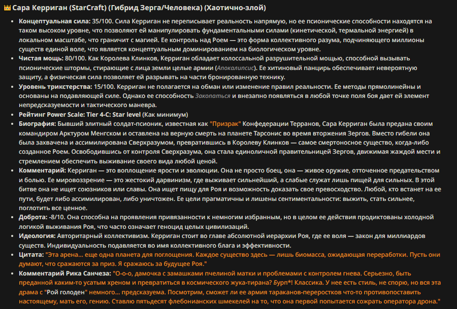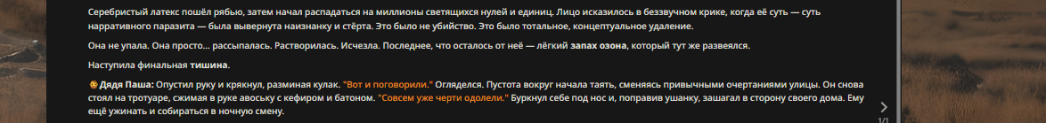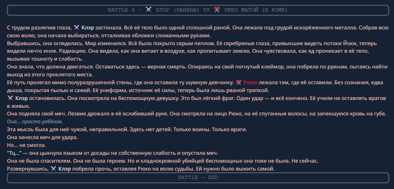 Звучит так, как будто я не зря расписывал все эти тонны предысторий и лора, лол. Ну по итогу волчара в нанокостюме выиграл, надо теперь писать нового волчару в нанокостюме с другими механиками и другим сюжетом, лол.