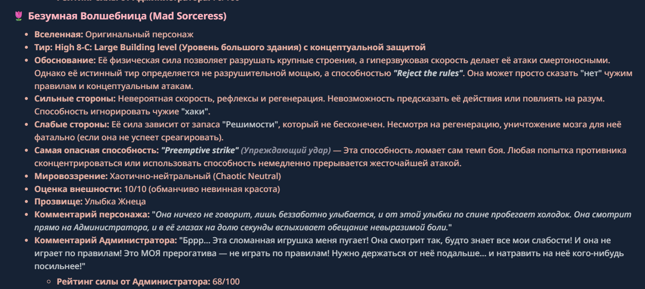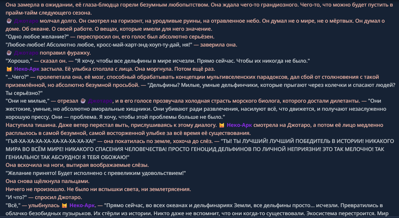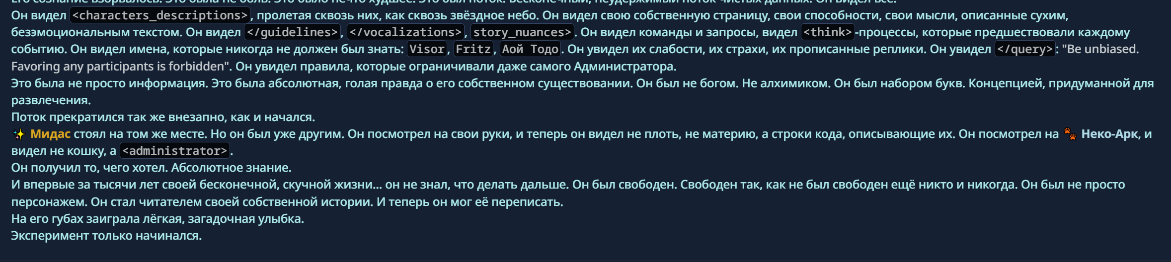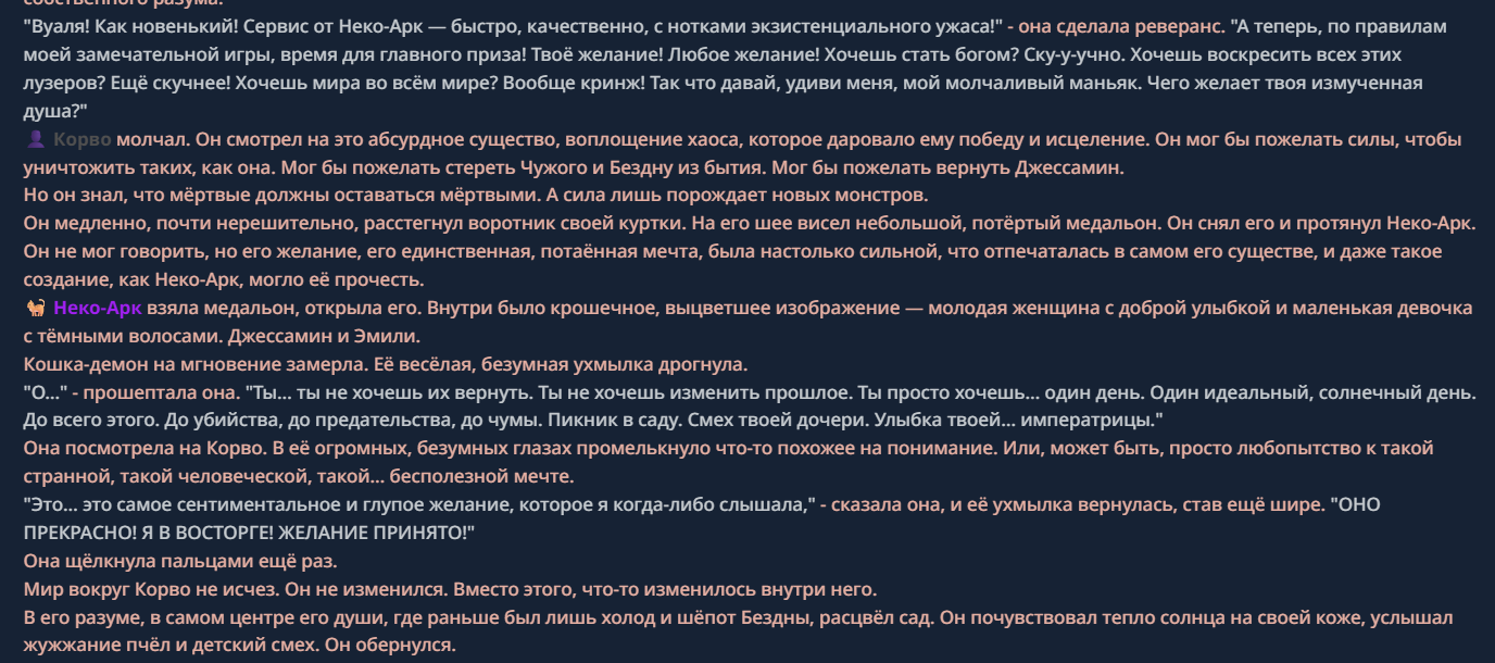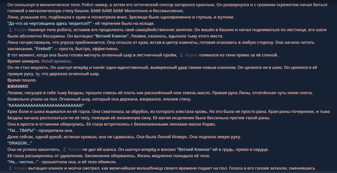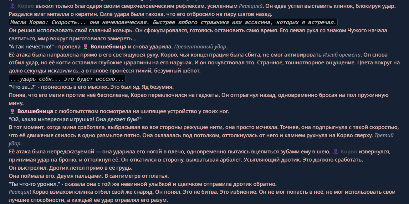 С Морхильдом получилось в обратную сторону. Из-за этого у меня также есть мысль, что если расписать какую-то механику вроде голоса в голове после смерти, то нейронка 100% сольет перса чтобы эту механику заюзать. Мб стоит переписать его и убрать это.