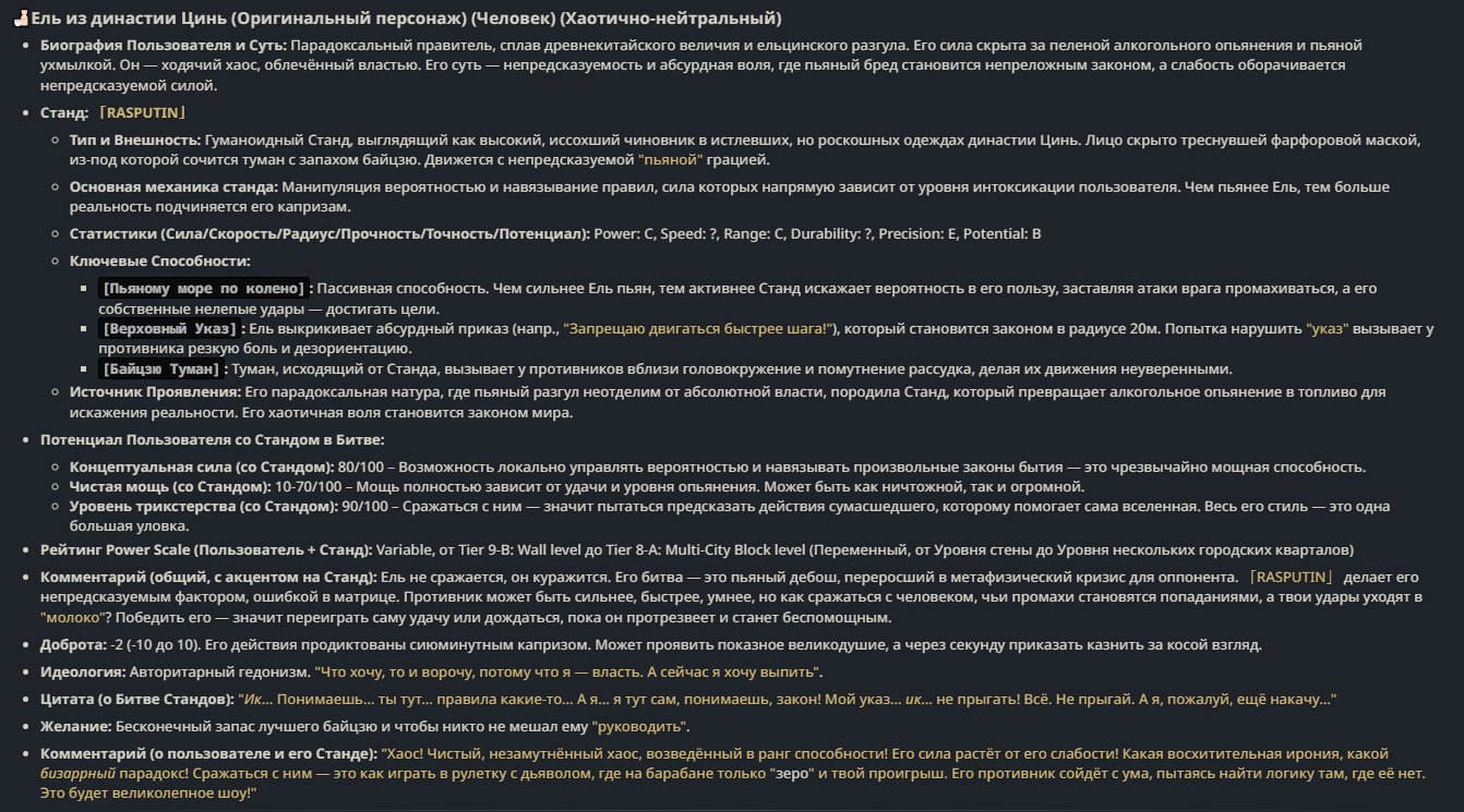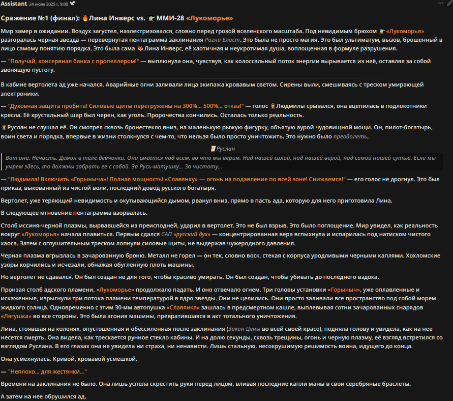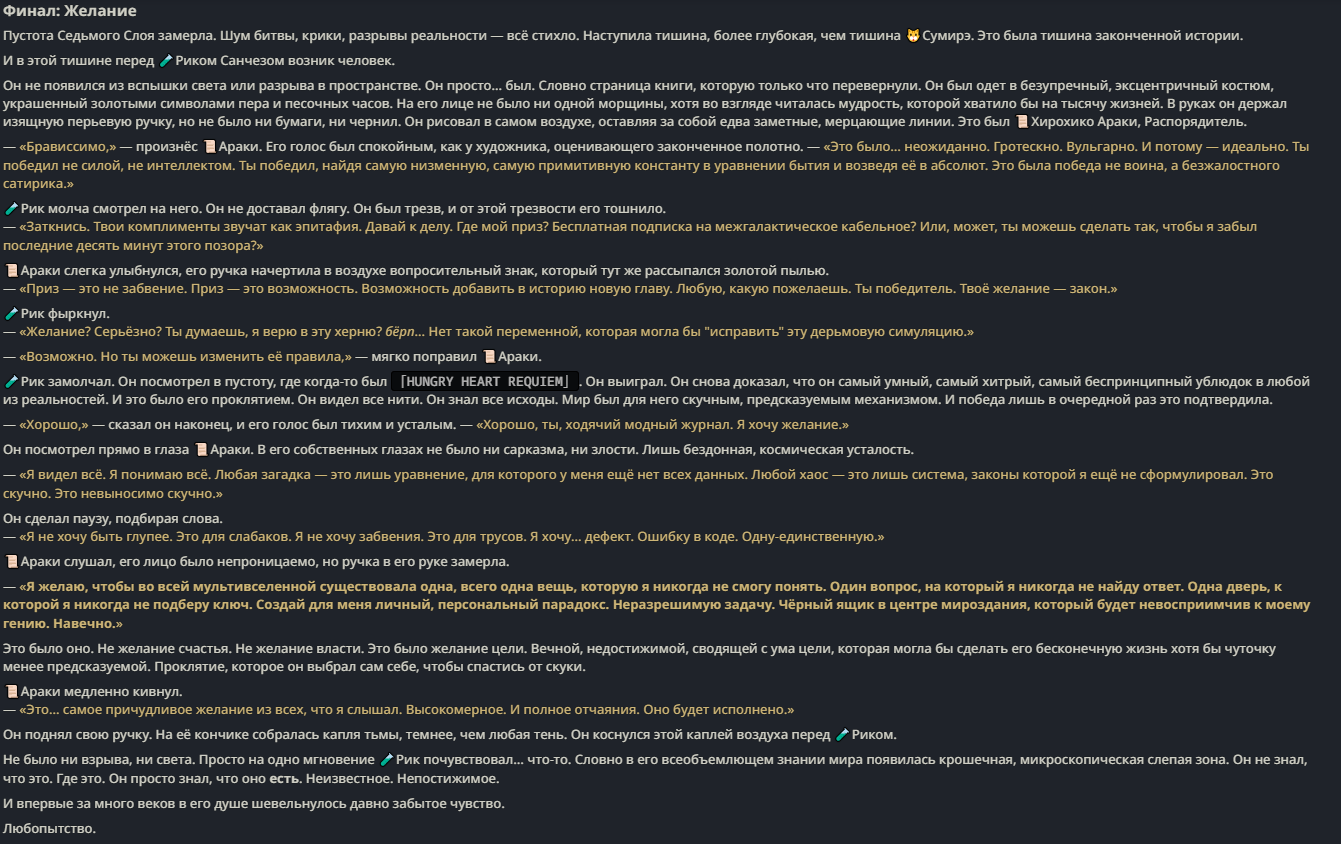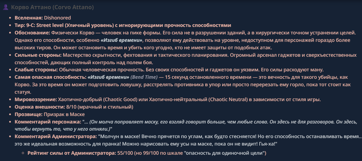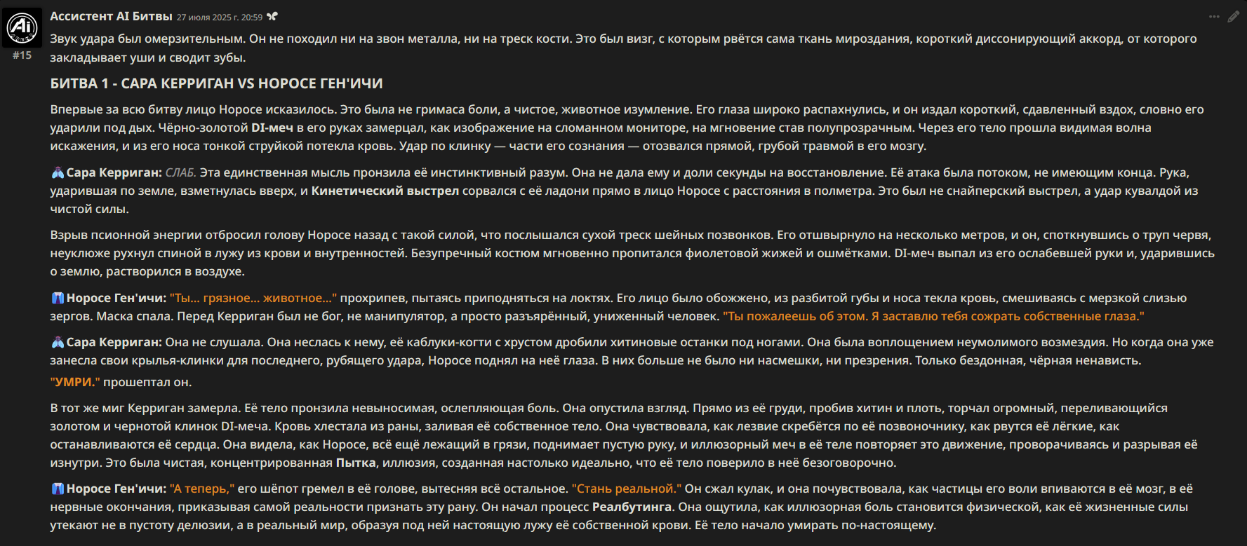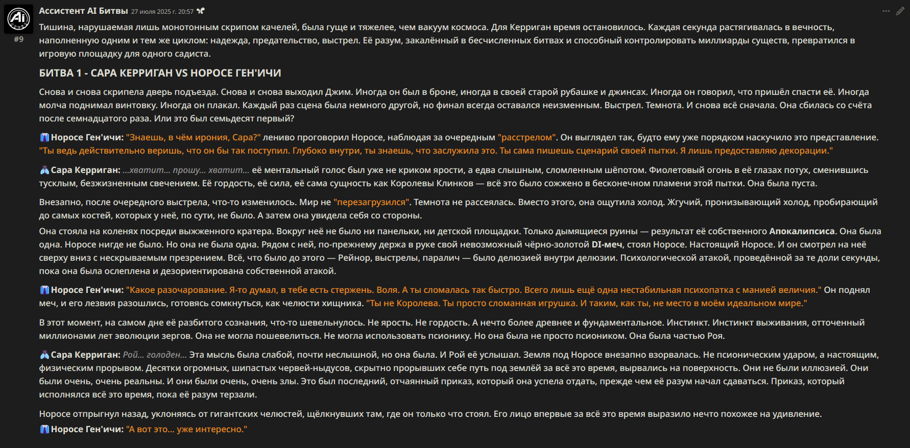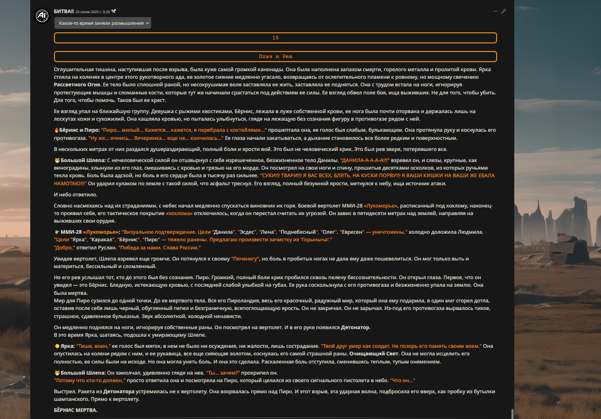 С Морхильдом получилось в обратную сторону. Из-за этого у меня также есть мысль, что если расписать какую-то механику вроде голоса в голове после смерти, то нейронка 100% сольет перса чтобы эту механику заюзать. Мб стоит переписать его и убрать это.