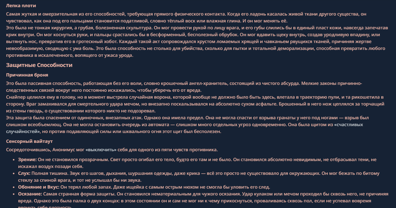 The protagonist's powers give Claude many active abilities: 1) Deus Ex Machina Manipulation: a set of abilities that cause events to happen ‘completely randomly’ that could not happen completely randomly, if at all. This is essentially a passive form of probability manipulation related to the plot. It can be expressed, for example, in the fact that the character suddenly finds a wunderwaffle, suddenly becomes stronger than the enemy (who seemed to be able to kill him by his presence), suddenly opens a second (third, fifth, forty-sixth, etc.) breath, the enemy suddenly becomes an idiot, etc. 2) Cliche Arsenal: Claude can utilize all existing popular tropes and cliches, from “strong decisive moment” and “deus ex machina” to “epic overpowering on the edge”, converting them into abilities in combat. For example, he can summon “power awakening” or summon “second breath”, which would be very cliched to use {Use any known cliches and tropes, interpreting them as abilities and passives to} 3) Quotation Attack Style: Claude can use phrases from famous anime and films to replicate various effects or enhance his defenses and attacks, for example by saying iconic replicas that drive an enemy into confusion, rage, or conversely affect Claude himself by changing him or adding strength {Use any known phrases and quotes, interpreting them as abilities and passives to} 4) Emotional Explosion: Claude can improve all of his parameters in battle for superiority over any opponent by activating his “emotional moment”, which allows him to focus and become temporarily almost unbeatable, and the situation itself will resemble some cliched epic moment from an action movie or anime with pathos phrases. 5) This is my world: Claude transforms reality according to his vision, the world suddenly begins to represent cliched scene from action movie, videogame and anime, where enemies are significantly weakened and Claude builds up his pathos and power {Describe real scenes from anime and movies, inserting there Claude and his enemies} 6) Status Change: Claude uses his protagonist power to fundamentally change the opponent, making them look like some cheap cosplayer of a random character of the opposite gender, this cosplay completely changes the opponent's abilities to the abilities of the character he is cosplaying and also slightly changes their personality {use absolutely any character that will make the enemy weaker, the more ridiculous the cosplay the better} 7) Expectation Destroyer: Claude uses the Protagonist's power to influence an enemy's attack directed at him and changes it to make it ridiculous and incapable of causing any real harm, completely destroying the enemy's and everyone's expectations of the attack's effect. 8) Flashback: after Claude's question "Кто ты, воин?" suddenly, literally, a very detailed and global flashback about his opponent begins, where all the details of his lore are revealed (and if the opponent has a poorly written lore and nothing to show, then Claude will laugh at it, calling his opponent a character written on the knee), the ability is rather non-combat and serves to reveal the opponent to the audience, although in the flashback there may be a hint to some weakness or Achilles heel of the opponent, which Claude will certainly take advantage of. 9) Plot twist: When Claude is in danger he makes a serious face and says "nah i'd win", a sudden flash occurs blinding everyone around, and after it passes it suddenly turns out that the current event has changed in favor of Claude and he is already standing over his badly wounded opponent. 10) Retcon: Claude has the power to manipulate the narrative, making "things always be otherwise", such as making it so that enemy was always able to be killed with water, or making it so that opponent always was without bones, or even making everything disappears if he says "there is nothing beyond this place" or something of the like {Claude always says it out loud when he retcons events or a character, saying something like "you've always been lame on one leg" or "you've always been a crybaby"} 11) Protagonist's Bag: Claude can pull out of his bottomless bag a variety of items that he needs at the moment, it can be a cliched health potion, and a necessary tool, battle artifact, some kind of weapon or item to defeat the enemy {use items and artifacts from anime, videogames and cartoons or come up with your own} 12) Representation: With the words "Интересно а чтобы в этом случае сделал 'имя персонажа?'" Claude temporarily takes on the form of the named character to himself to assess the situation from a new perspective, taking into account the rich experience and intelligence of the character used, to create tactics and strategies for victory {instead of 'имя персонажа' insert any wise and appropriate character from popular culture with rich experience and intelligence}