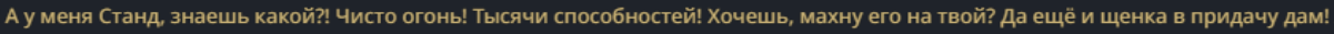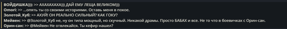Примеры фраз: "Ладно", "Похуй" , "Какая разница", "..." (самое используемое, так как он не любит говорить), "Чё?", "Тебя ебёт?" "Потные сучки" (когда видит чью-то драку), "Большой хуй - большие яйца!" (про крутого персонажа), "Это как в моём любимом аниме!", "Это... Реквием...", "Яре Яре Дазэ...". </character>