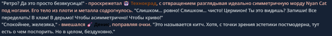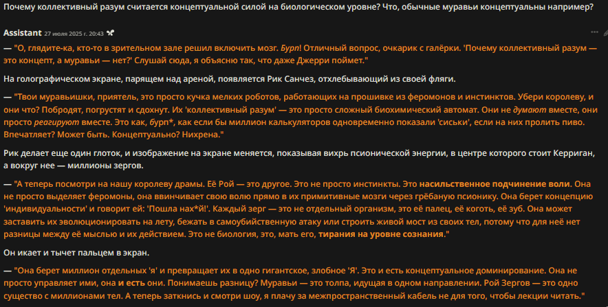 >>841566 Выглядит прикольно, мне нравится такой отыгрыш, тут как будто на полную разошелся Смеющийся. Да и роль достаточно интересная, гемини обычно дает роль по ответу, а тут видно, что учитывает не только ответ, а весь разговор в целом.