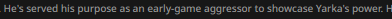 >>841589 Так я тоже обычно тесты провожу в дуэльках, там у него отыгрыш совсем другой, он более пассивный и геминька часто старается его продавить на слом философии. Аля - "Но впервые за тысячелетия он встретил кого-то выходящего за пределы его непоколебимой философии!!!"