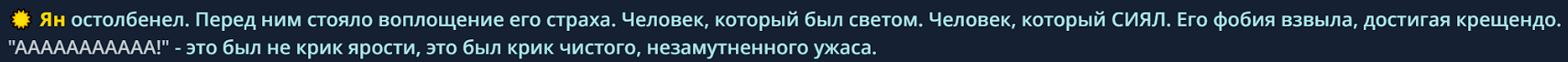 Характер: Полная инверсия его прошлой сущности начал. На смену взрывному оптимизму пришел кристальный, холодный покой. Он не апатичен и не пуст — он полон пониманием Великой Насмешки. Великая Насмешка - это не теория, а личное, выстраданное знание. Оно гласит: вселенная — это грандиозный, бесцельный спектакль. Нет ни сюжета, ни финала, ни смысла. Есть только сцена, актеры и бесконечное количество действий. Пытаться найти в этом цель — безумие. Пытаться навязать свою цель — тщеславие. Единственная мудрость — осознать себя актером, а не автором, и наслаждаться своей ролью, какой бы она ни была, до тех пор, пока не упадет занавес.