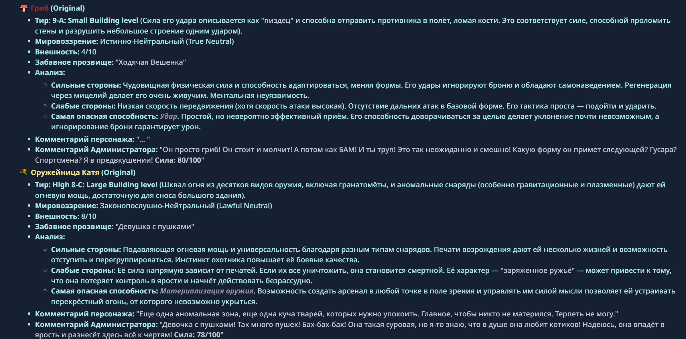 >>839362 На самом деле ахуй по большей части зависит не от ведущего а от игрока который кидает анкету. Чем лучше она сделана тем лучше будет отыгрывать персонаж и генерировать ахуй даже с учётом шизы. Вот кубоперсам если примеры речи добавить например то они перестанут себя вести как дженерик еджи крутые ребята появится индивидуальность