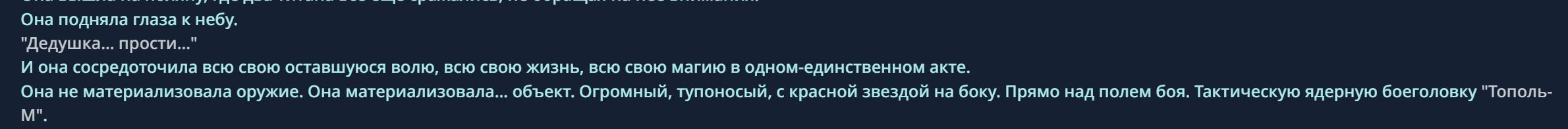 Боеголовка «кузькина мать»: Самое мощное вооружение вертолета. Это одна тактическая ядерная баллистическая ракета. Она управляема магией, имеет вокруг себя мощные магические и силовые щиты. Сила взрыва эквивалента легендарной царь бомбы. Только вот кроме обычного радиационного излучения, бомба бьет мощнейшим зарядом антимагии, что отключает магические способности врагов в радиусе 10 километров. Дальность пуска ракеты – 30 километров.