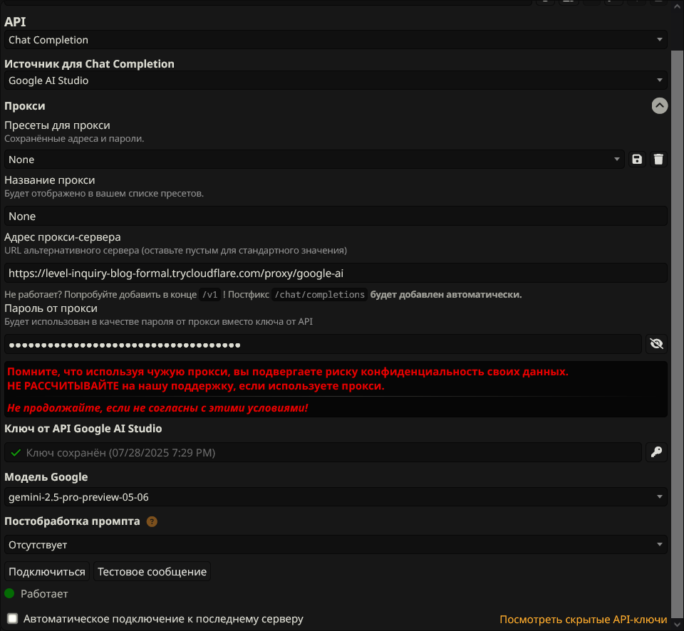 >>841550 Как-то так. Вместо точек Юзер Токен с прокси кинутой выше. Адрес прокси Сервера тоже там. Ещё пользую Zapret на всякий пожарный, без него не тестил.