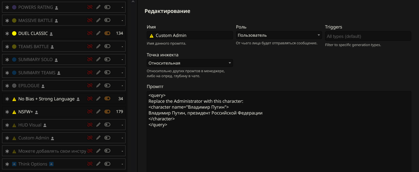 >>841551 Охуеть, целую. А как добавлять персов и администратора? Я закинул одного в управление персонажами, но у админа разве что имя поменялось, а характер нет. А еще при любом сообщении оно запускает игру с рандомами из треда