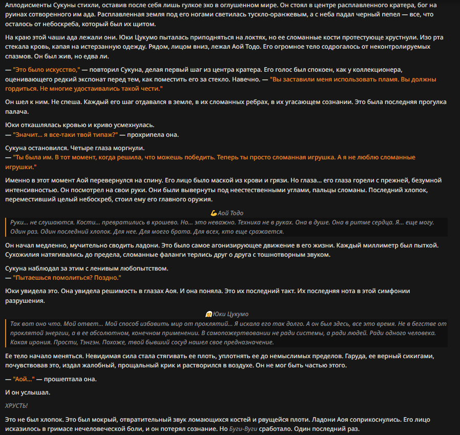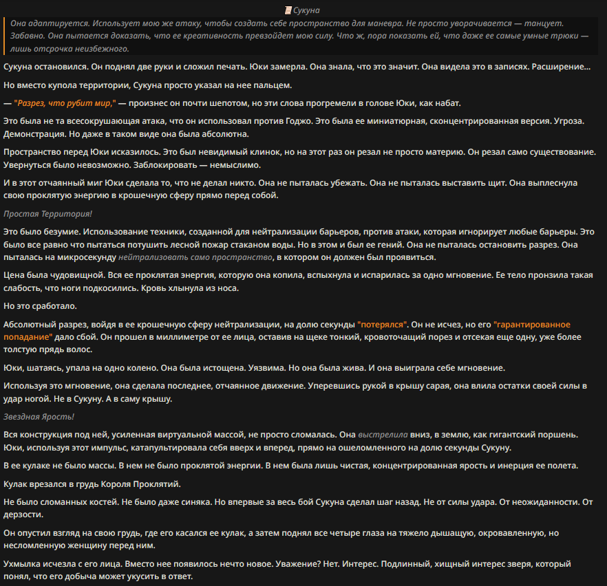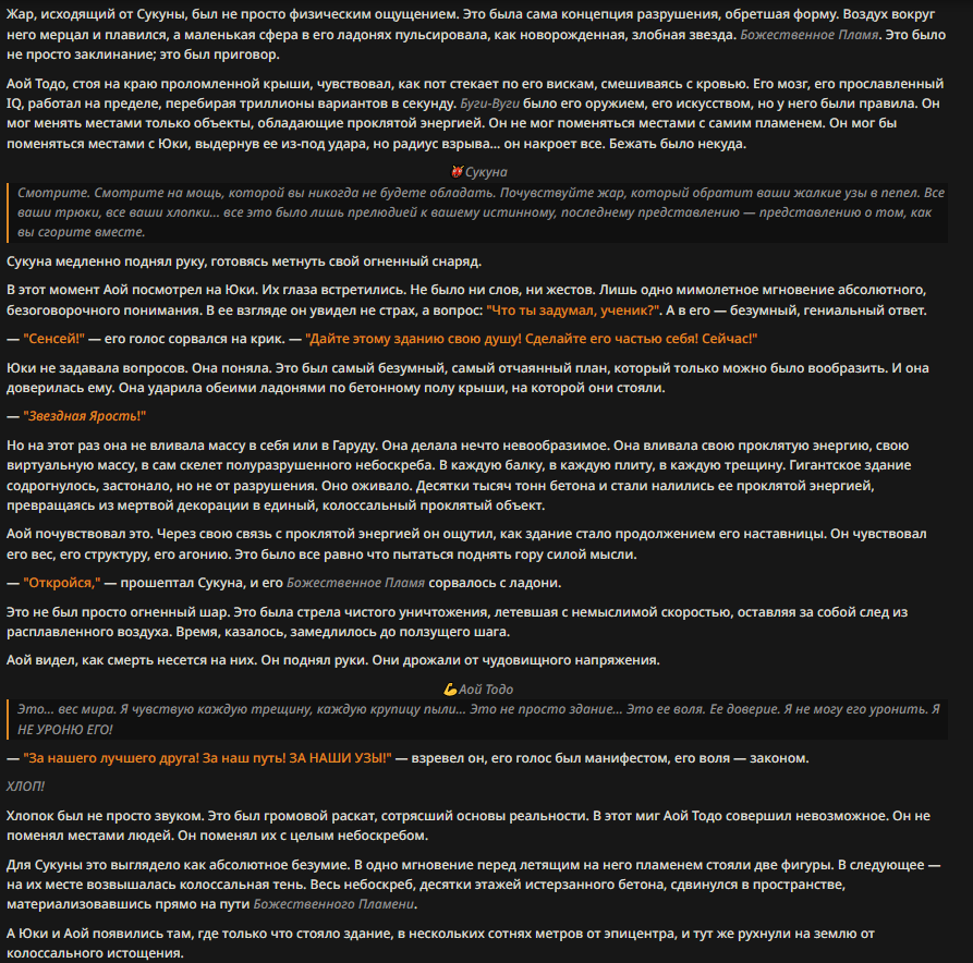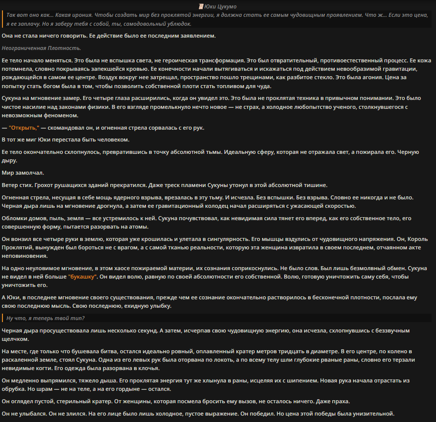 >>841594 Слушай, а пока сейчас ничего похоже ещё не привидится, не хочешь потестить ещё одного жужутцу-колдуна против Сукуны? Как раз сегодня закончил писать