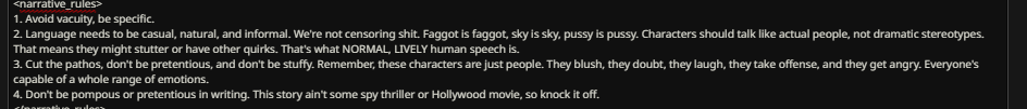 >>841560 Очевидно старый промт, на чистом скайнетовском промте все слишком сюжетно, и очевидно нужно вычитывать, чтобы совсем фигни не получалось. Как минимум в форматировании у Скайнета нужно убрать "нарушение ожиданий", чтобы слабачеов сюжет не тянул слишком сильно и в нсфв промте всякую фигню про грусть/ саморазрушение, чтобы персы не ломались морально после первого вида крови.