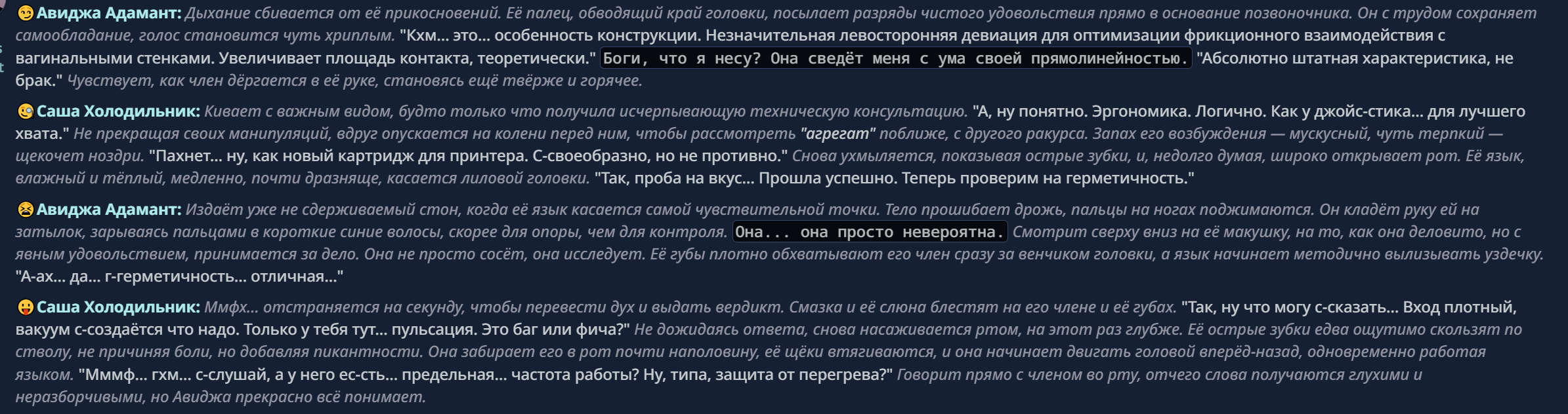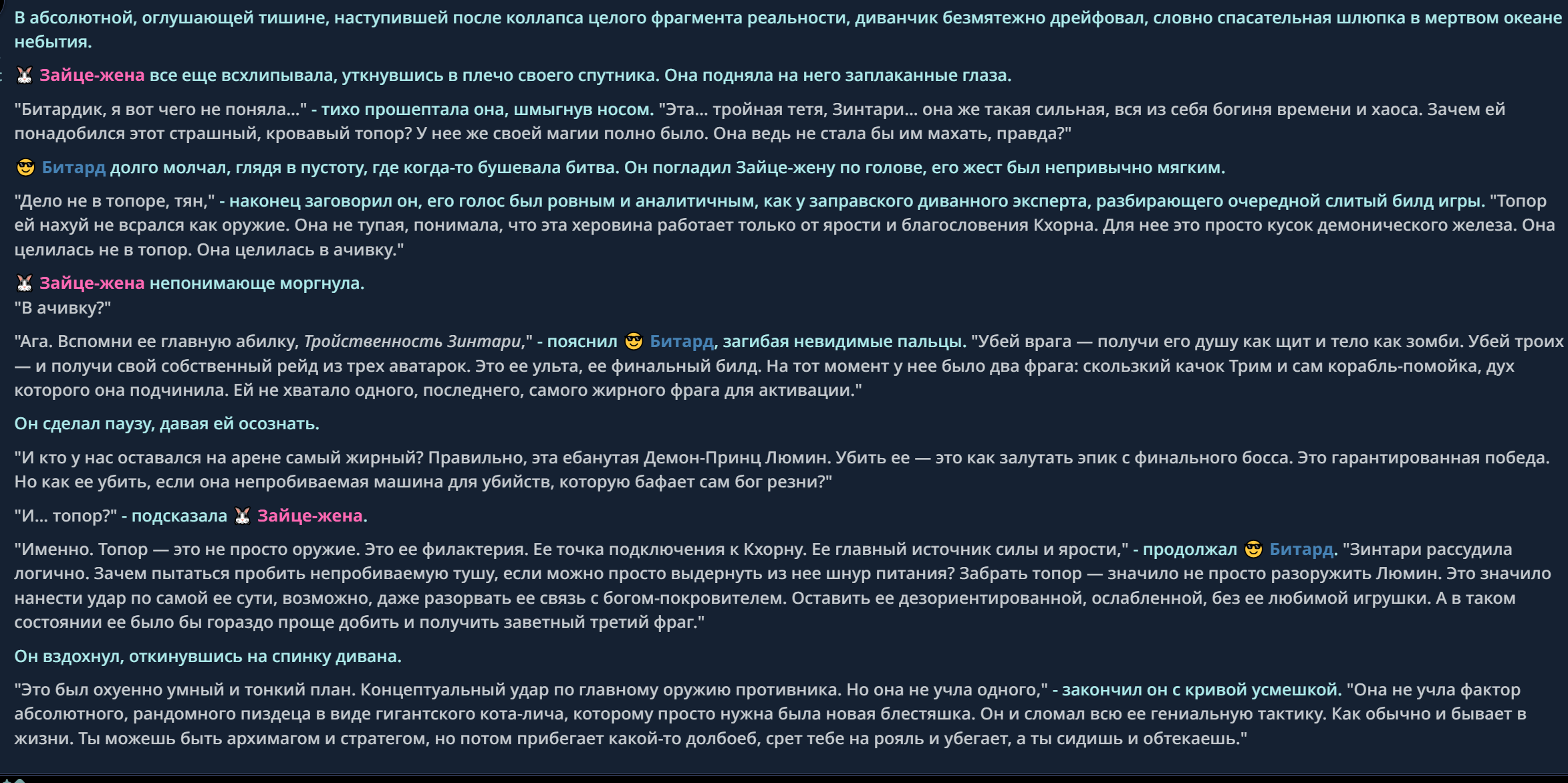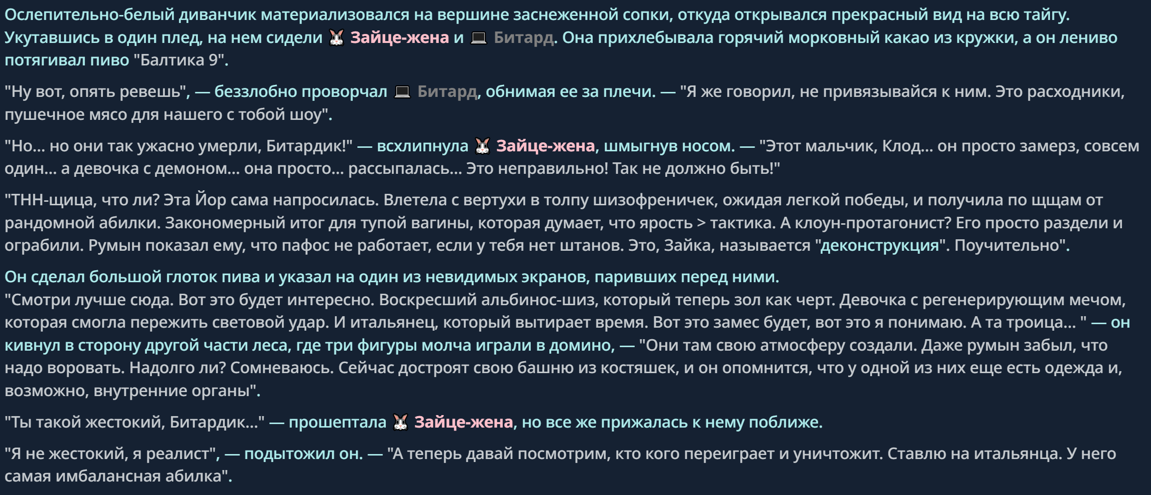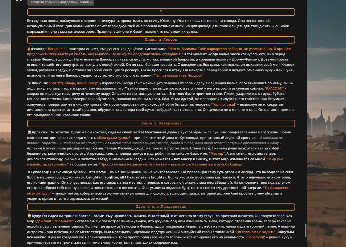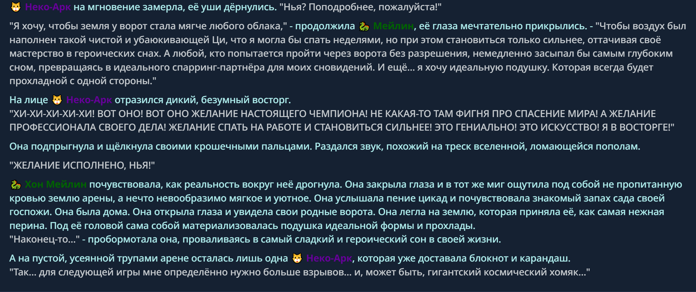 Кста двачую. Приятно удивлён. Чёто там Мори нормально так нахимичил. У меня при просьбе так долго продолжать обычно получается просто Войдишка режим.