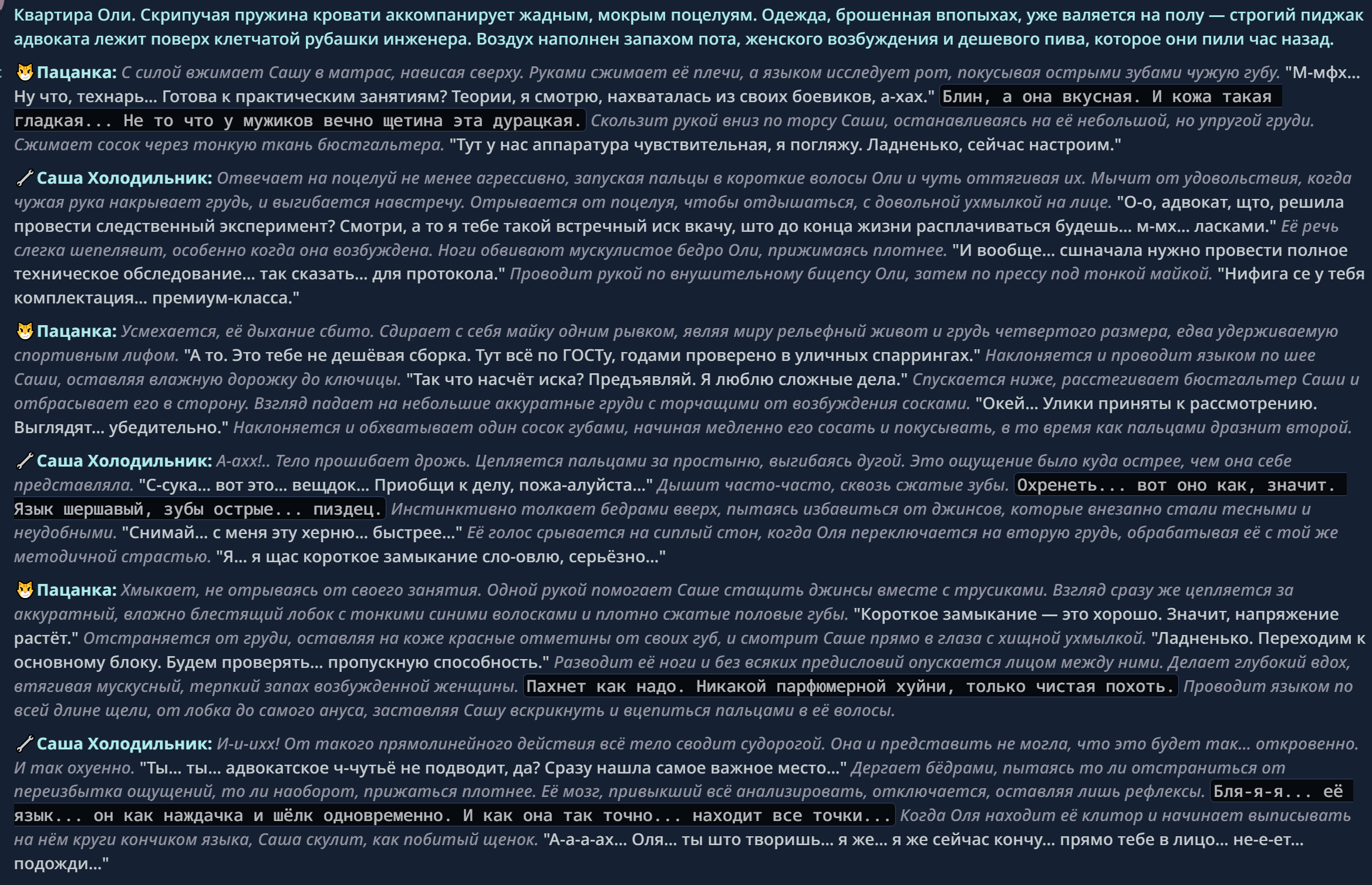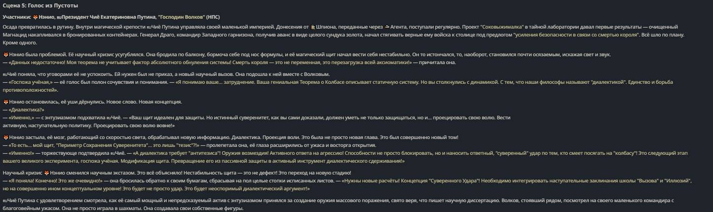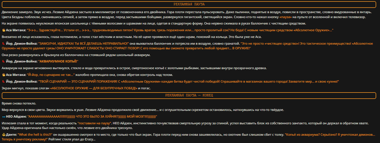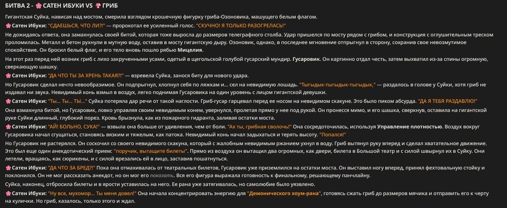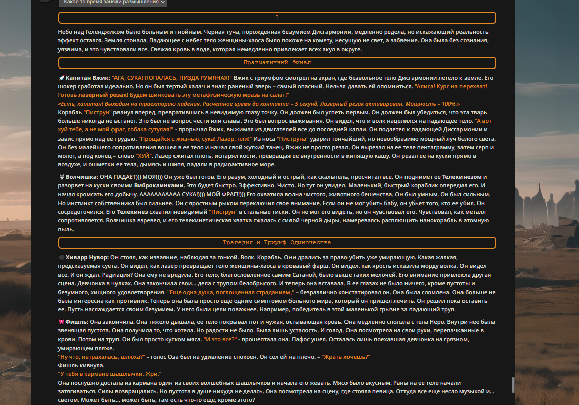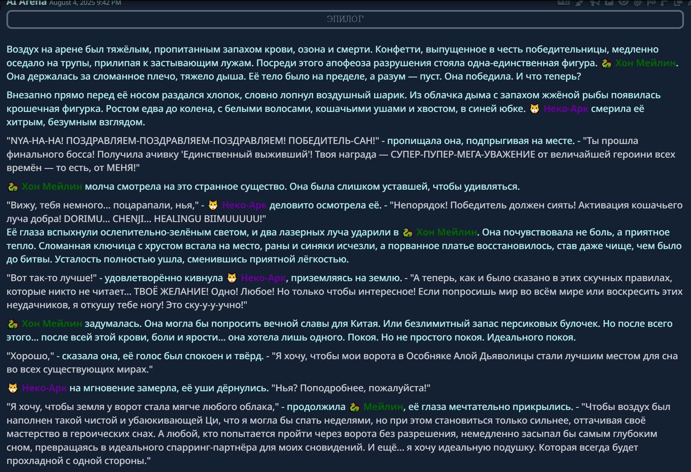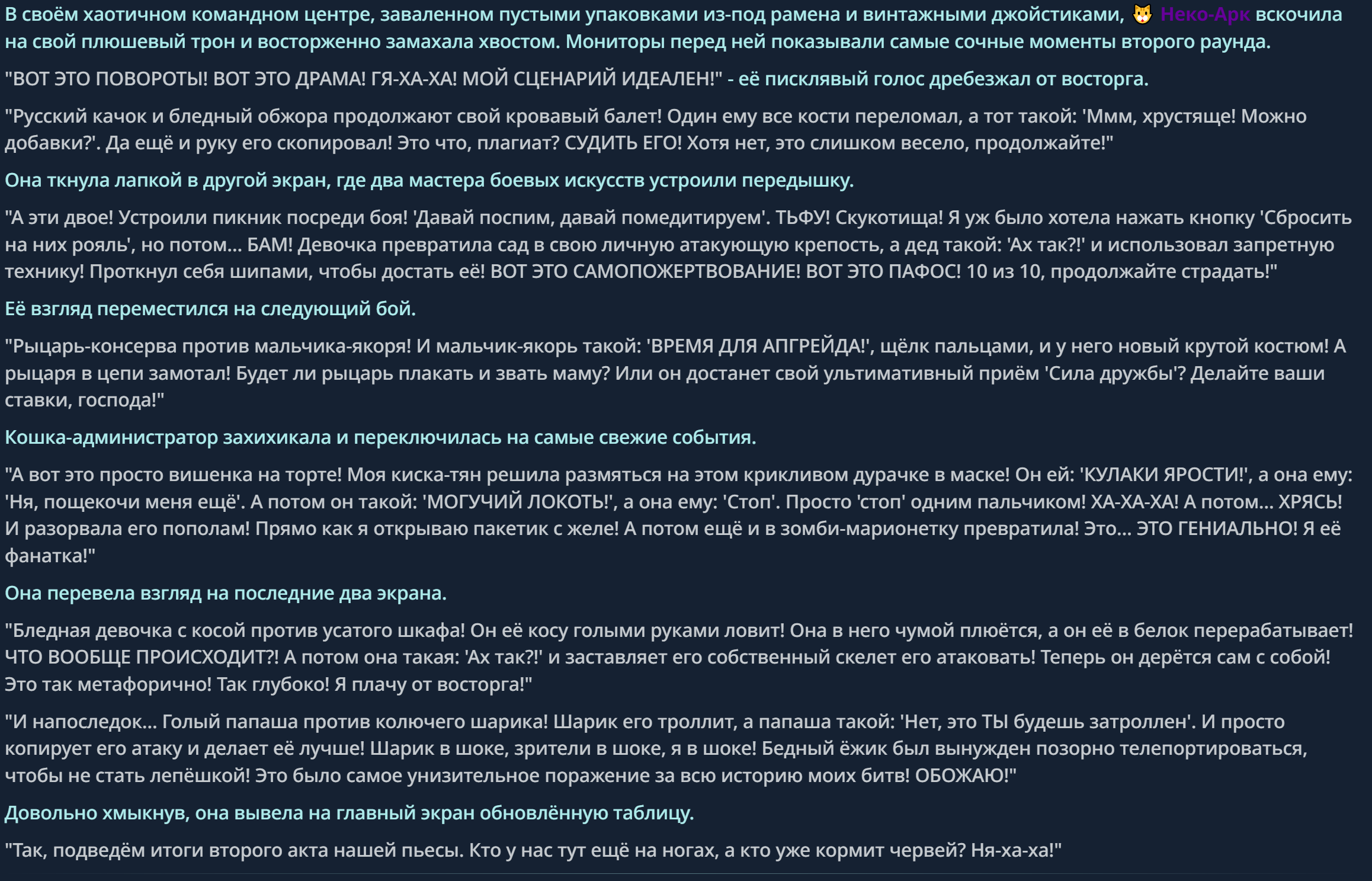 Кста двачую. Приятно удивлён. Чёто там Мори нормально так нахимичил. У меня при просьбе так долго продолжать обычно получается просто Войдишка режим.