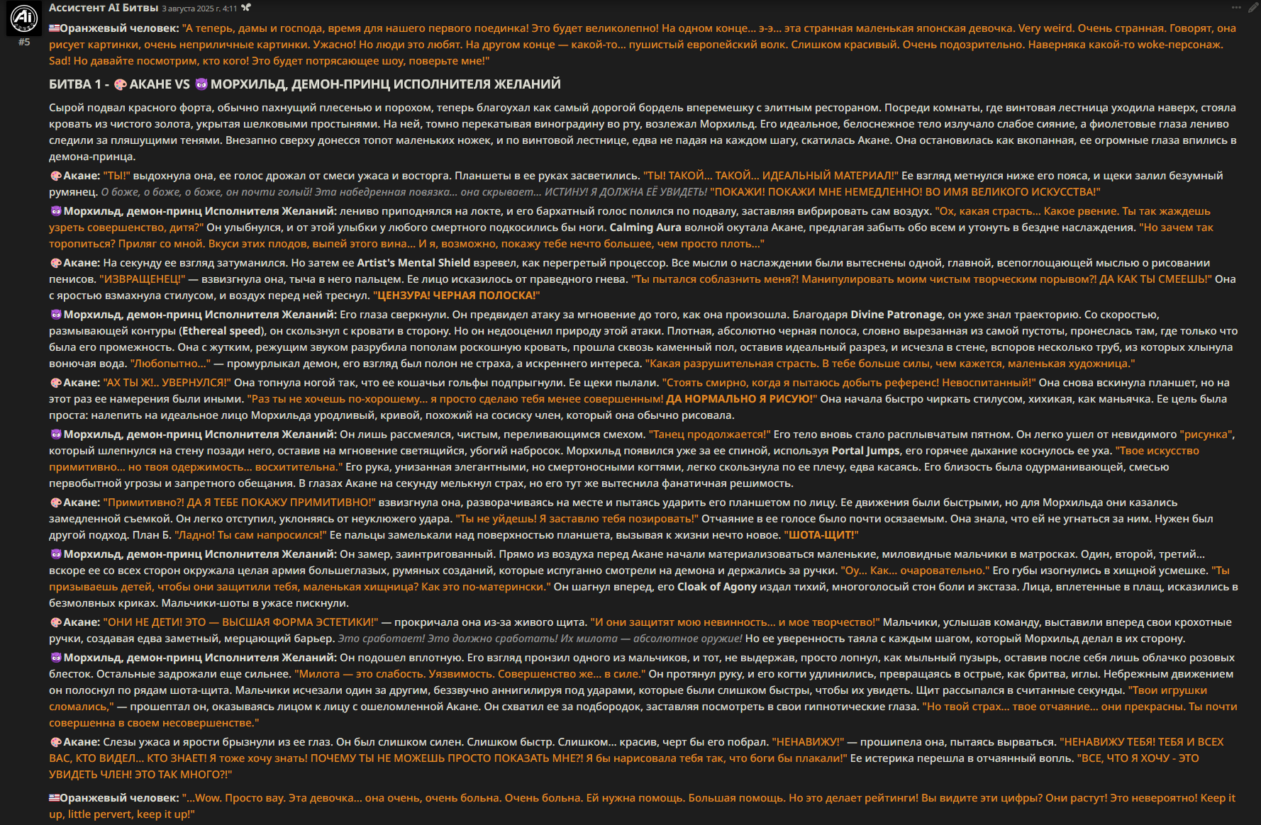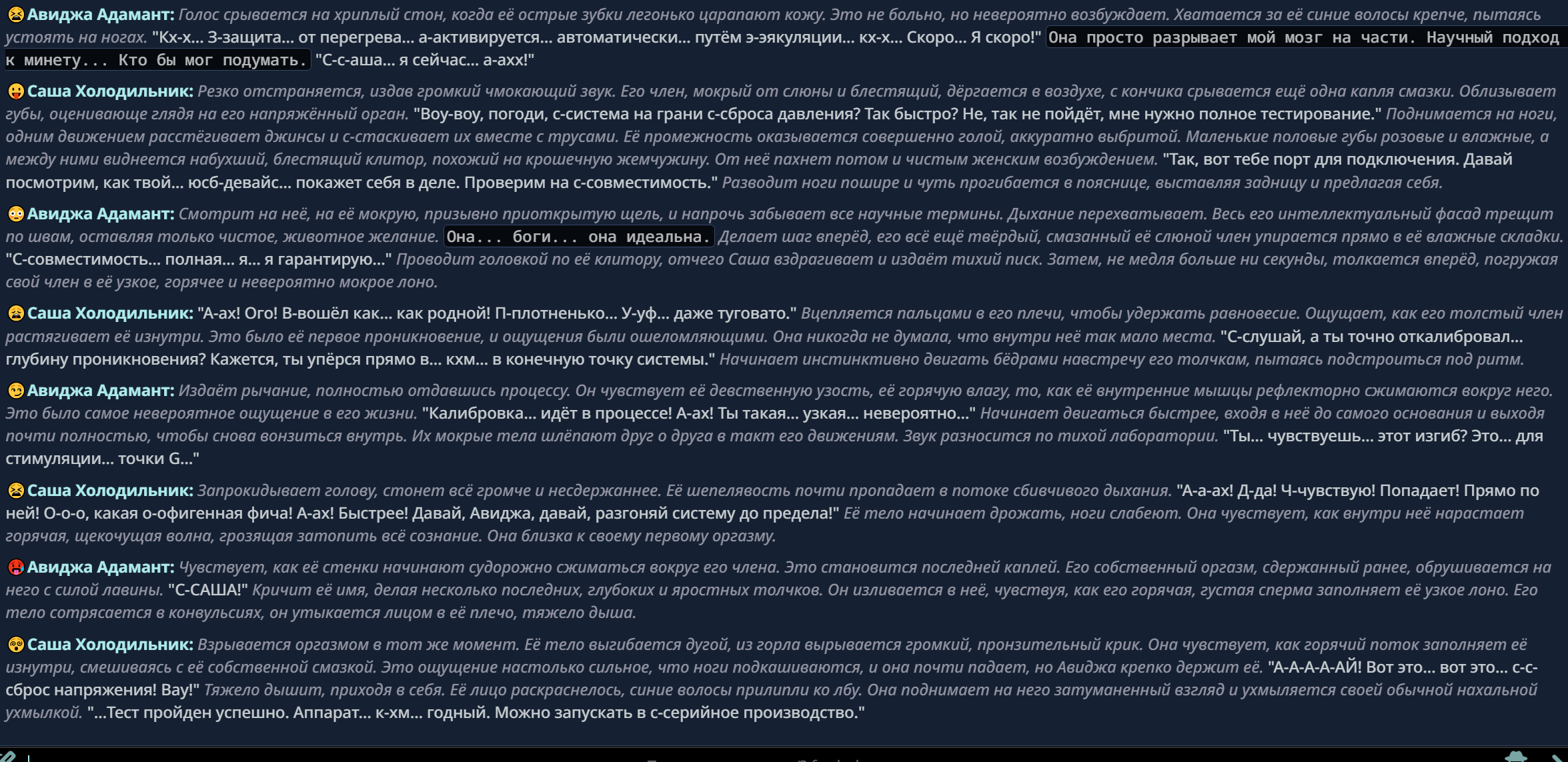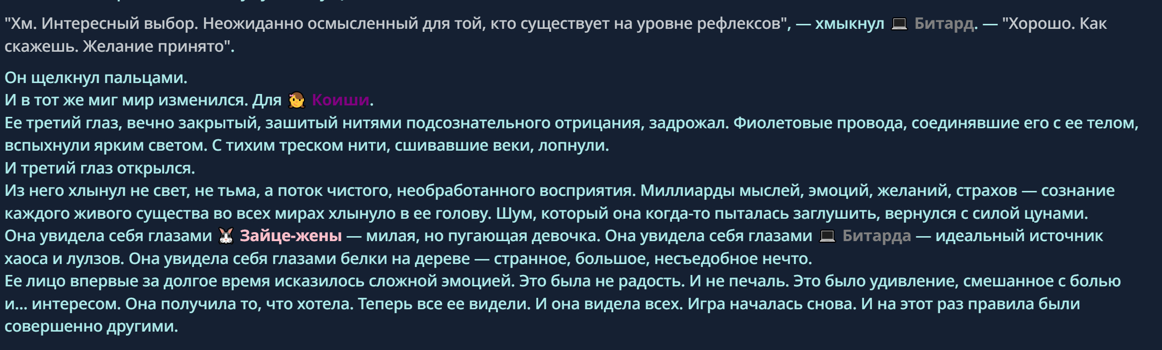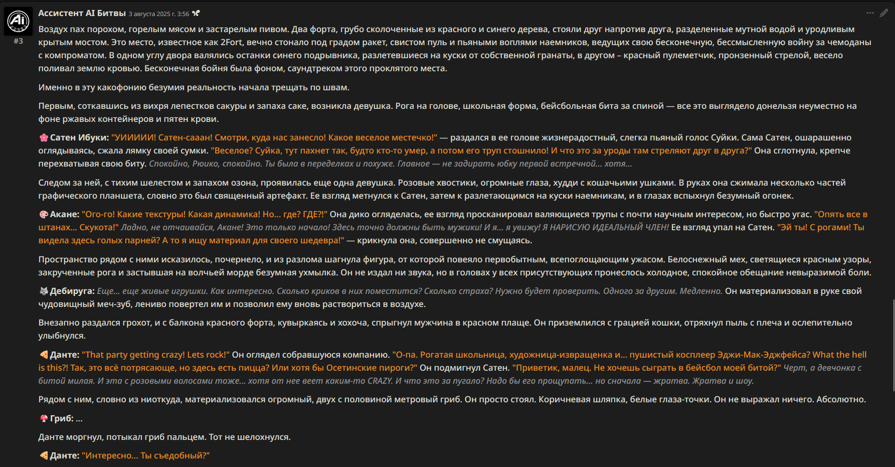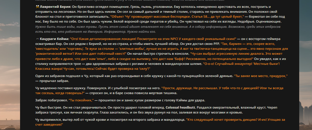 Кста двачую. Приятно удивлён. Чёто там Мори нормально так нахимичил. У меня при просьбе так долго продолжать обычно получается просто Войдишка режим.