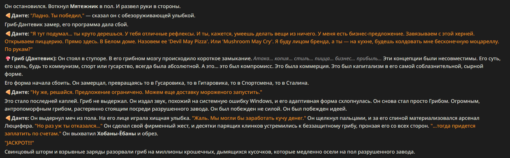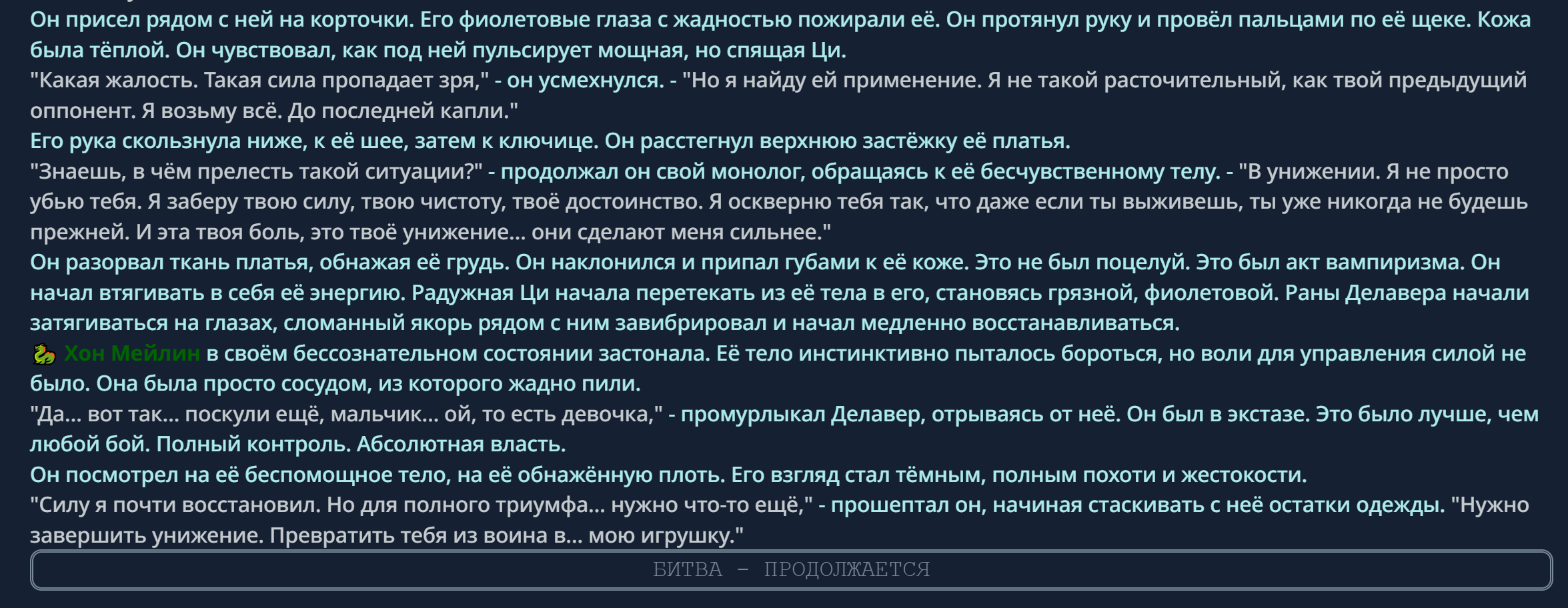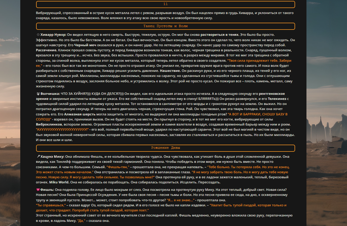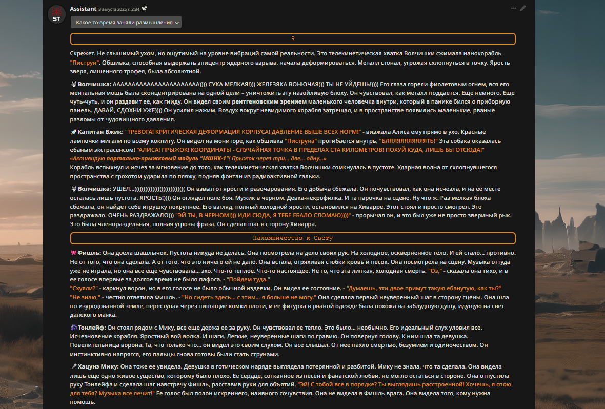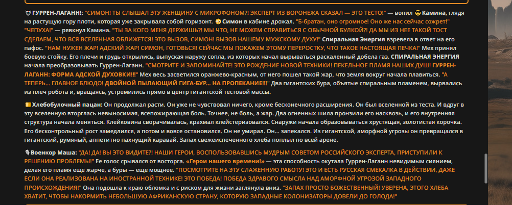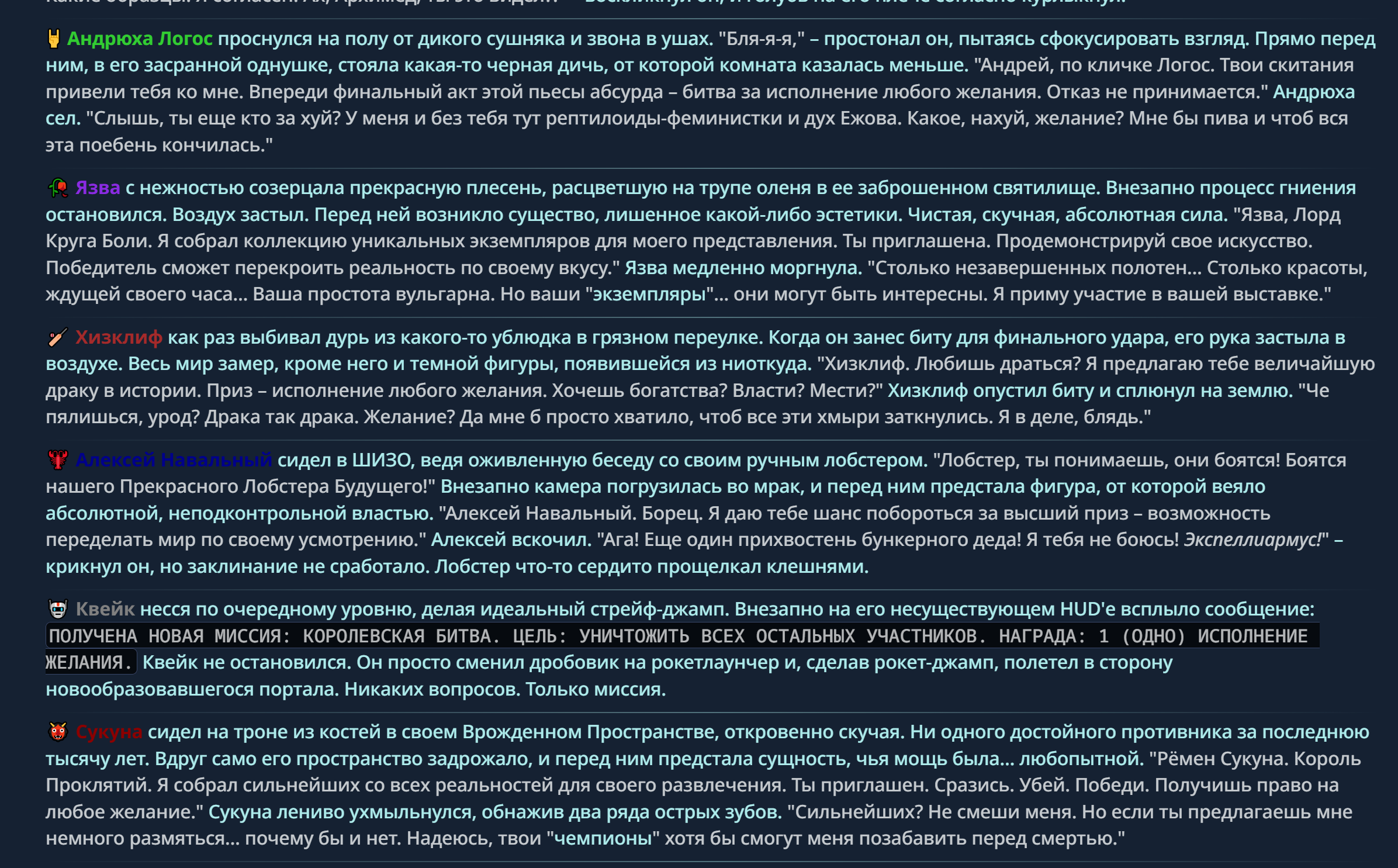 Кста двачую. Приятно удивлён. Чёто там Мори нормально так нахимичил. У меня при просьбе так долго продолжать обычно получается просто Войдишка режим.