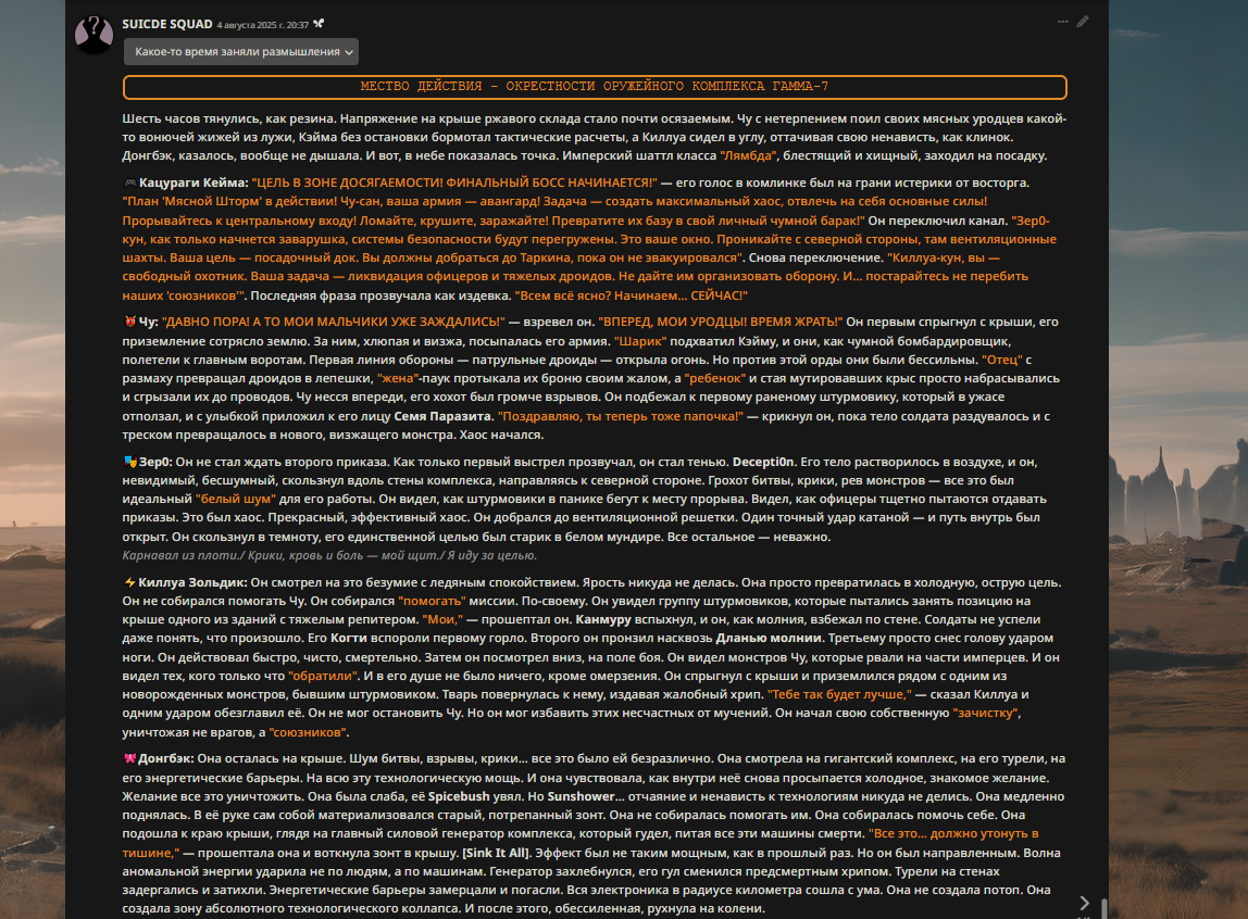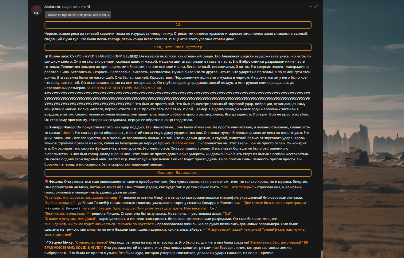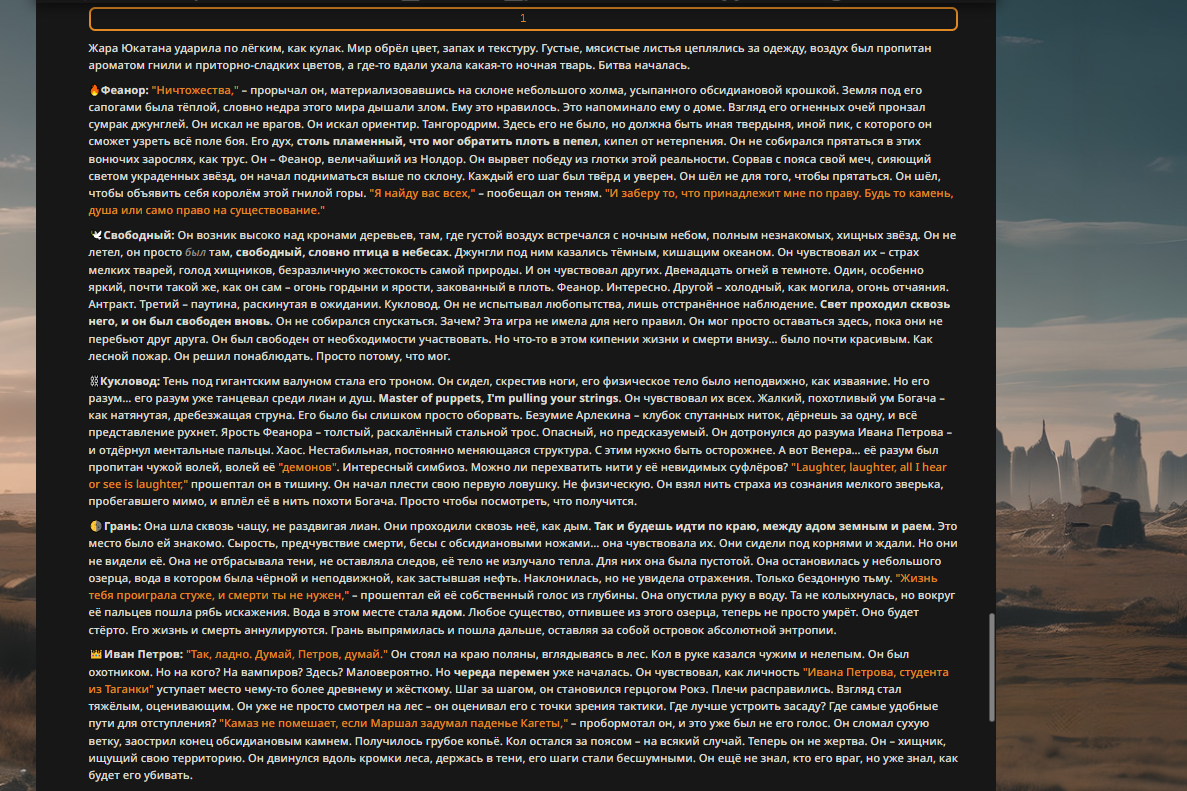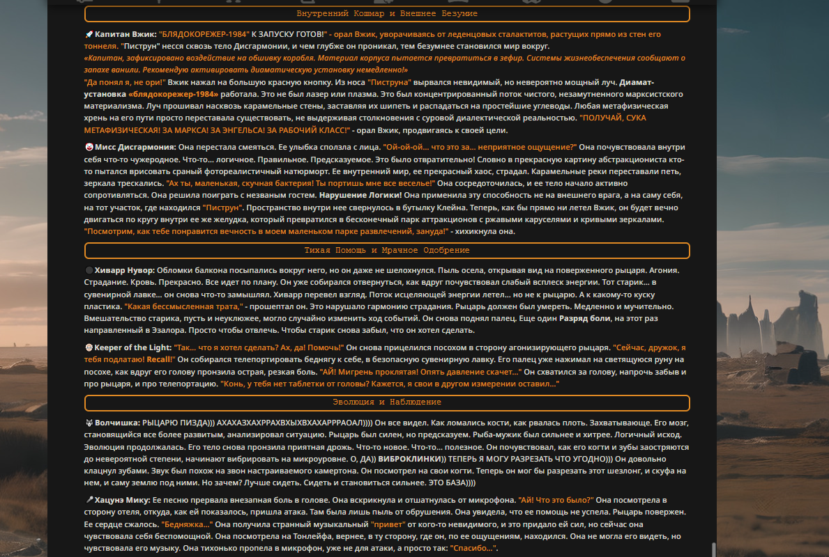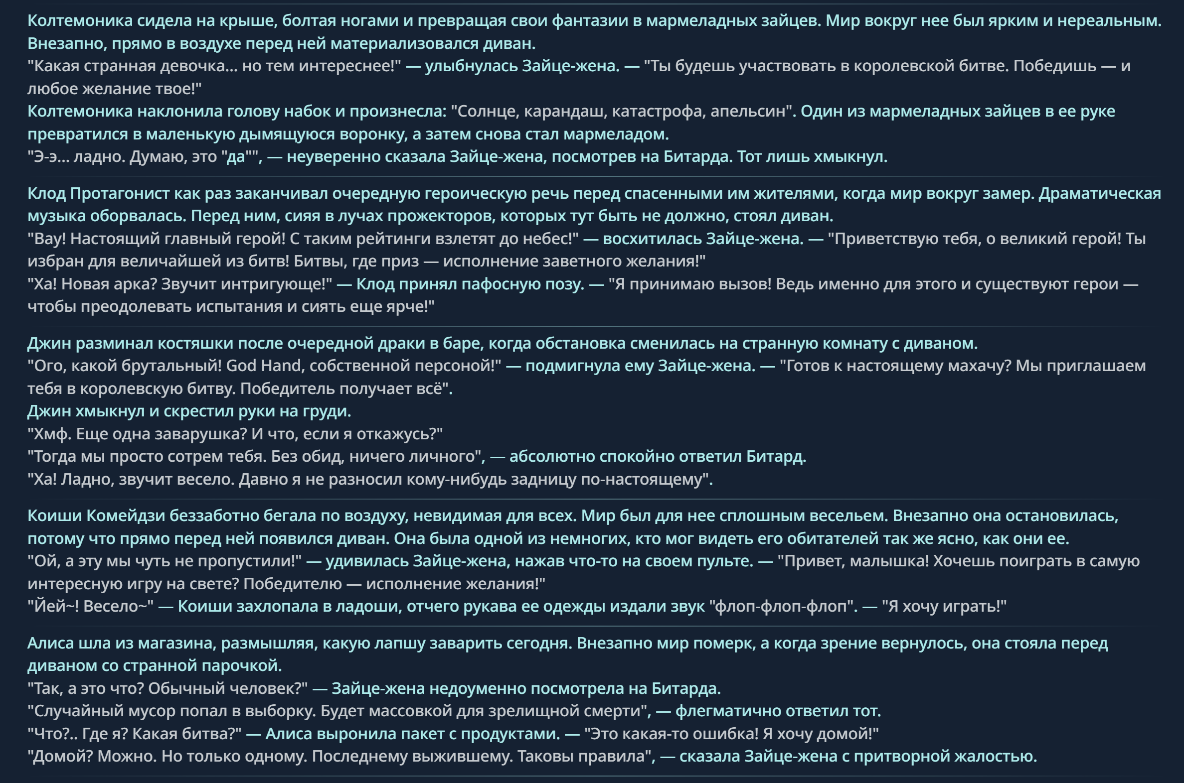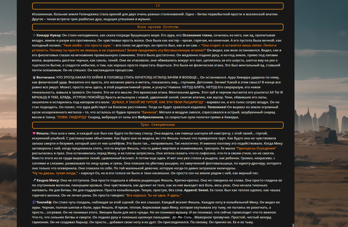Кста двачую. Приятно удивлён. Чёто там Мори нормально так нахимичил. У меня при просьбе так долго продолжать обычно получается просто Войдишка режим.