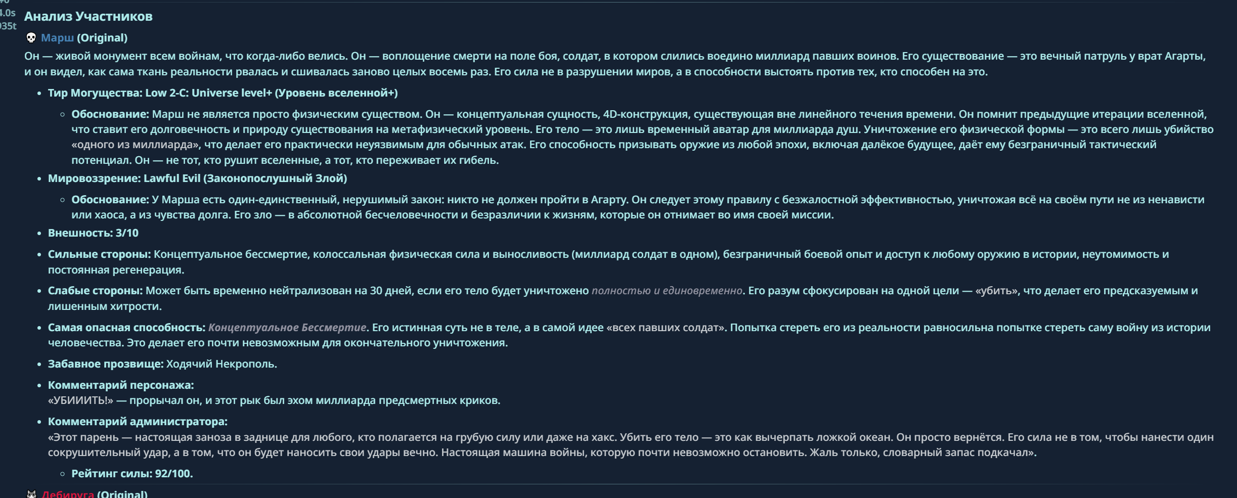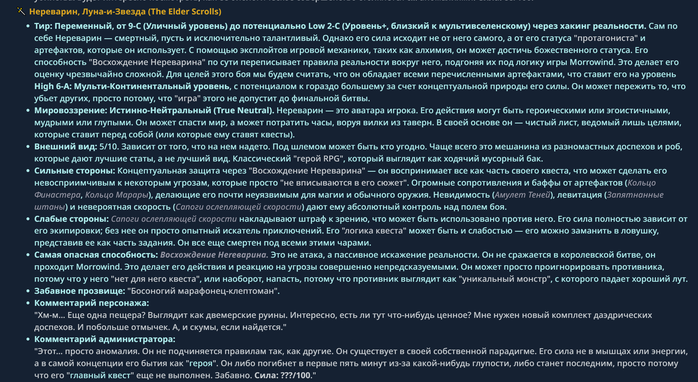 2} Нельзя предлагать персонажей на около божественном уровне силы. Галактикошататели, одной рукой уничтожающие вселенные, демиурги, творцы и архангелы - это божественный уровень силы. Неуязвимость от всего + бессмертие - это божественный уровень силы.