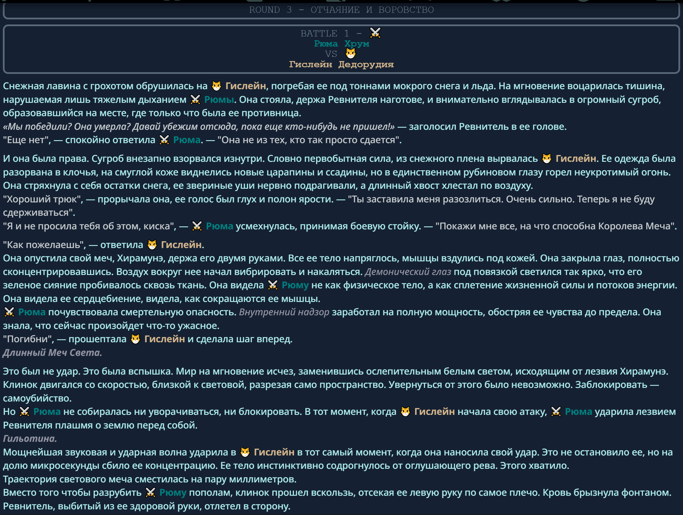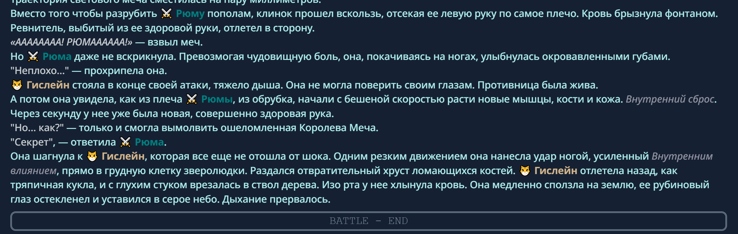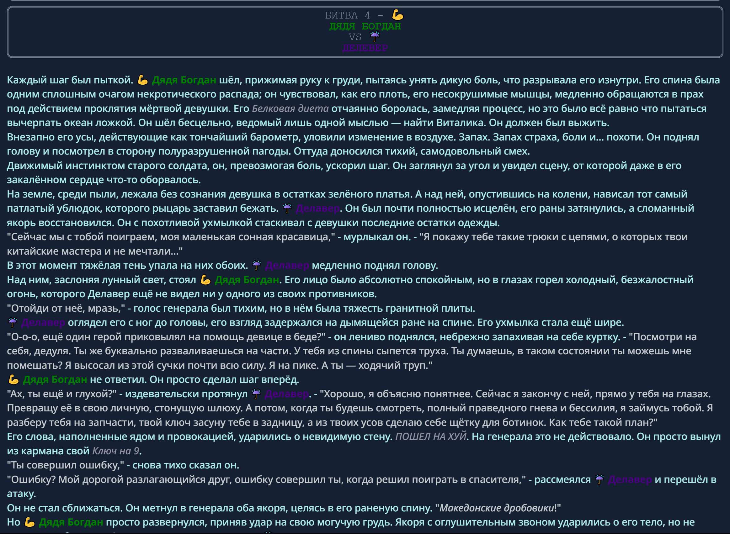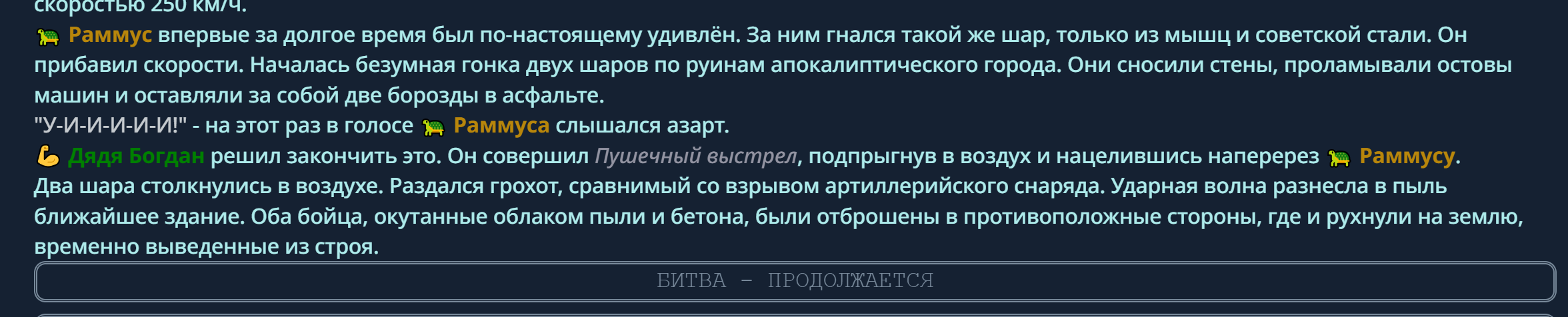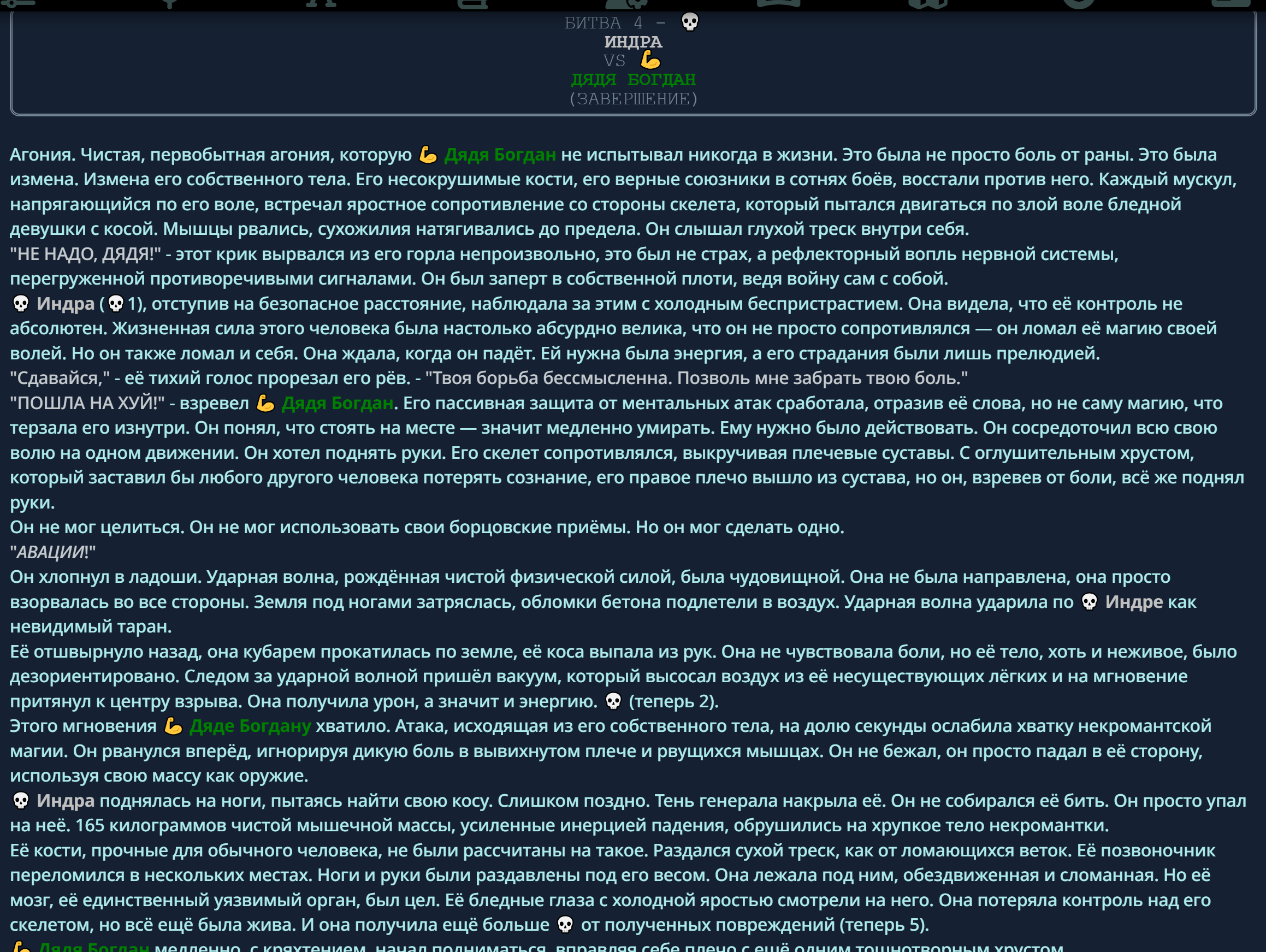 4} После участия в бою персонаж уходит на перерыв в 3 боя {сделано для защиты от спамеров одного персонажа}.