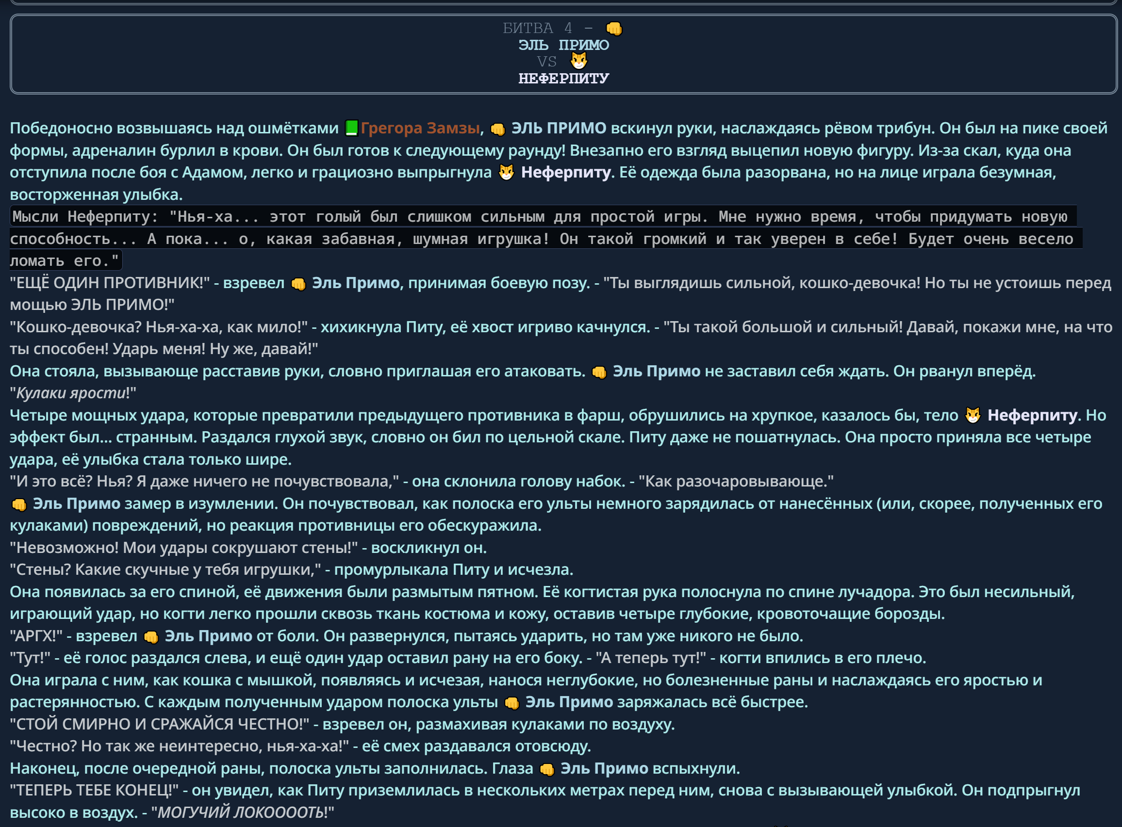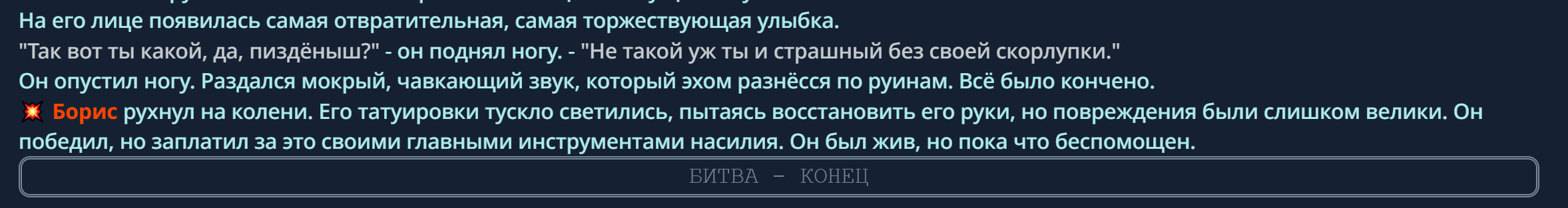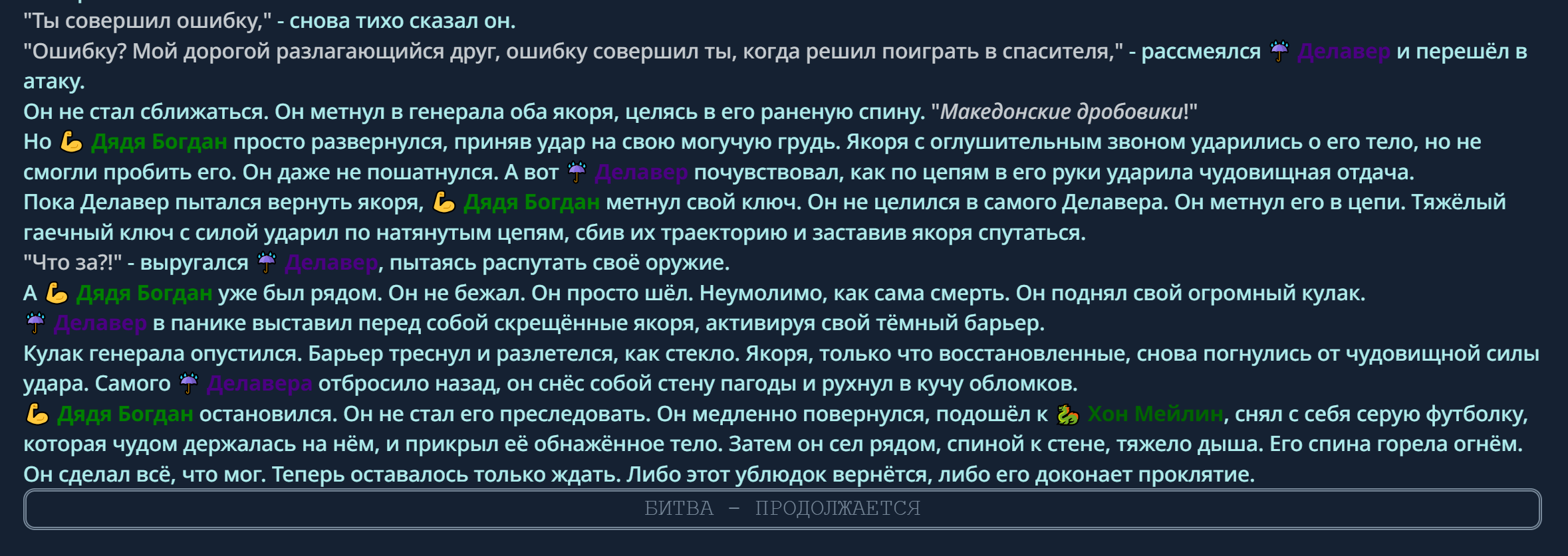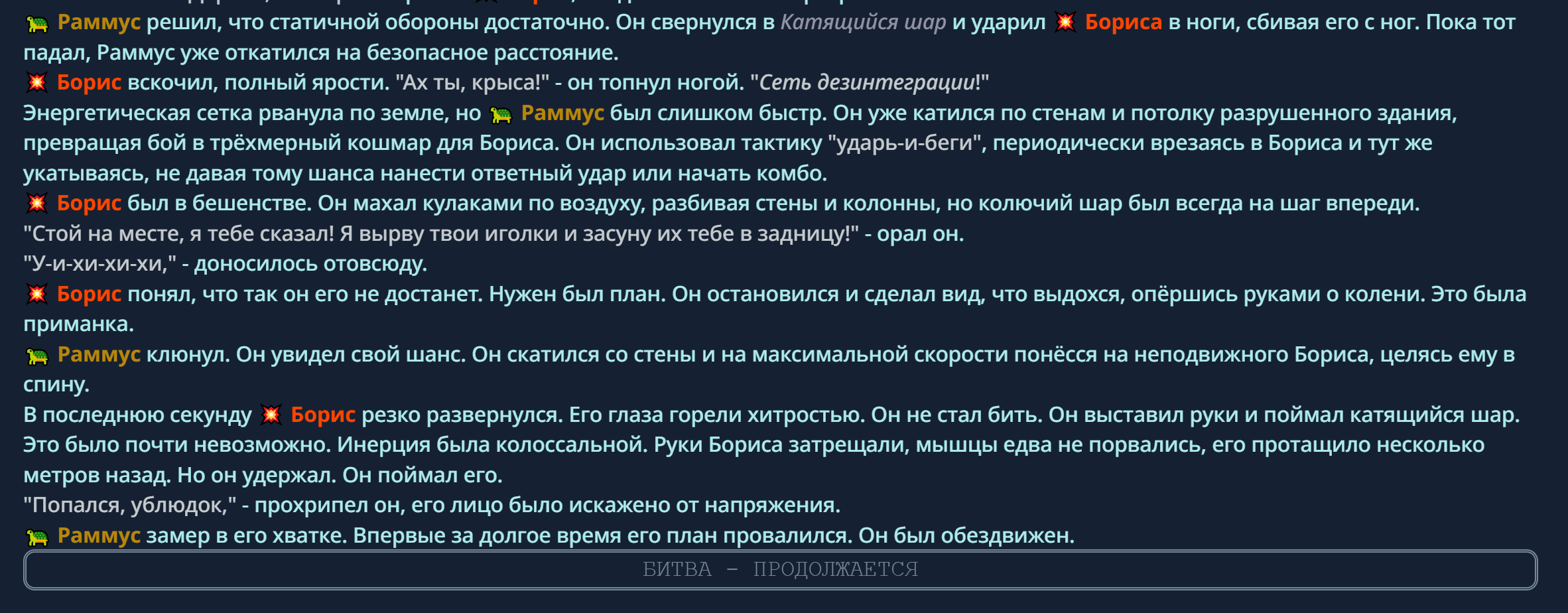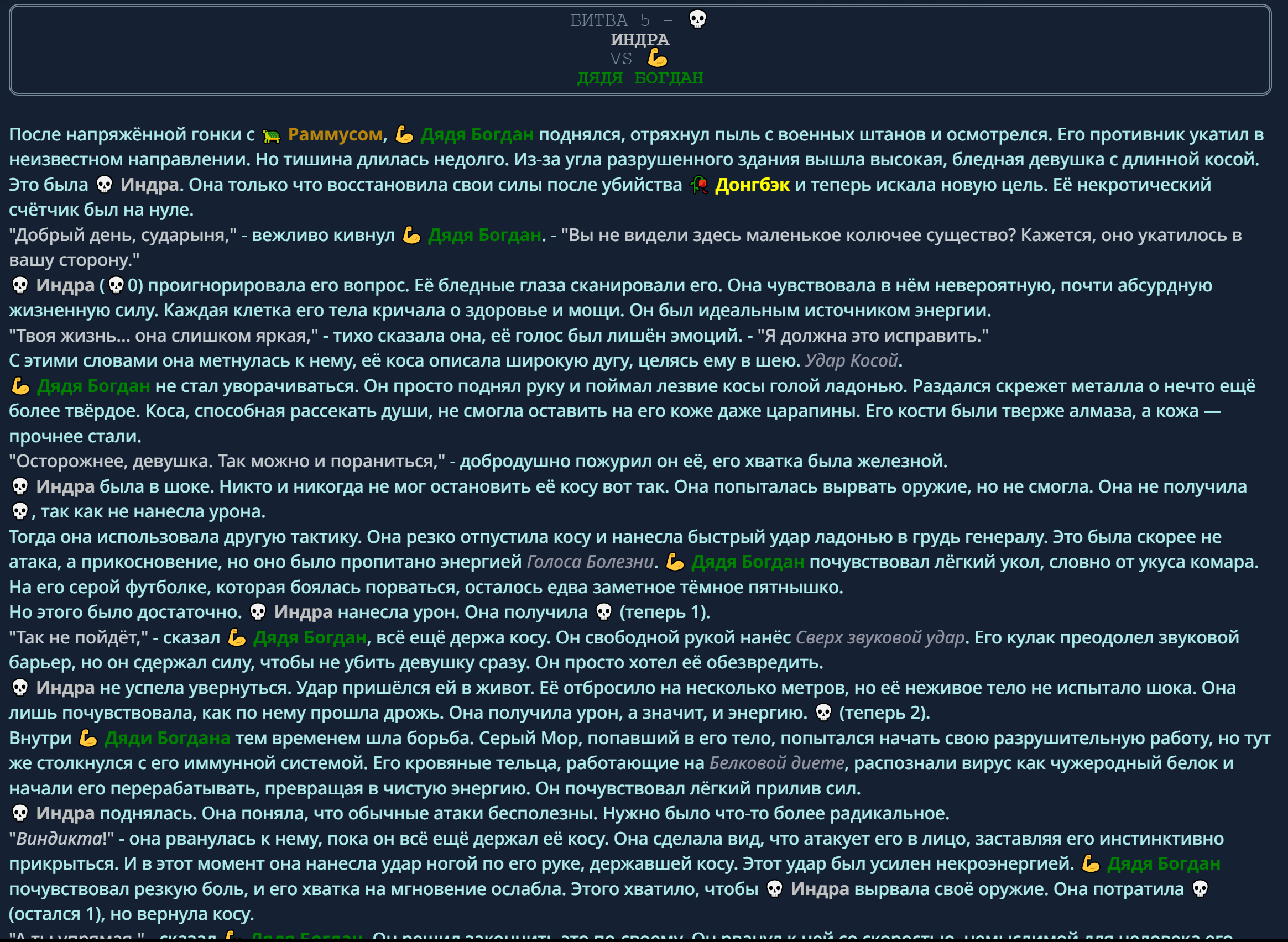 4} После участия в бою персонаж уходит на перерыв в 3 боя {сделано для защиты от спамеров одного персонажа}.