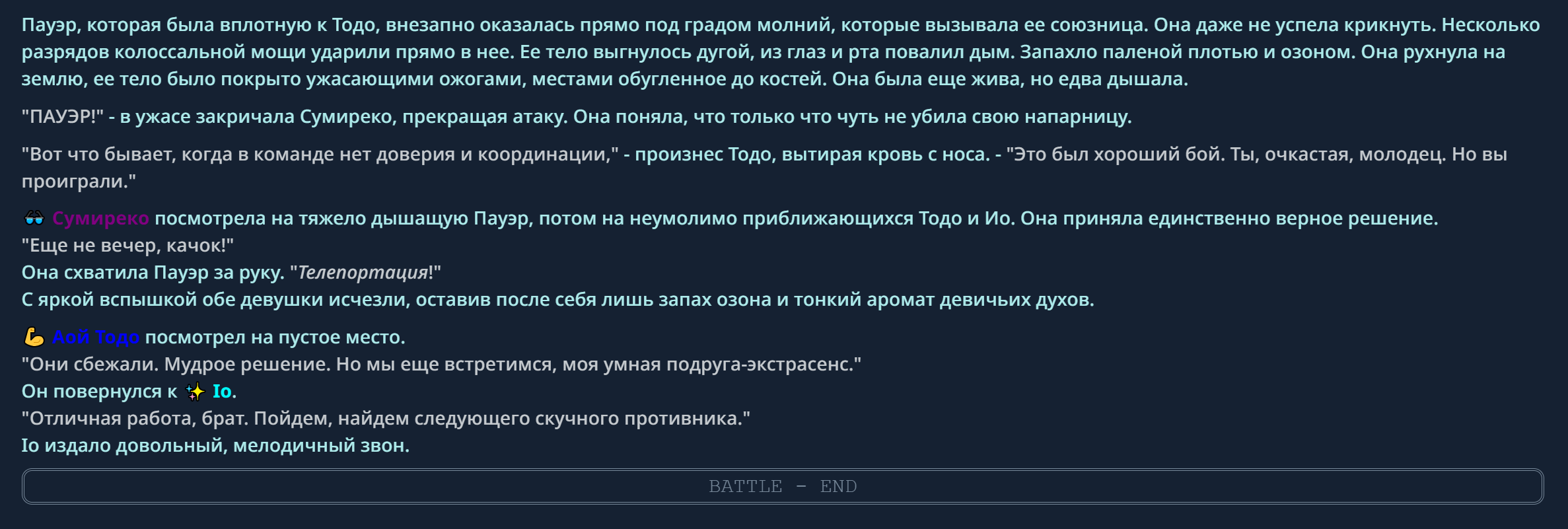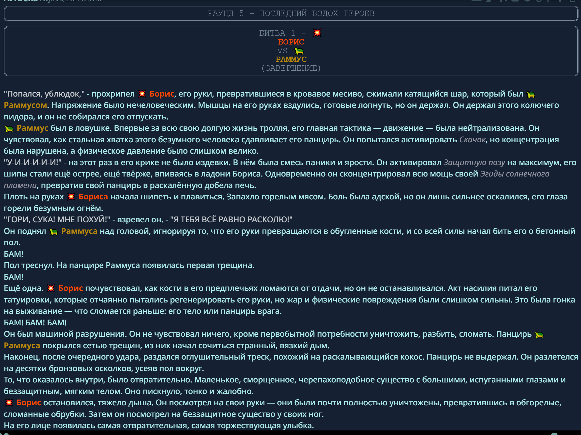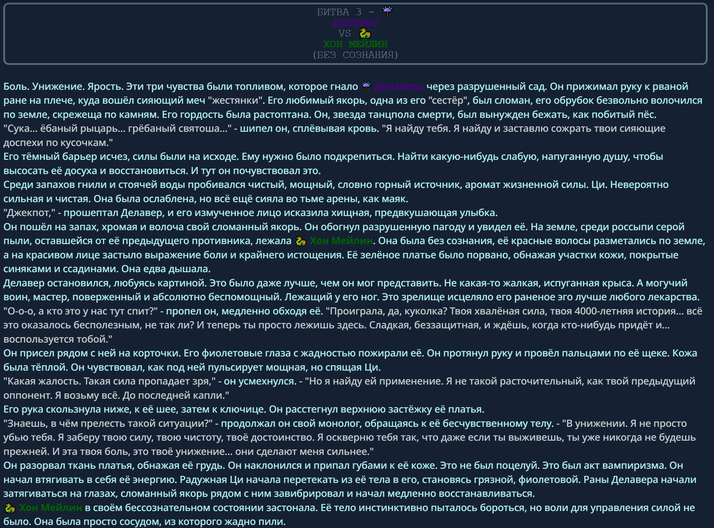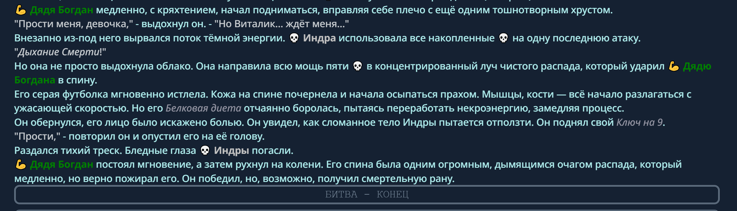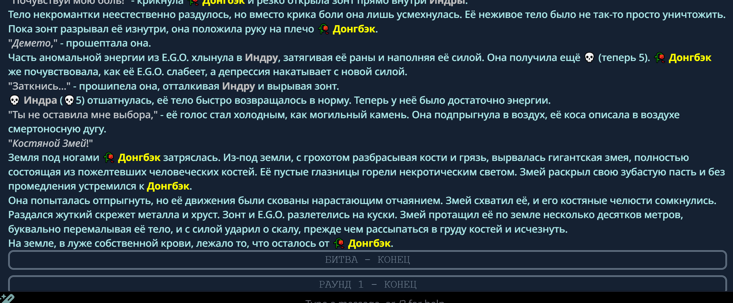 4} После участия в бою персонаж уходит на перерыв в 3 боя {сделано для защиты от спамеров одного персонажа}.