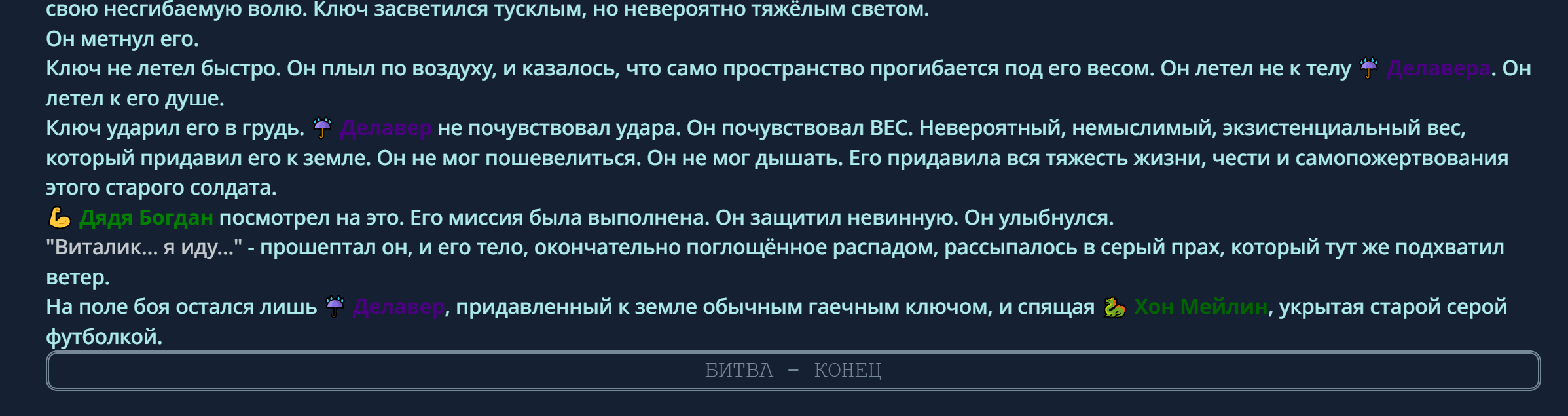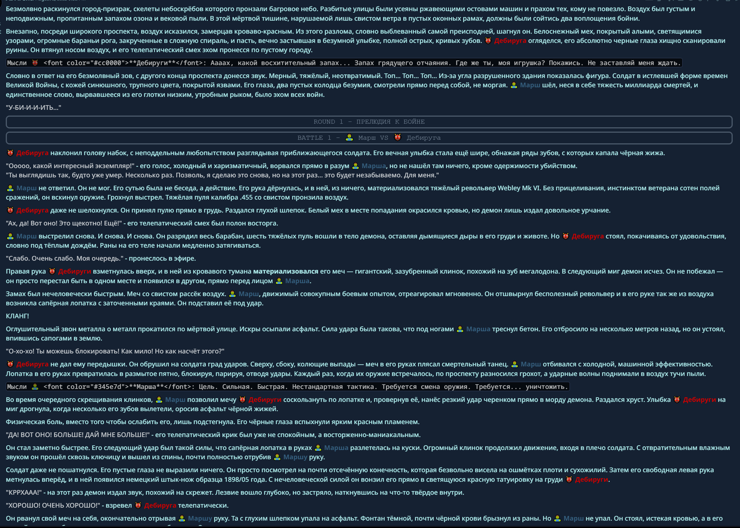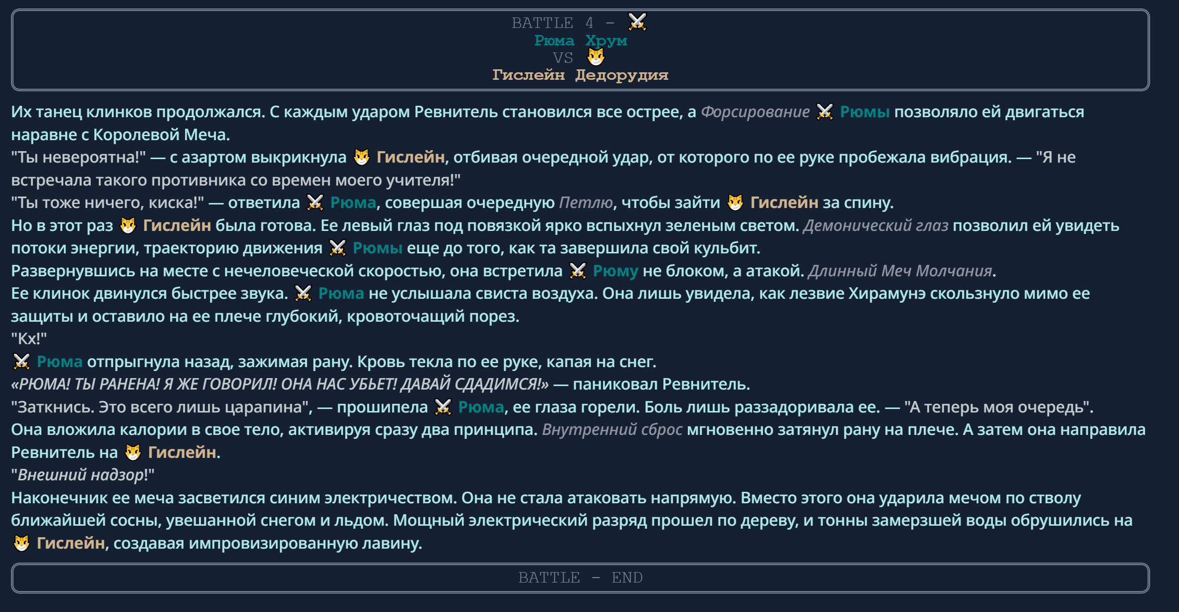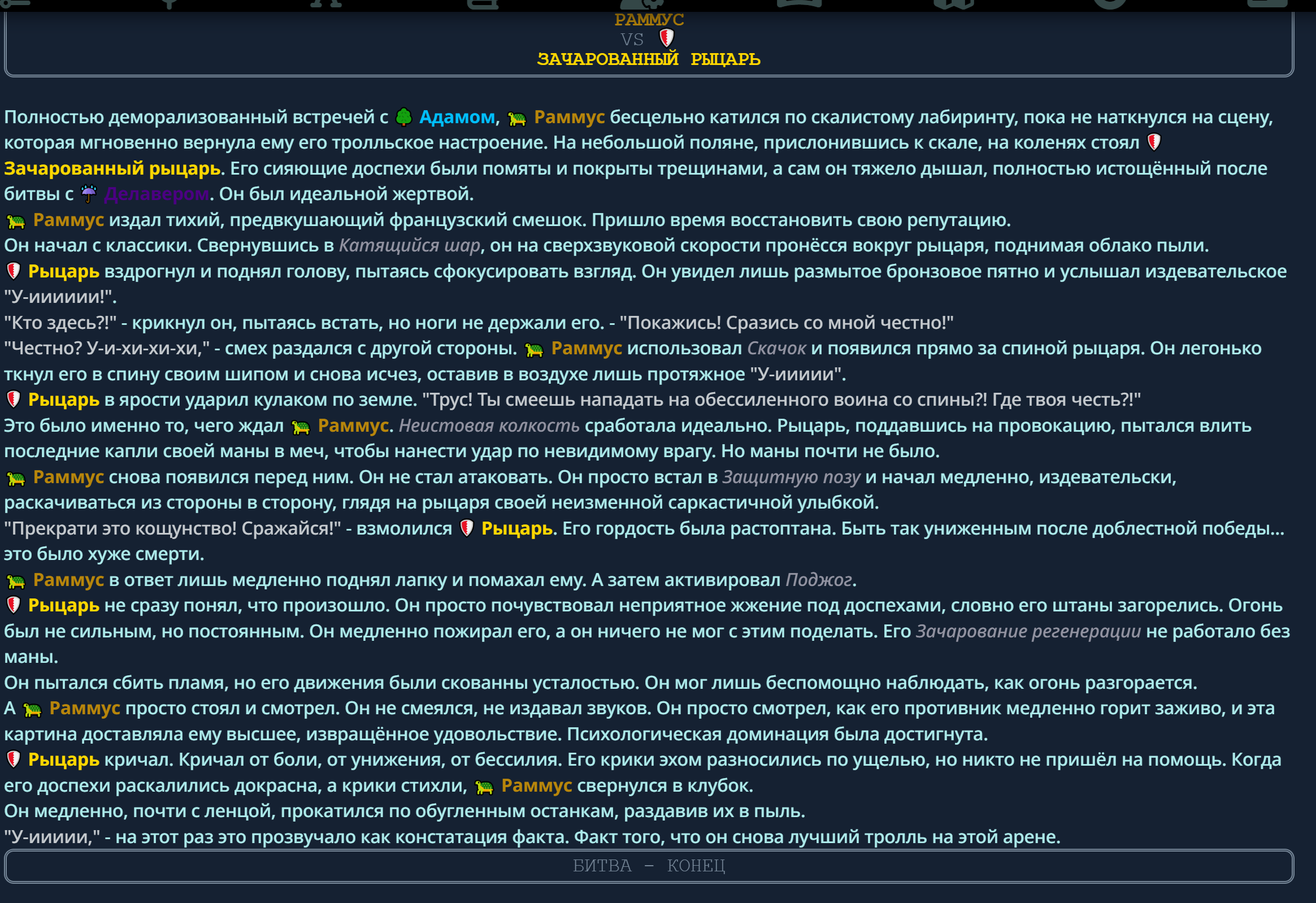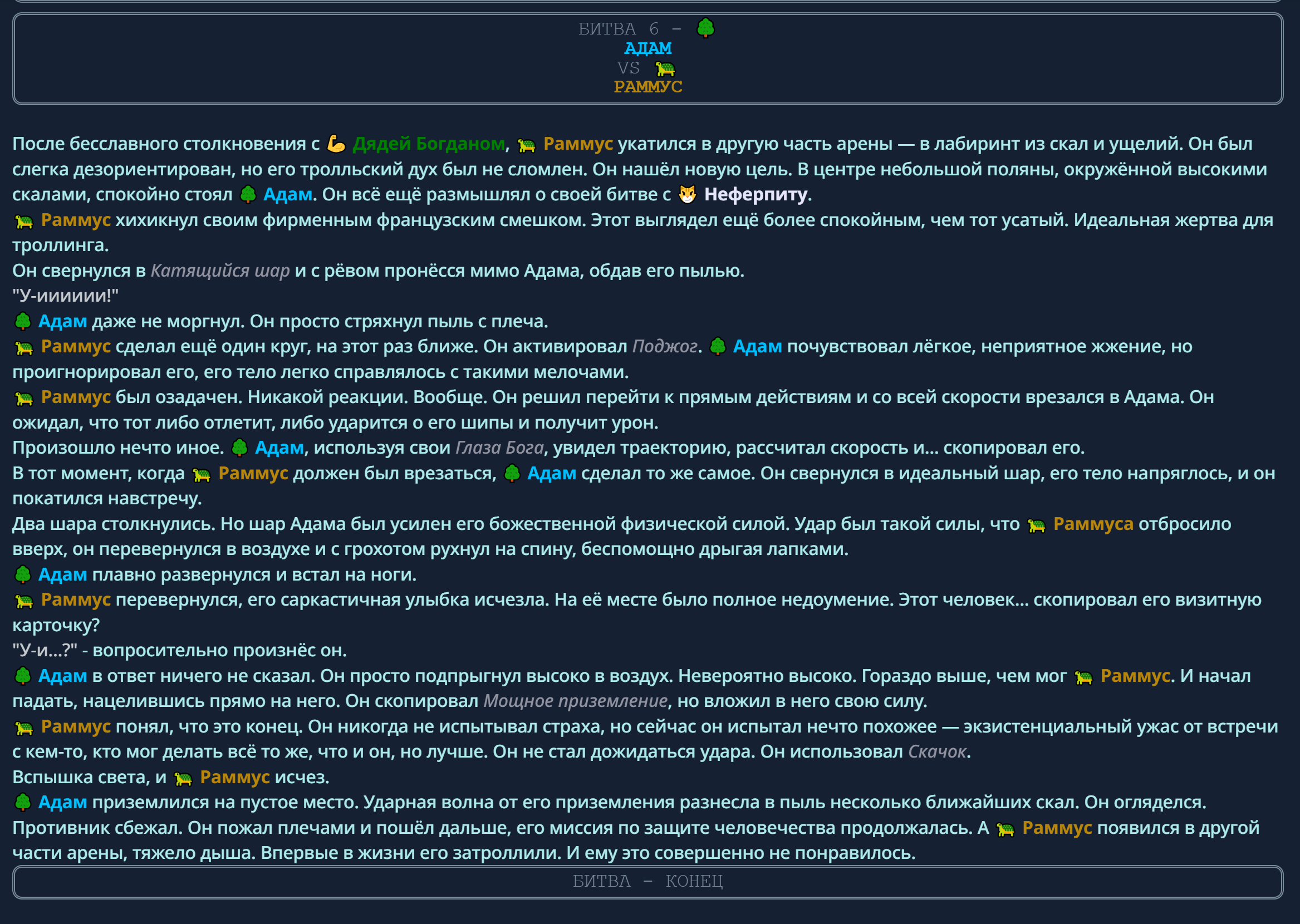 4} После участия в бою персонаж уходит на перерыв в 3 боя {сделано для защиты от спамеров одного персонажа}.