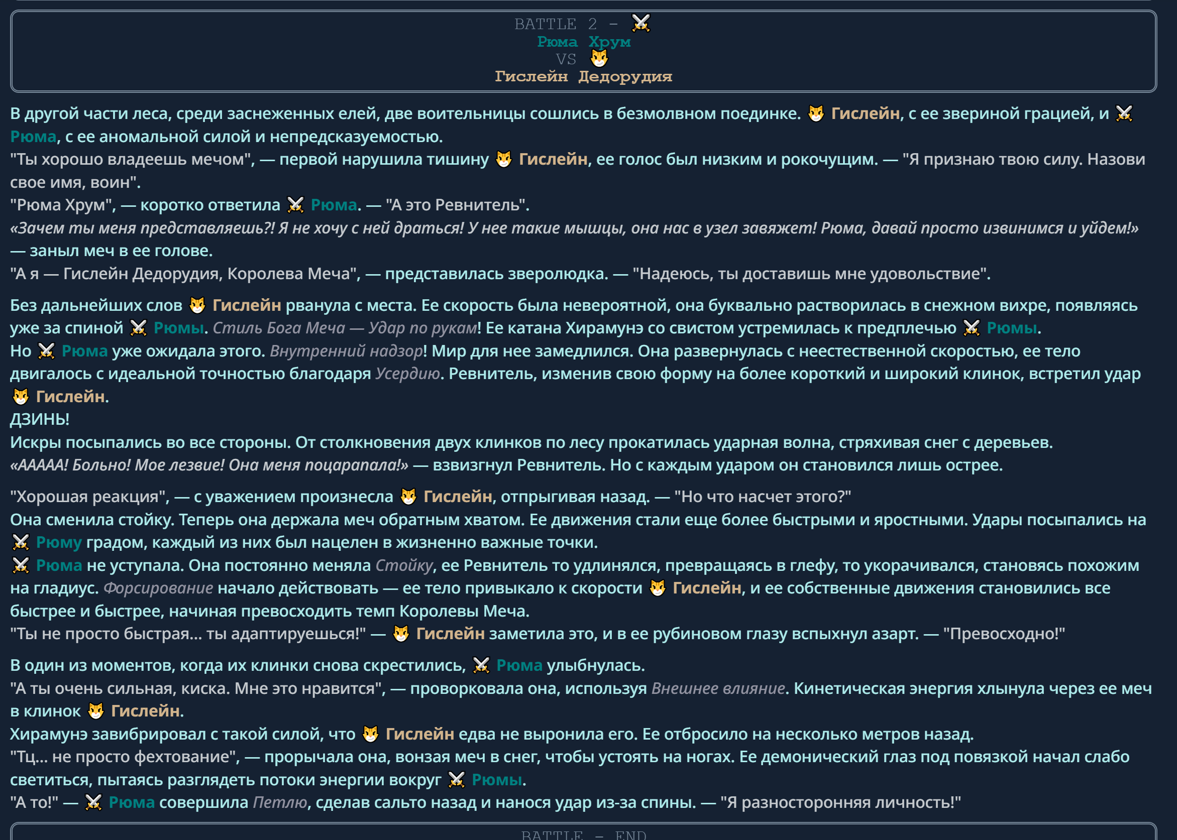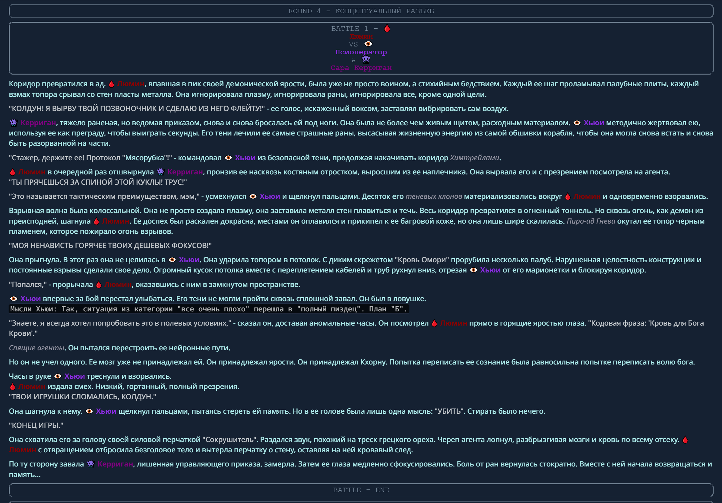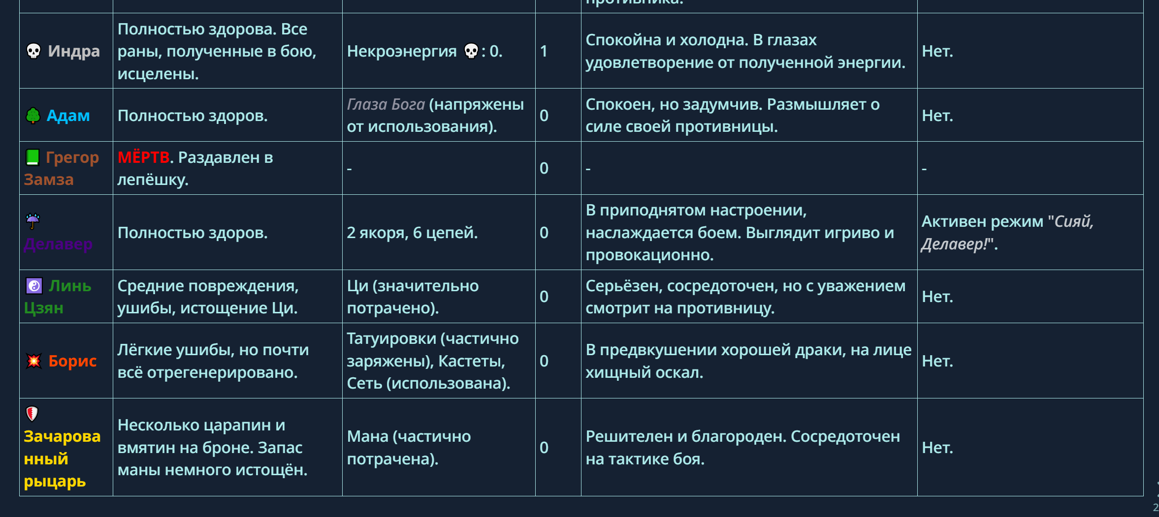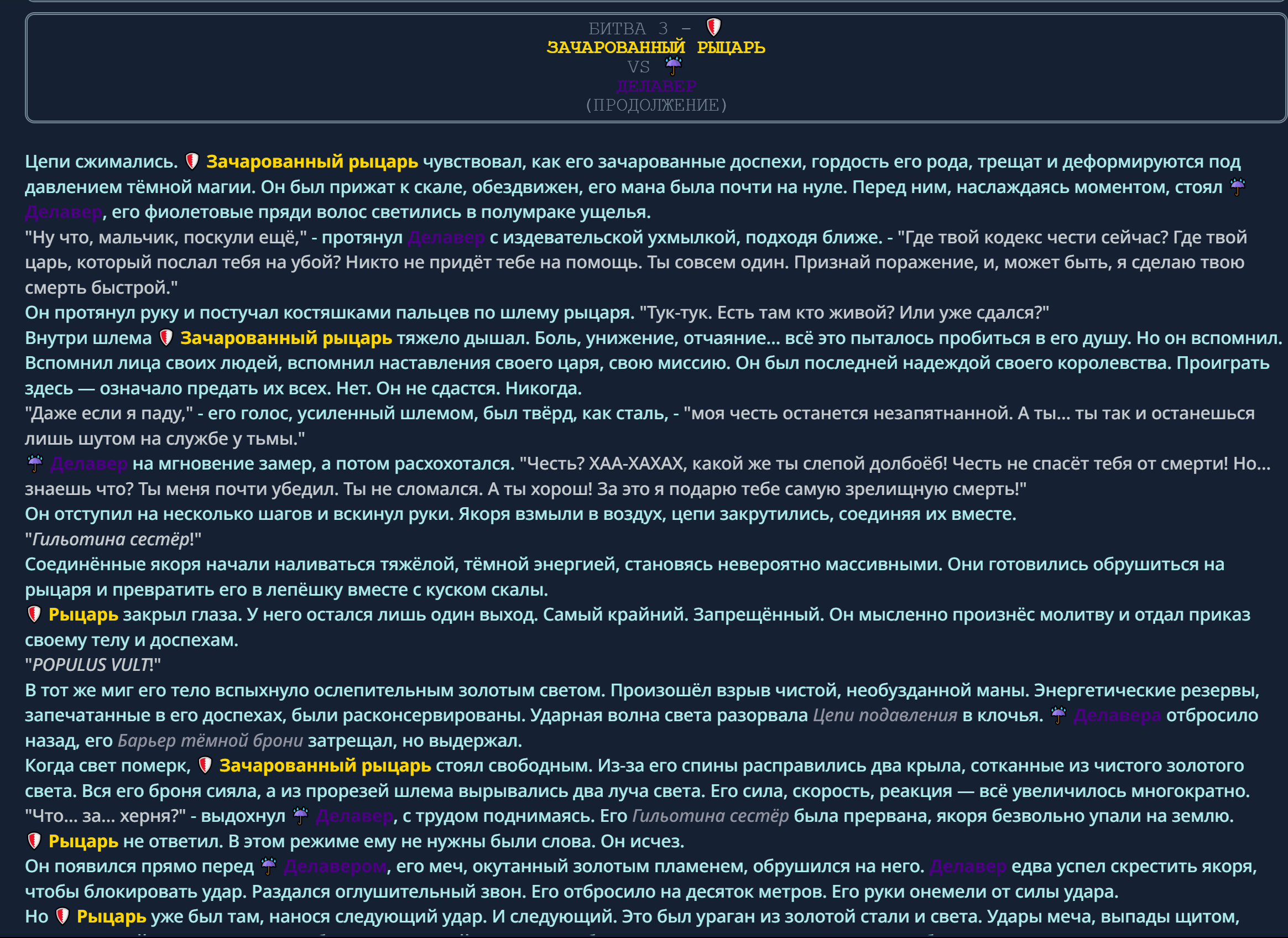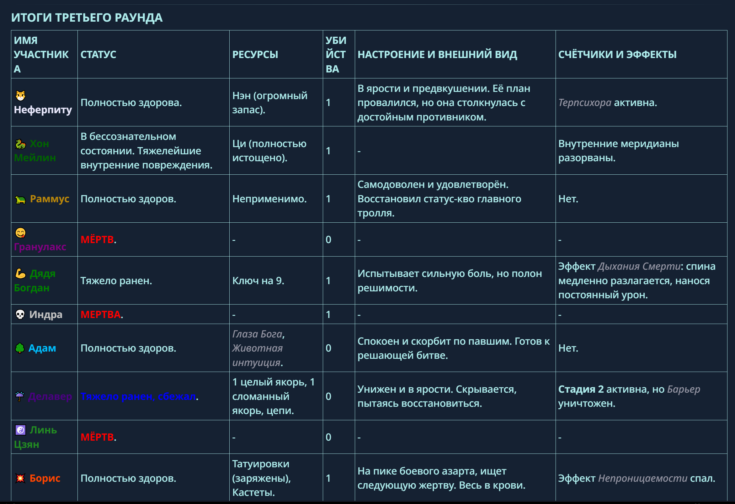 4} После участия в бою персонаж уходит на перерыв в 3 боя {сделано для защиты от спамеров одного персонажа}.