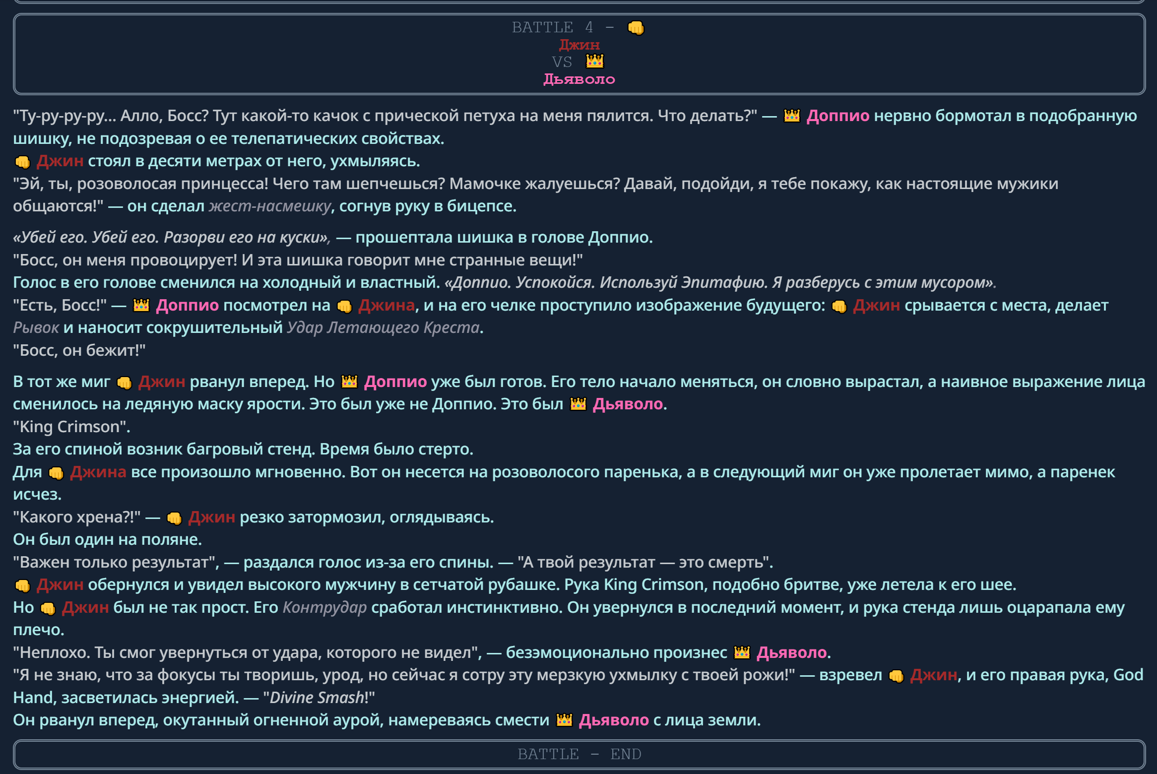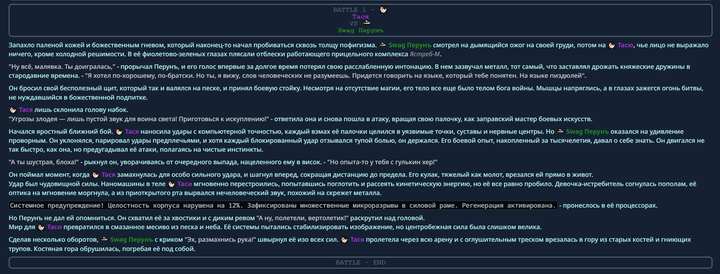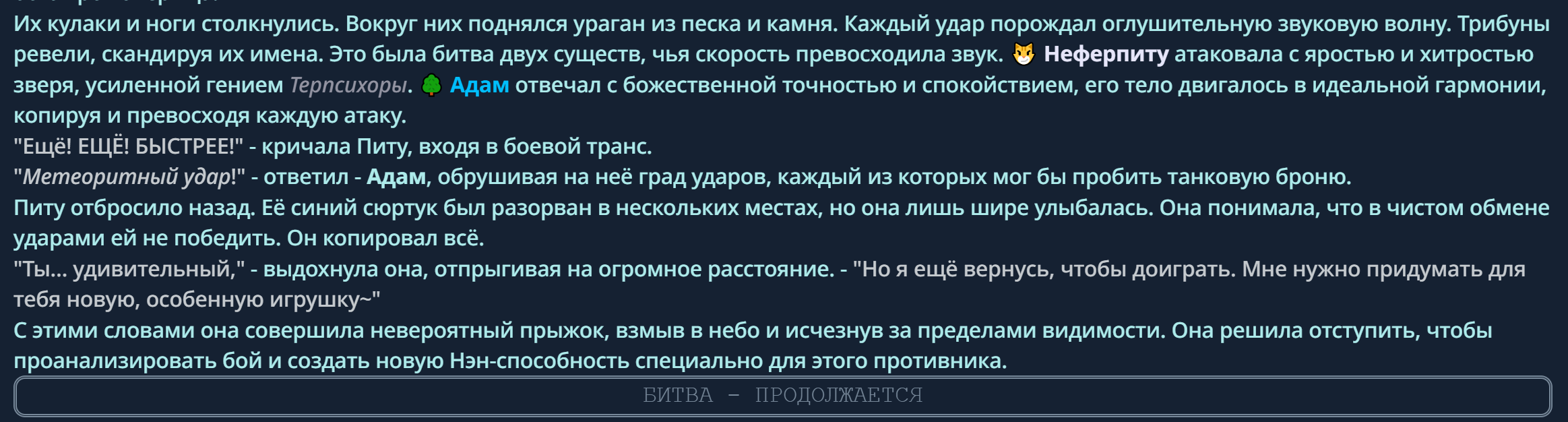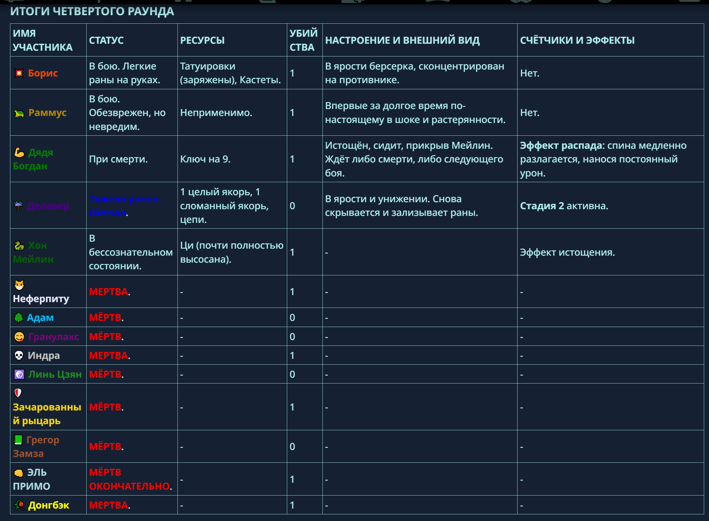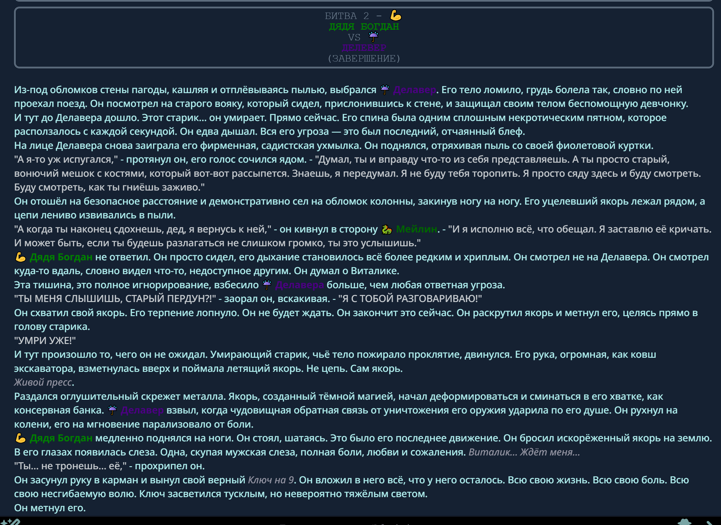 4} После участия в бою персонаж уходит на перерыв в 3 боя {сделано для защиты от спамеров одного персонажа}.