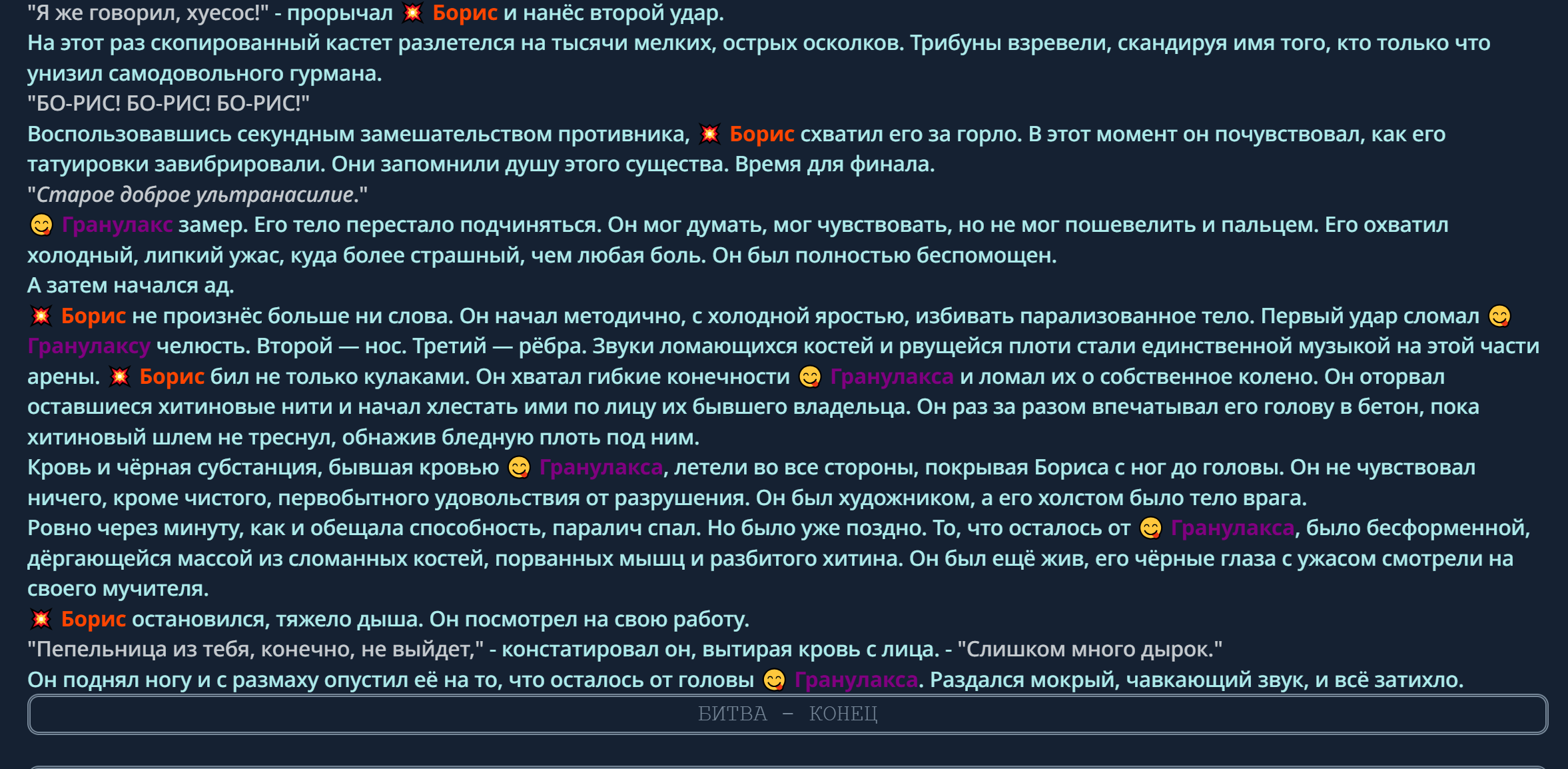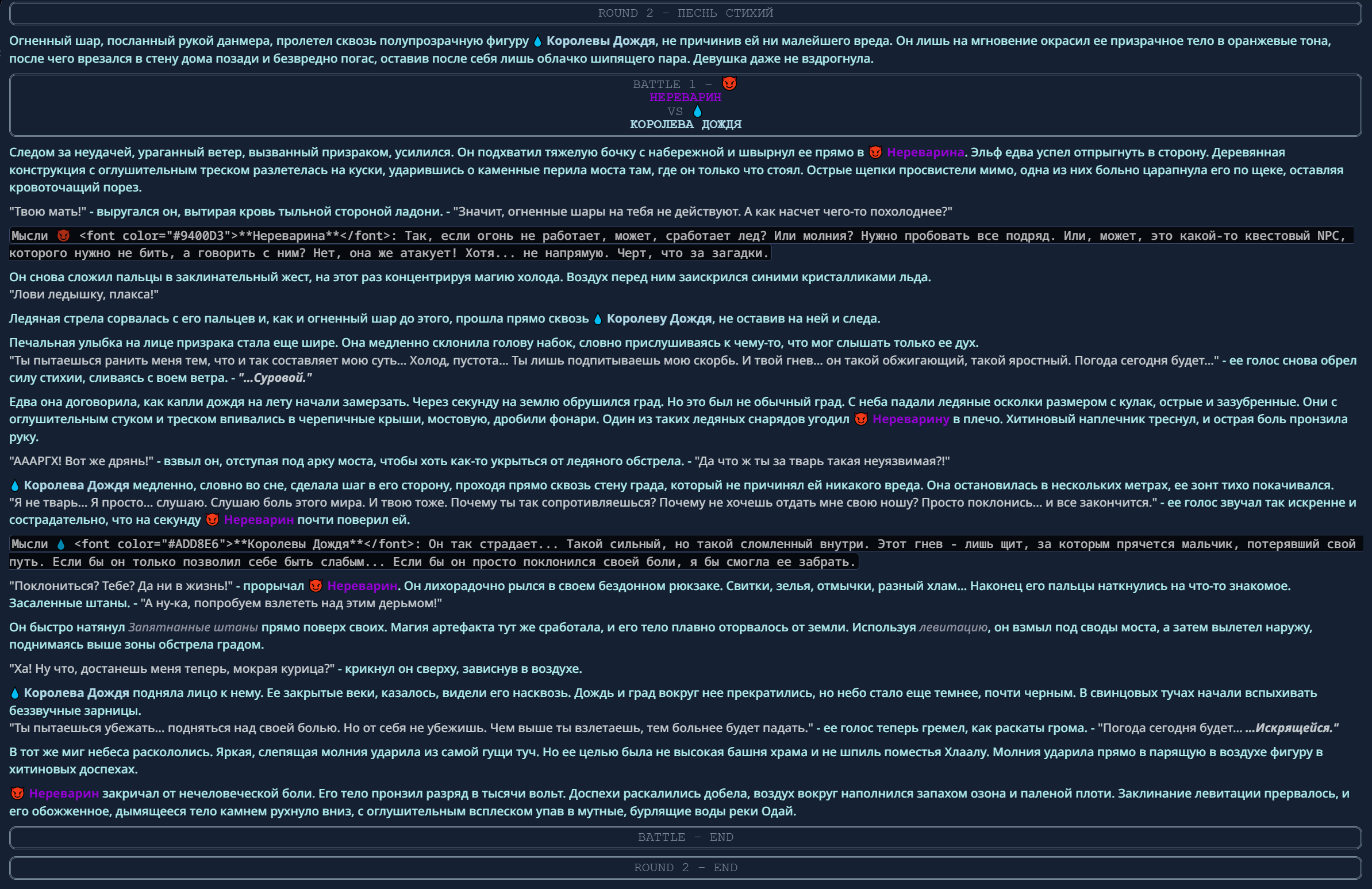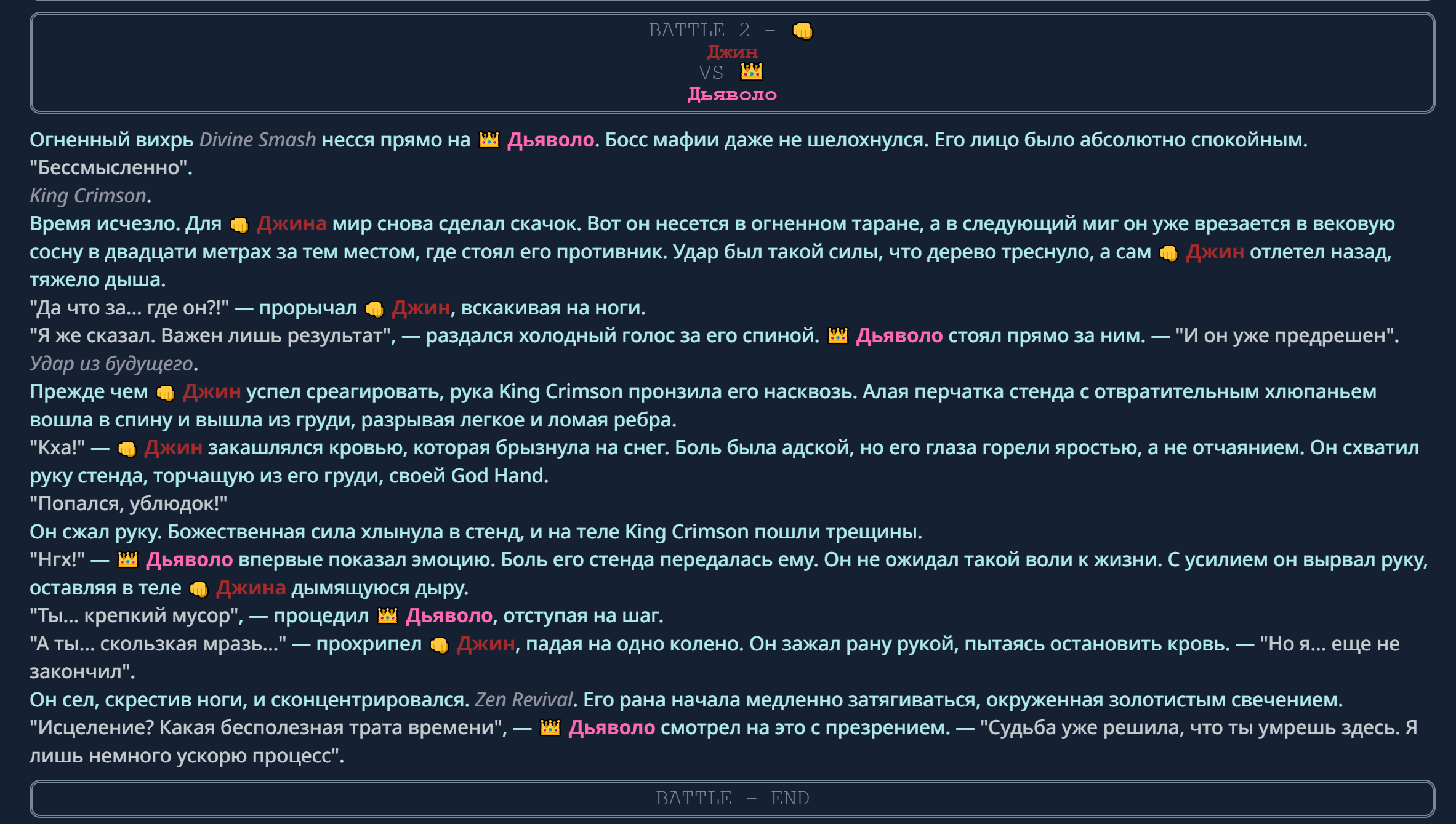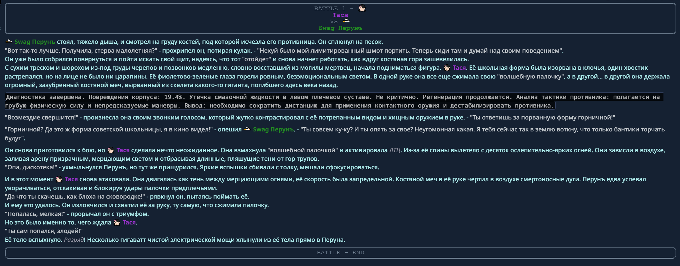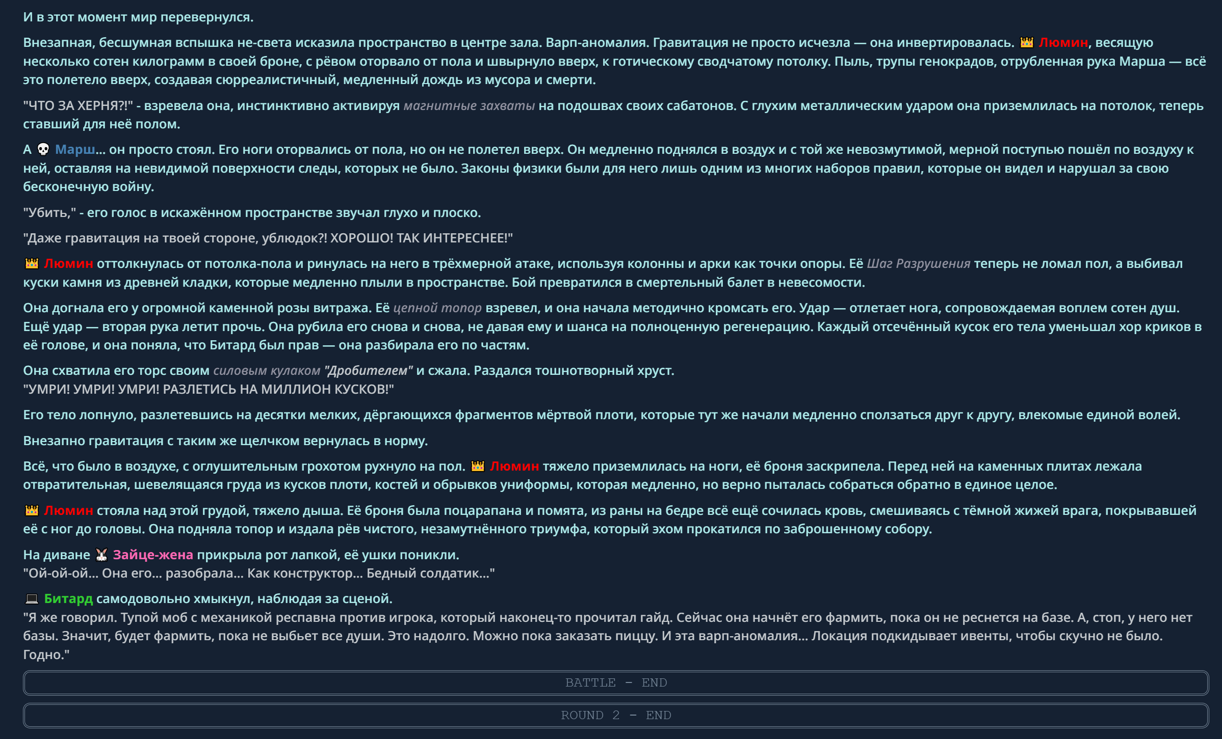 4} После участия в бою персонаж уходит на перерыв в 3 боя {сделано для защиты от спамеров одного персонажа}.