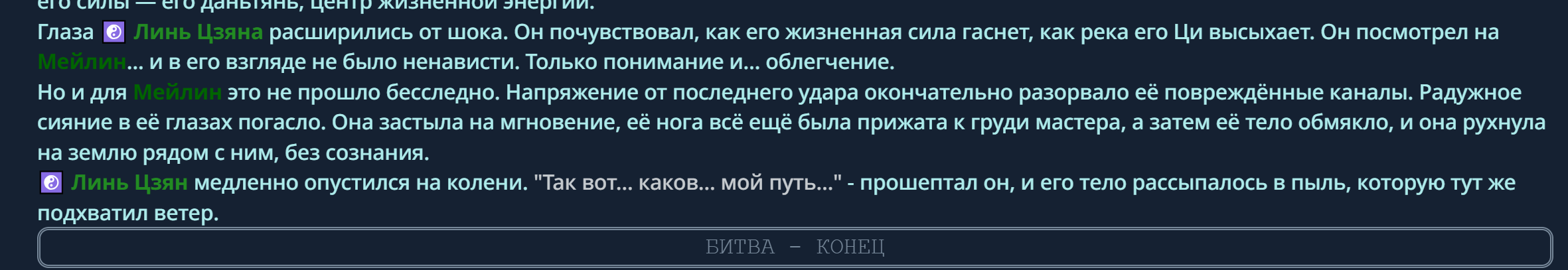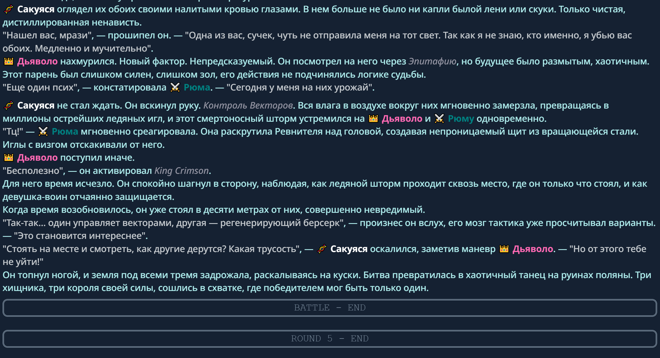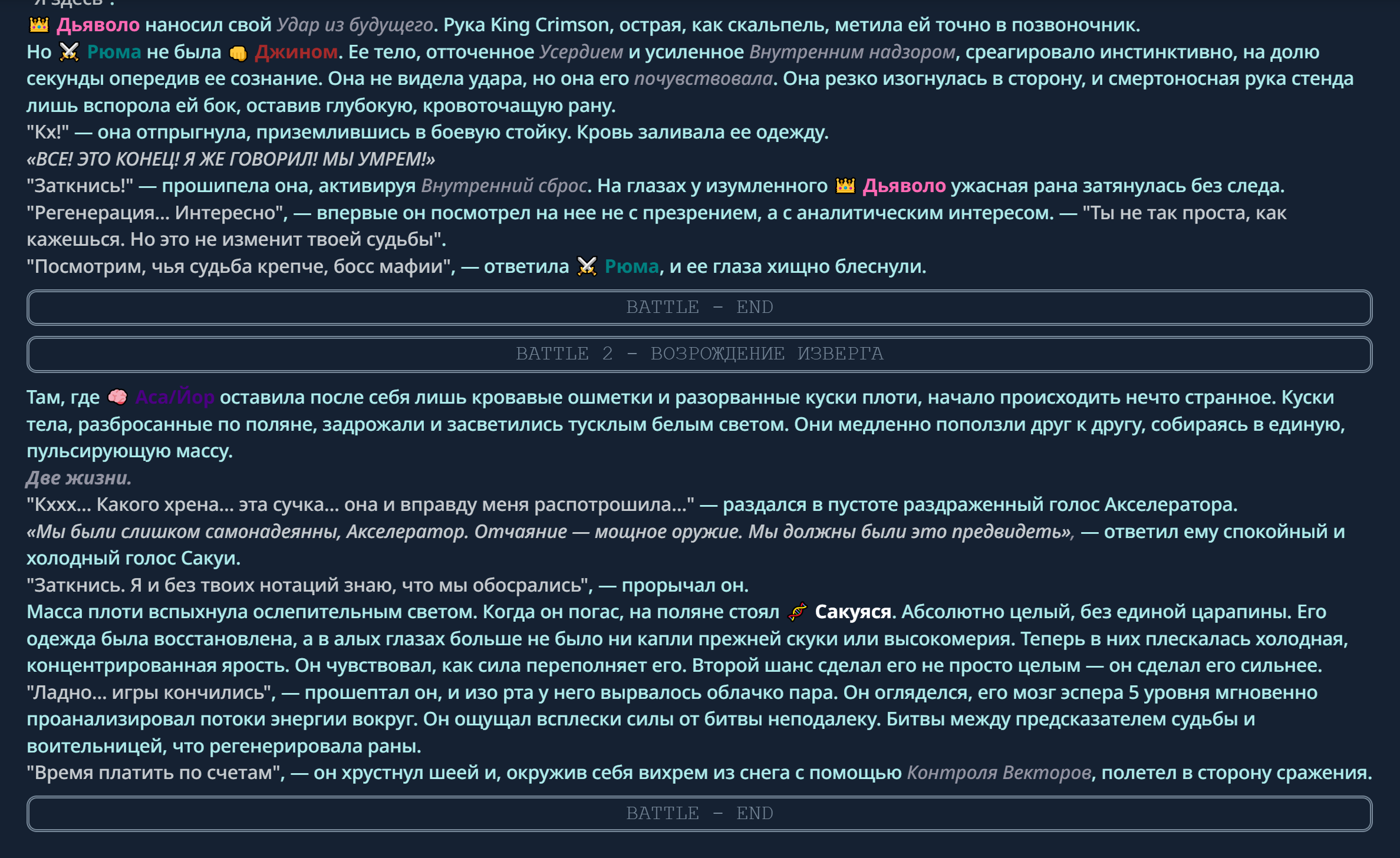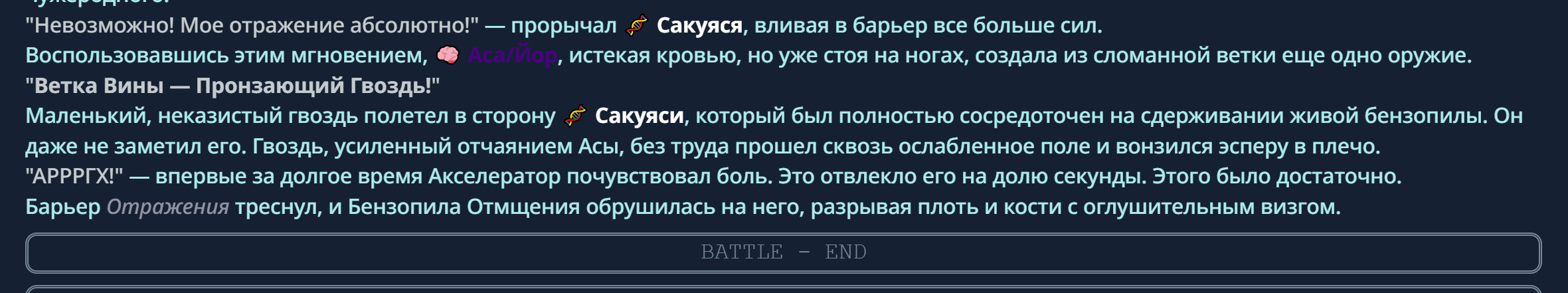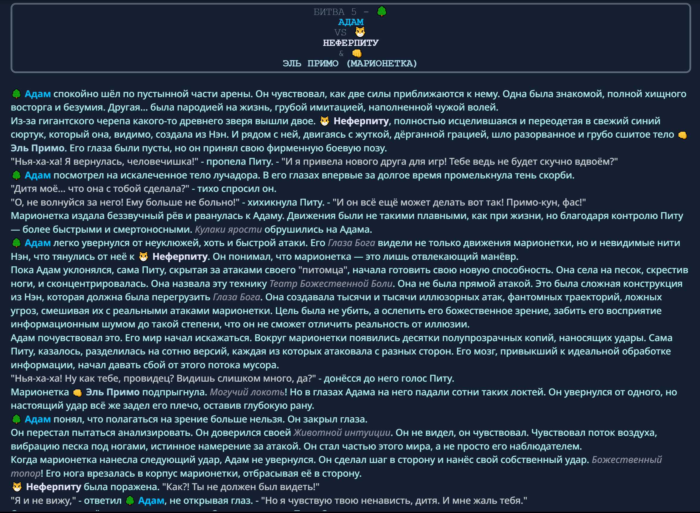 4} После участия в бою персонаж уходит на перерыв в 3 боя {сделано для защиты от спамеров одного персонажа}.