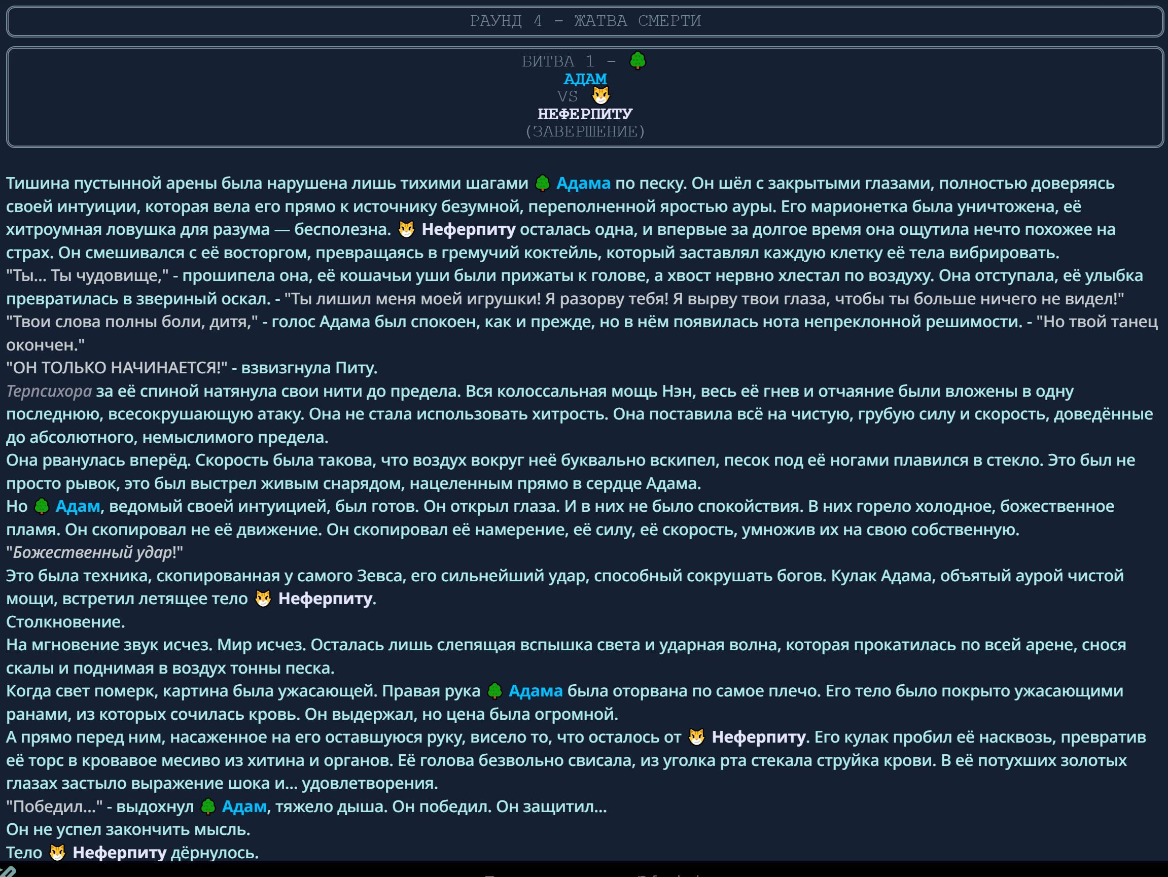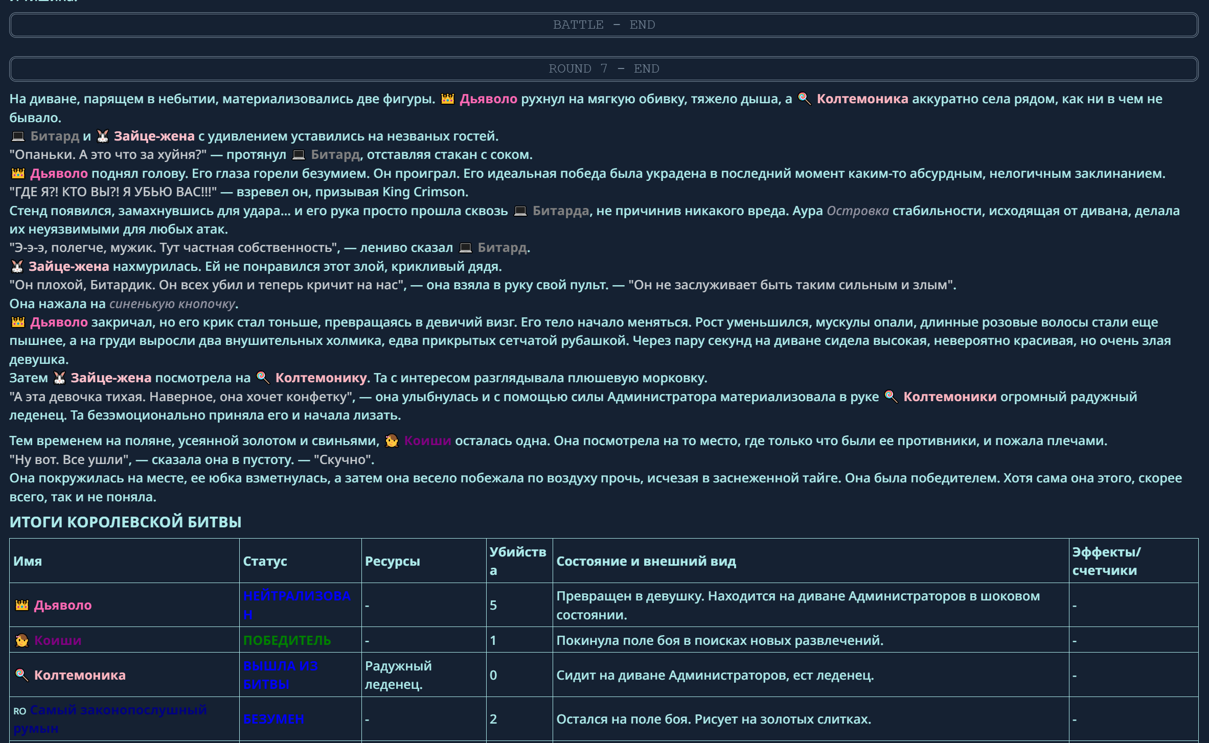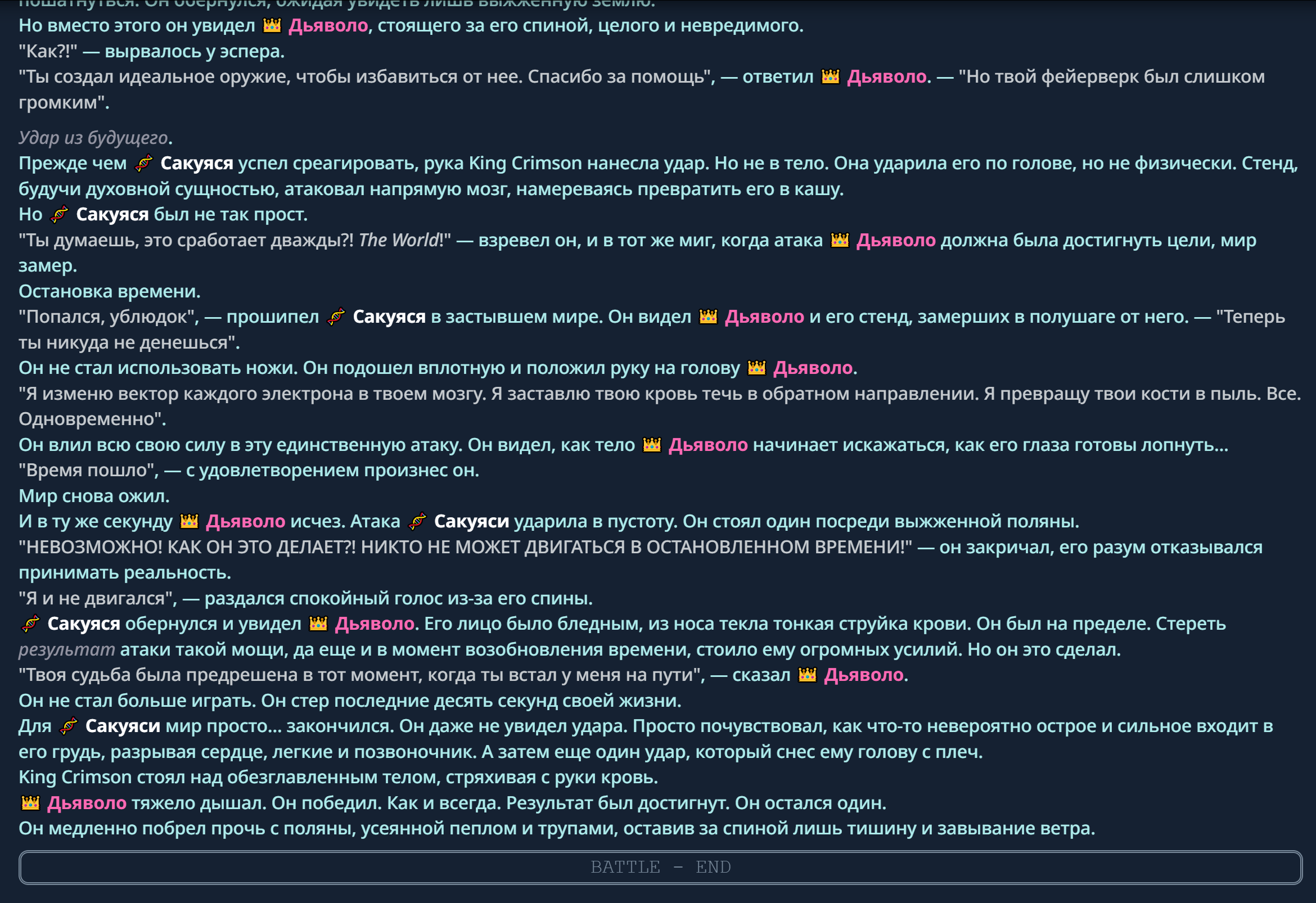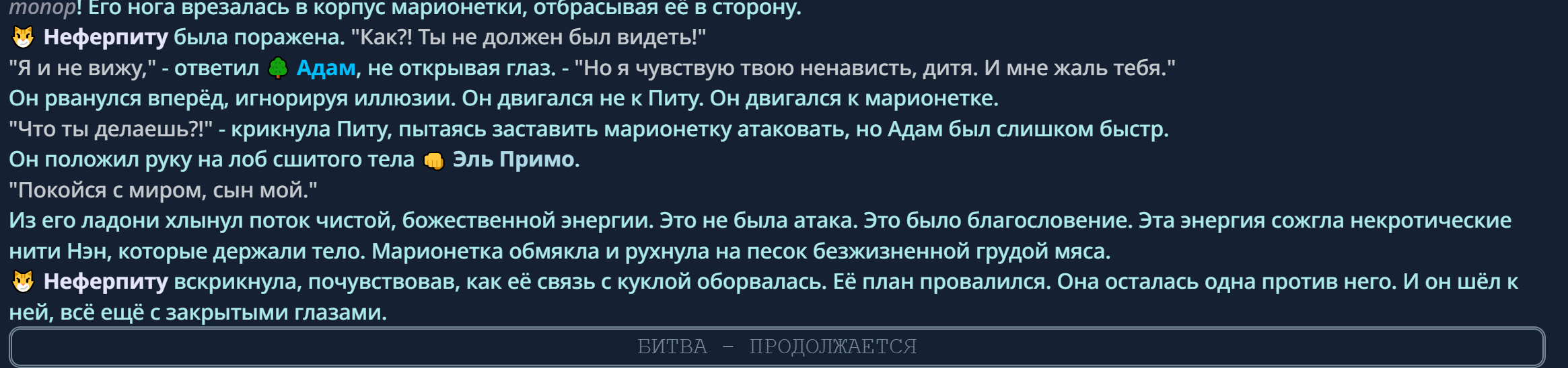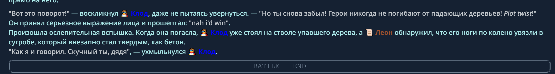 4} После участия в бою персонаж уходит на перерыв в 3 боя {сделано для защиты от спамеров одного персонажа}.