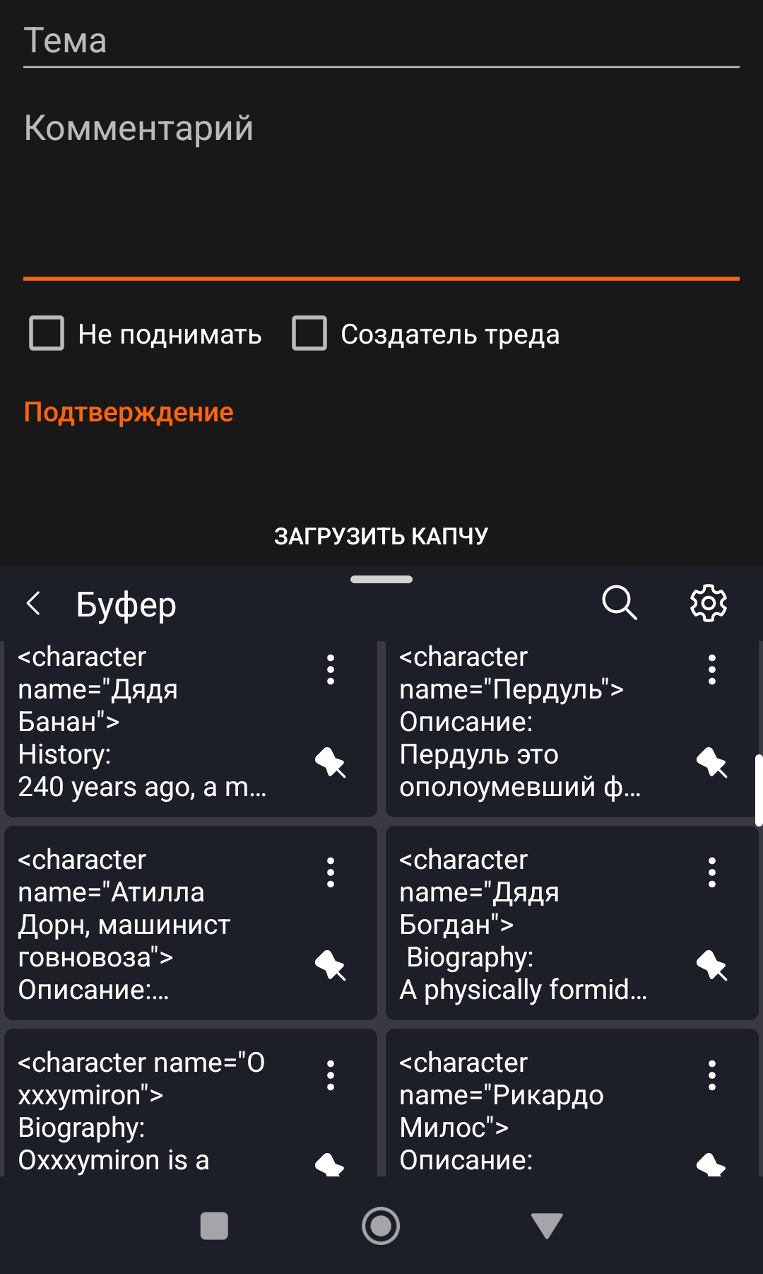 Скрипт Феешиза: https://pastebin.com/7AecbF1M для копирования персонажей в буфер обмена. Может пригодится кому-то для вставки персонажей в таверну. Работает только в /WR/!