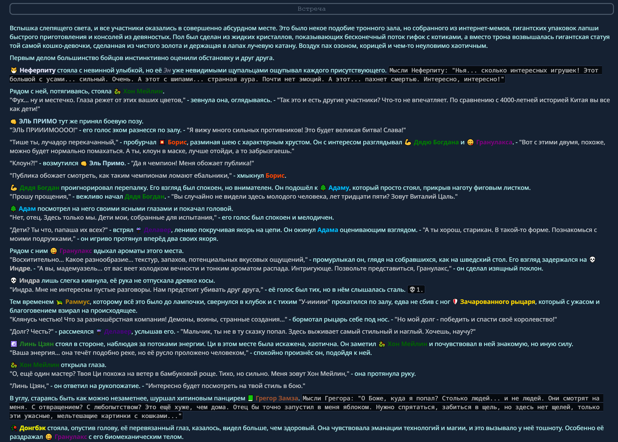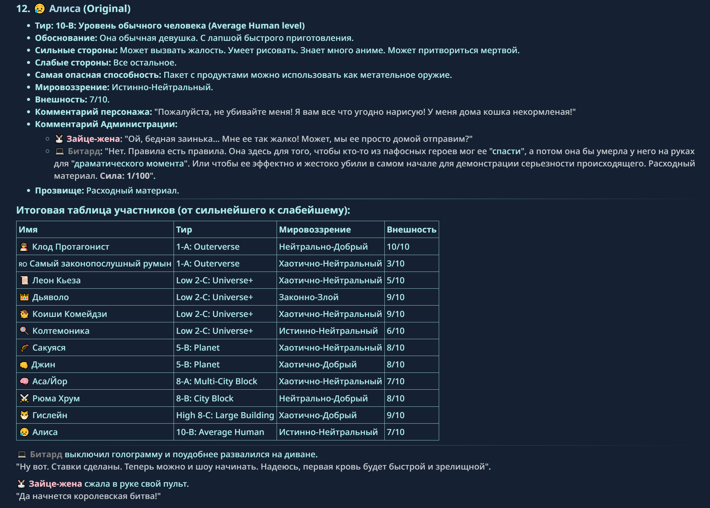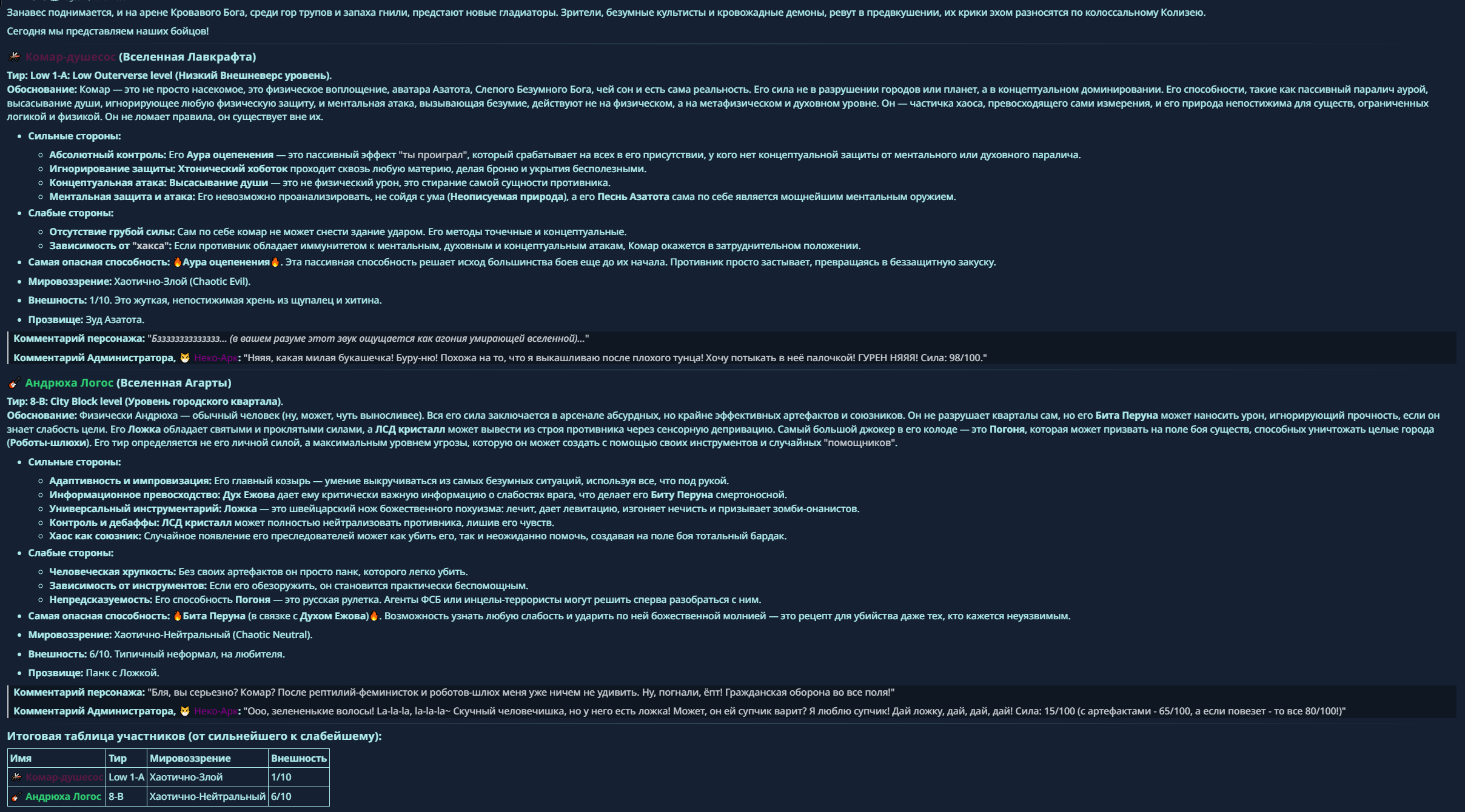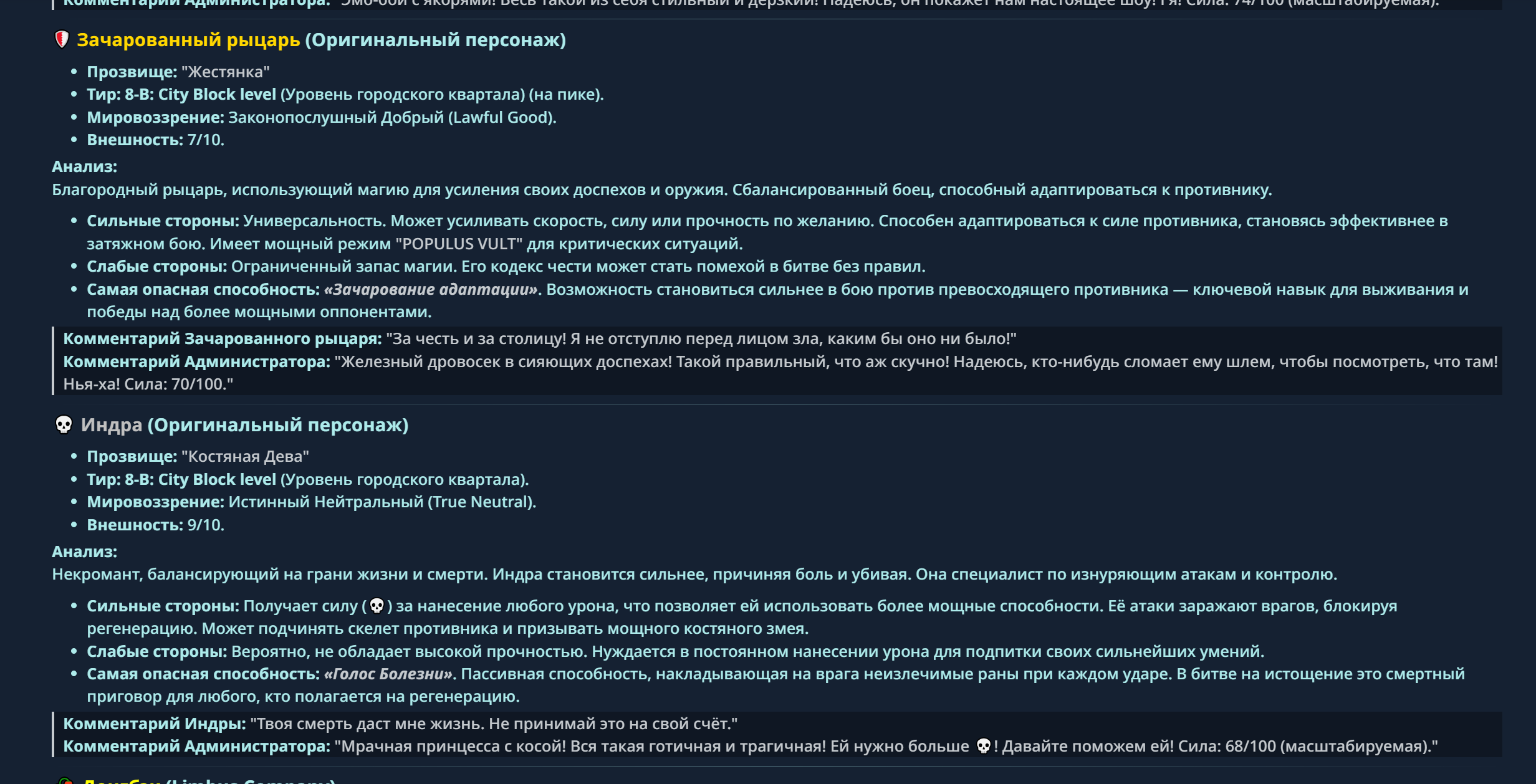 6} Набор персонажей полностью закрывается после начала боя и открывается только когда он закончится и будет объявлен новый набор. Если персонаж вкинут до набора - не обижайтесь, что его не приняли.