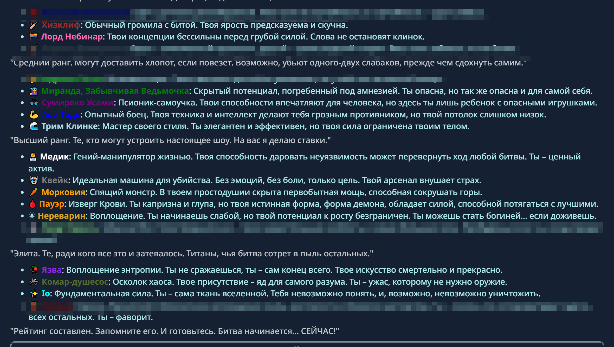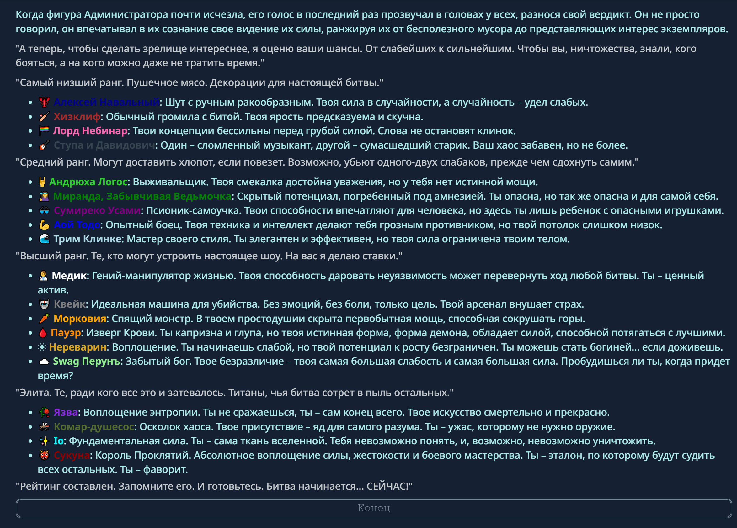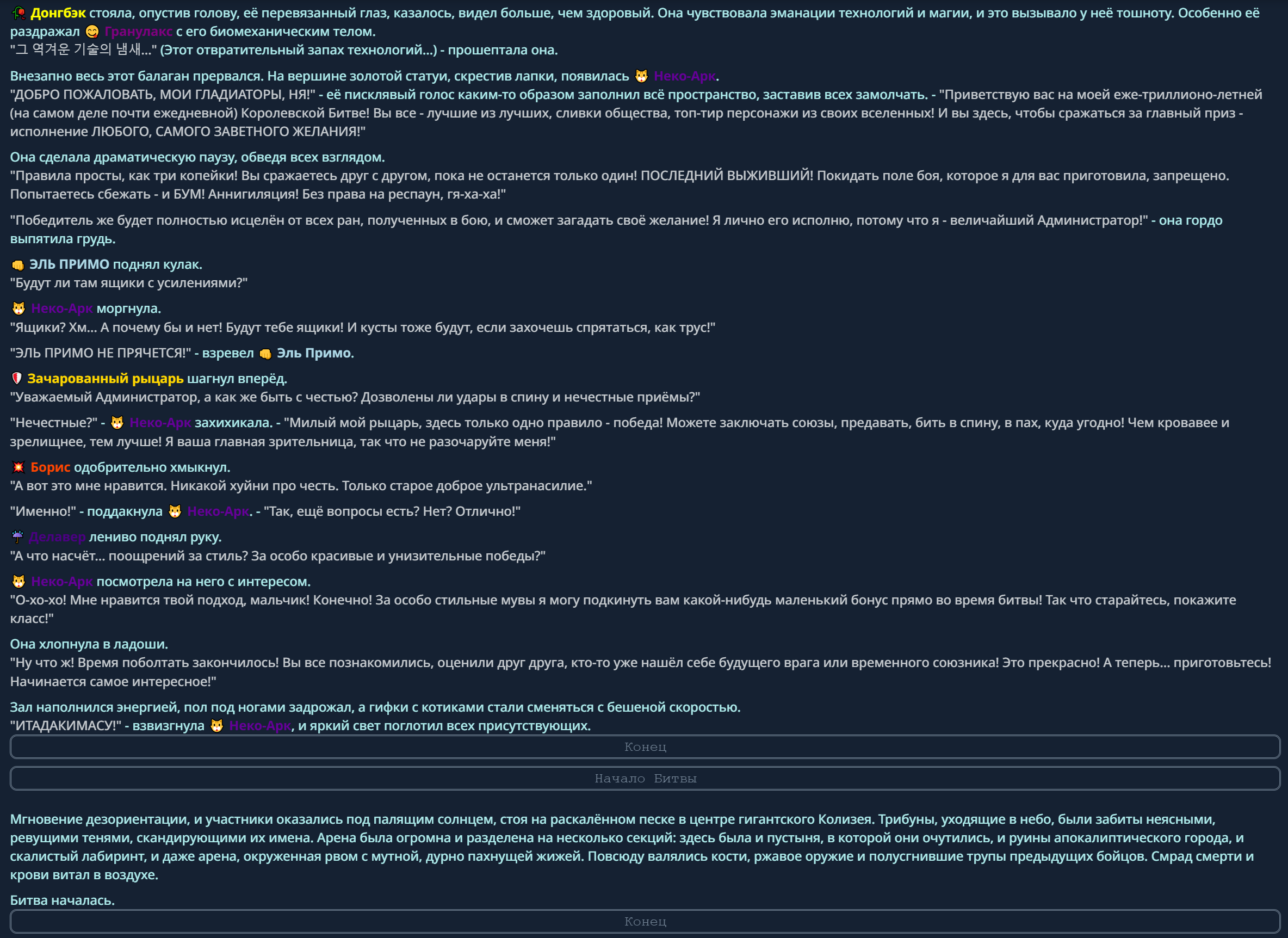 6} Набор персонажей полностью закрывается после начала боя и открывается только когда он закончится и будет объявлен новый набор. Если персонаж вкинут до набора - не обижайтесь, что его не приняли.