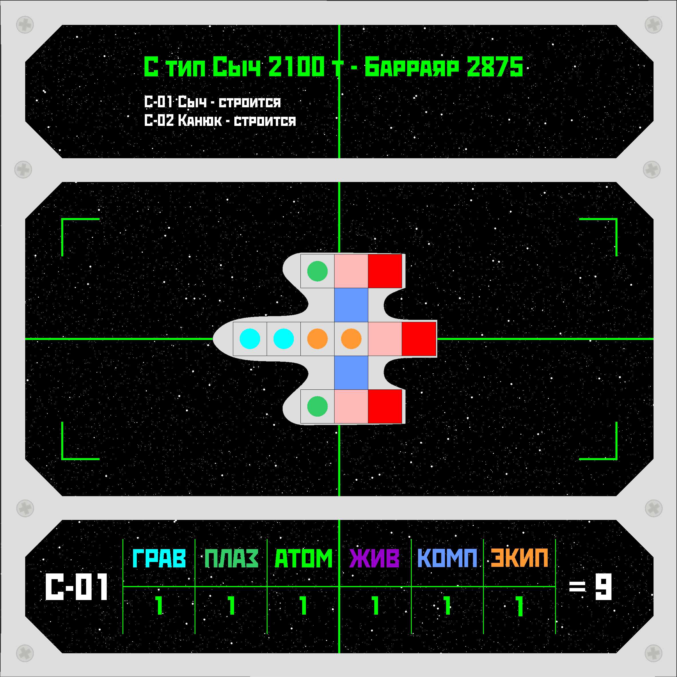 >>680696 ИГ = Искусственная гравитация. Уровень боевой мощи (БМ) для гравиганов (голубой цвет на схеме). ФП = Физика плазмы. Уровень БМ для плазмаганов (ярко-зеленый цвет на схеме). ЯФ = Ядерная физика. На корабле нет Р-зарядов, поэтому в графе стоит нолик. ПС = Пропульсивные системы (двигатели - красный цвет на схеме, топливо - розовый). БзЖ = Борьба за живучесть. Уровень БМ для ионных экранов (фиолетовый цвет на схеме). СиК = Сенсоры и компьютеры. Уровень БМ для бортовых систем (синий цвет на схеме). ТиО = Тактика и организация. Уровень БМ для экипажа (оранжевый цвет на схеме). Желтый на схеме - модуль плазменного зеркала (хуетень, которая делает корабль линкором).