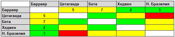 Комментарий ИСБ: 1. Дать точные цифры сложно, т.к. применяемые методики оценки разработаны для Барраяра и плохо учитывают историю и контекст отношений между другими планетами. 2. "Красная зона" в отношениях Цетаганда-Н.Бразилия и "желтая" Цетаганда-Хеджен — результат текущего "кризиса мертвой руки".