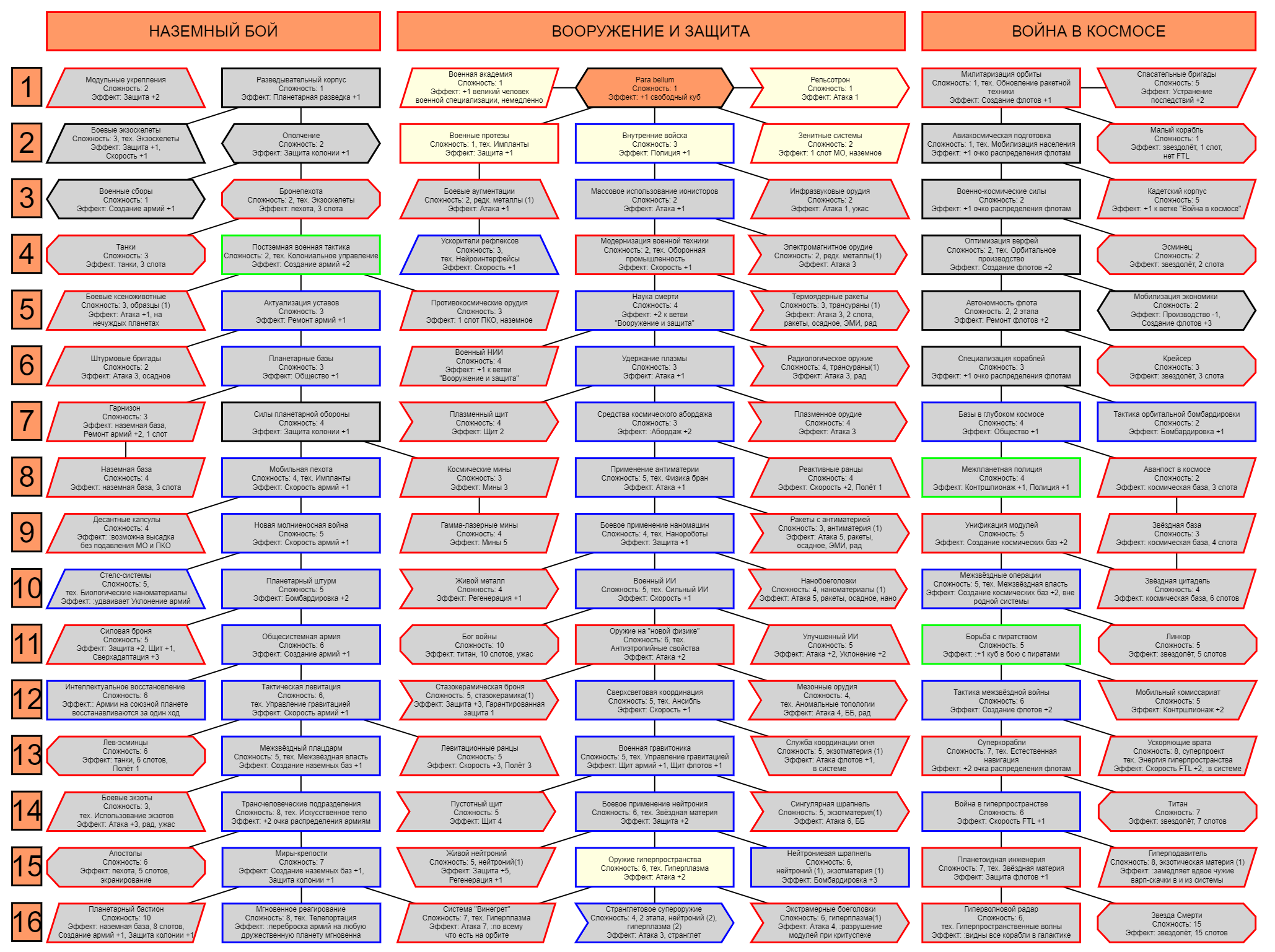 >>703160 Кароч косой шестиугольник это здание. Шестиугольник - проект. Восьмиугольник - боевая единица. Трапеция - слот для армий (наземное) Перевернутая трапеция - слот для кораблей (неназемное) Прямоугольники - технологии, которые можно и наукой изучать, один раз и навсегда и везде.