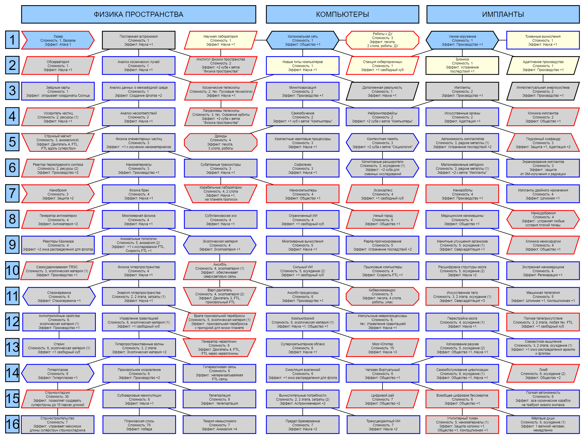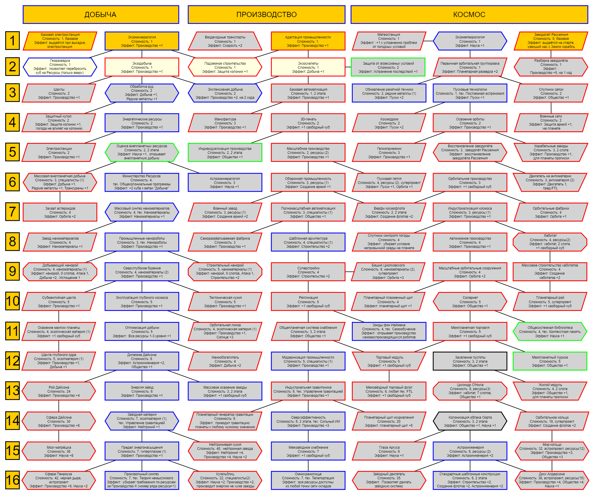 >>703048 Все верно, но плюс к этому какого бы цвета ни была технология (прямоугольник), ее можно всегда изучить наукой. >Все технологии могут быть исследованы с помощью Науки. Но некоторые можно открыть, частично или полностью используя другие параметры. В частности: >в синей рамке — открывается только с помощью Науки, >в зелёной или белой — можно дополнительно использовать Общество, >в красной — Производство, >в чёрной — открывается любым параметром.