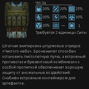 Пассивные бонусы характеристик за 1 единицу: Сила — +5 к максимальному весу, начальный максимальный вес 20. Вещи без требования силы, весят 1 условную единицу. С требованием Силы 1 — 3 условные единицы, с требованием Силы 2 — 7 условных единиц. С требованием Силы 3 — 11 условных единиц. Надетые костюмы не учитываются. Интеллект — +5% к сопротивлению пси-излучению.