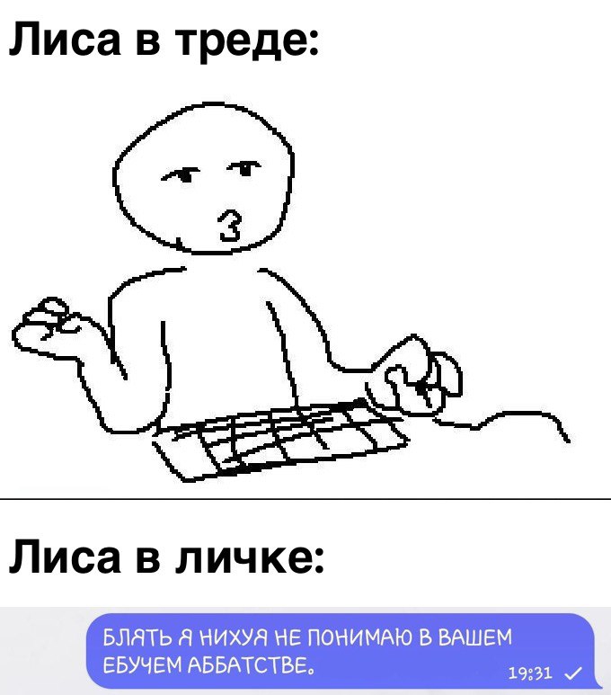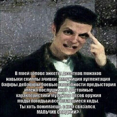 >>738853 >1. Признаем что были на месте крушения Да они и не просят признаний, они уверены. Мы не отрицаем. >2. Признаем что брали оттуда детали и другие припасы Ну да, вся пустошь там наворовала уже. Ничего необычного >3. Какие и сколько — отказываемся уточнять, потому что отдавать ничего не кому не намерены Согласен, мы и не помним уже епт >4. Также там были следы мутантов. Мутанты ходили на станцию как на праздник, большими группами, каждый день. Если кому и предъявлять претензии, то им. Пока претензий не слышно >5. Что упало то пропало. Мы в своем праве Все эти пять пунктов уже похожи на оправдания, брат. Нас ни в чем не обвиняют же. Поэтому я и спросил их хули надо. Просто они такие припиздили, говорят мы знаем вы там были, вещь нам важна, возможно вы знаете что мы имеем ввиду. Ну блять, возможно. Все, давайте, пока, страшный суп стынет