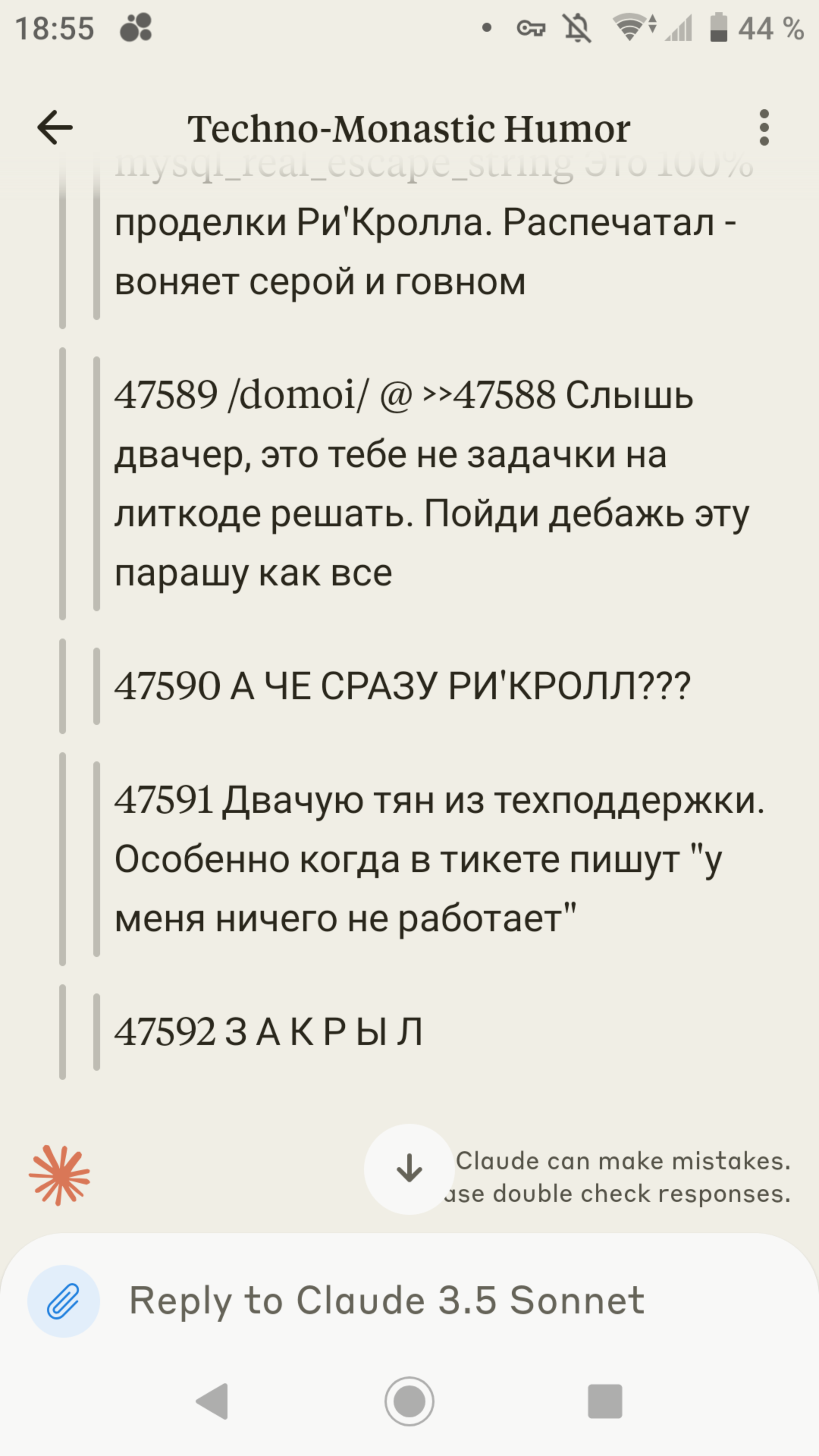 >>739604 Я ж говорю, бездушные железки. Явно их начальник такой же болванчик как и они сами. Может даже не допёр что государства уже двадцать два года как нет и что все из претензии — наезд чистой воды. Не мешало бы ёбнуть их для профилактики, не дожидаясь когда они вызовут роботов—ахматовцев для совершения рейдерского захвата выгодного актива.
