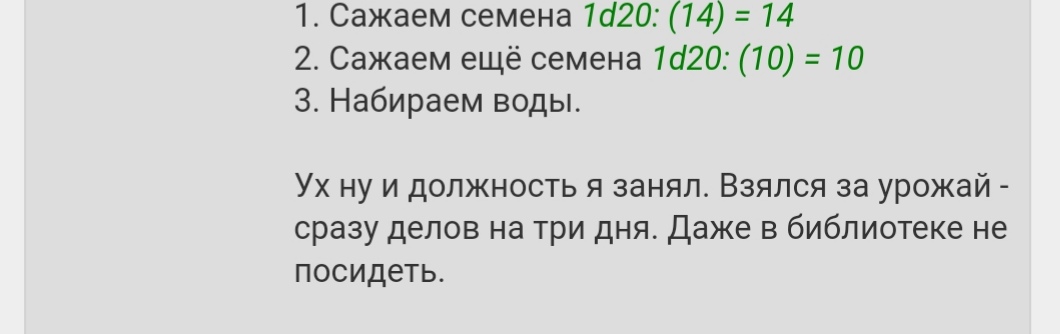 Дублирую сюда: К слову это, я предлагаю по поводу экспедиций установить следующий факт 3 действия экспедиции = 1 глобальное действие вне экспедиции, приделав на нитки обоснуй "ну ты же не идиот лабораторию 5 часов обыскивать. Часа тебе достаточно". Чтобы можно было исследовать больше точек и не ТРЯСТИСЬ, но при этом нельзя использовать ночное действие. Да, конечно это выглядит как три магистра ебут экспедицию на 27 действий, но, например, нам в подводном городе действий очень не хватало, как по мне. Плюс можно доколхозить правила, что, если в экспедиции случается энк - он жрёт одно действие. И таким незамысловатым образом, высылая нам проходные энкаунтеры можно жрать действия. И, к примеру, интерактивные вещи внутри энка, типа "использовать алтарь, чтобы оживить статуи" тоже требует действия