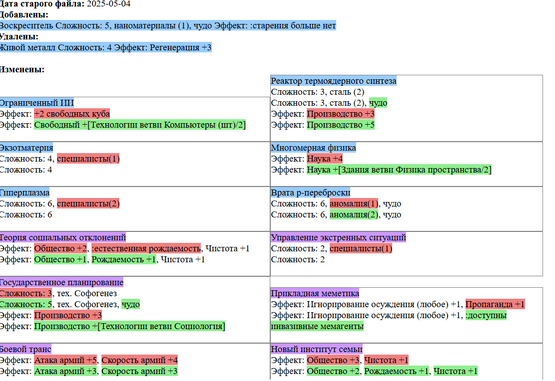 Технологии указаны блоками, под блоком (или отдельной технологией) идут комментарии. Соответственно, в посте желательно писать так же: описание исследования - блок технологий под спойлером с игромеханическими эффектами. Не стесняйся задавать любые вопросы, я писал это в (как обычно) малоадекватном состоянии. Двойными плюсами указываются для парсера постов бонусные технологии или эффекты. Если ничего не указано - обычно значит у технологии просто успех, можно свериться со скриншотом если что.