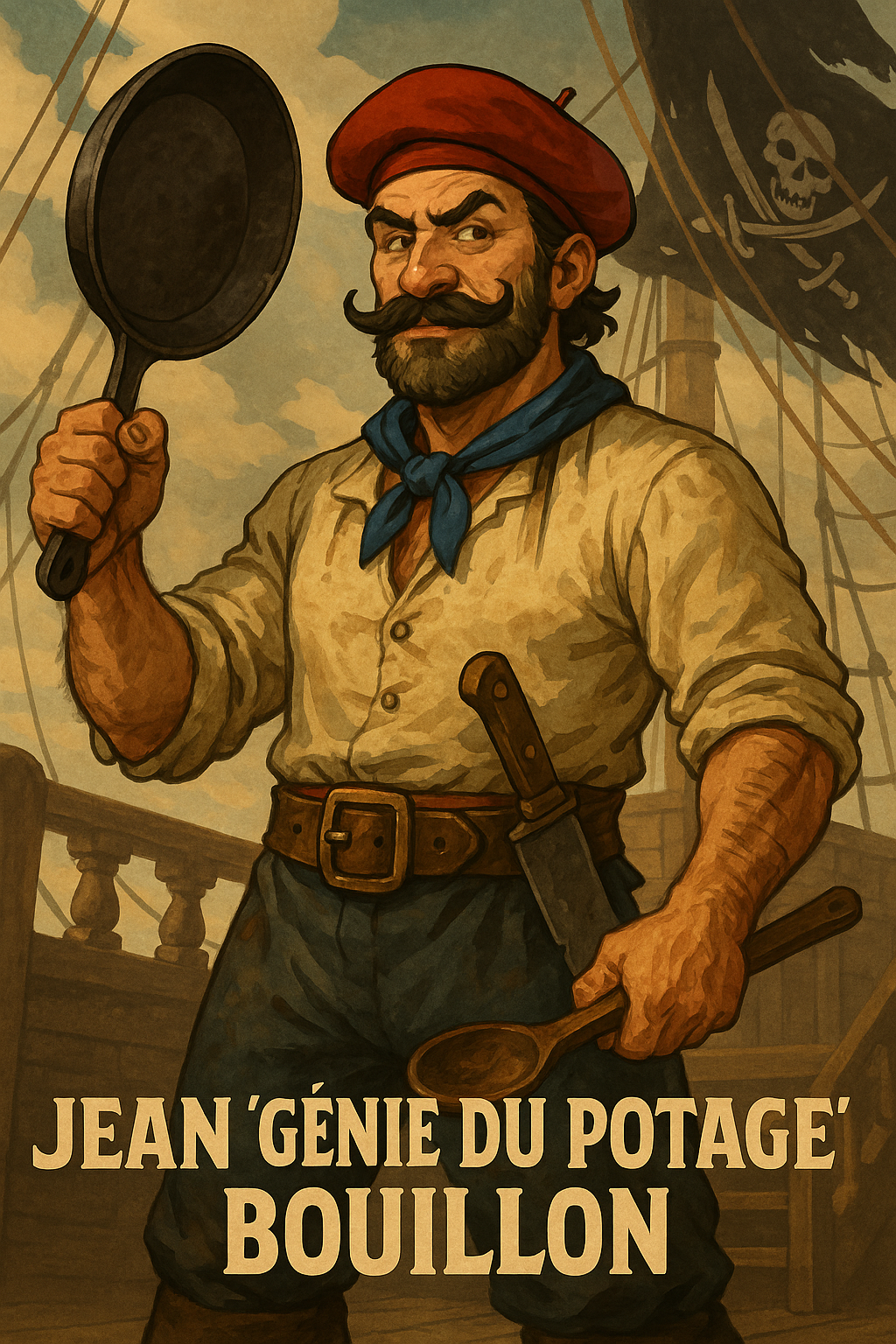 Описание Жан "Génie du Potage" Буйон — корабельный кок родом из Марселя, поднимающий дух корабельного экипажа своими блюдами и байками. Его пиры после абордажа запугивают врагов, а умение готовить из ничего и пылкий дух спасают экипаж в море. Но не смейте критиковать его стряпню - получите сковородкой по лобешнику!