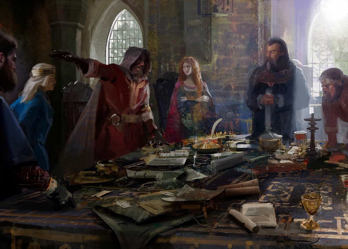 Действуя почти автоматически, вы направились в тронный зал. Приказ о созыве королевского совета всех выживших лордов был первым, что вы получили по возвращении короля. Переступив порог зала, вы увидели длинный стол, за которым сидели такие же измученные войной лорды, несколько королевских советников и молодые лица – вероятно, наследники, занявшие места погибших отцов. Короля еще не было. Кивнув знакомым, вы заняли свободное место. Здесь собрались те, кто сражался бок о бок с вами и те, кто бился на других фронтах. Обстановка на прочих направлениях оставалась для вас загадкой.