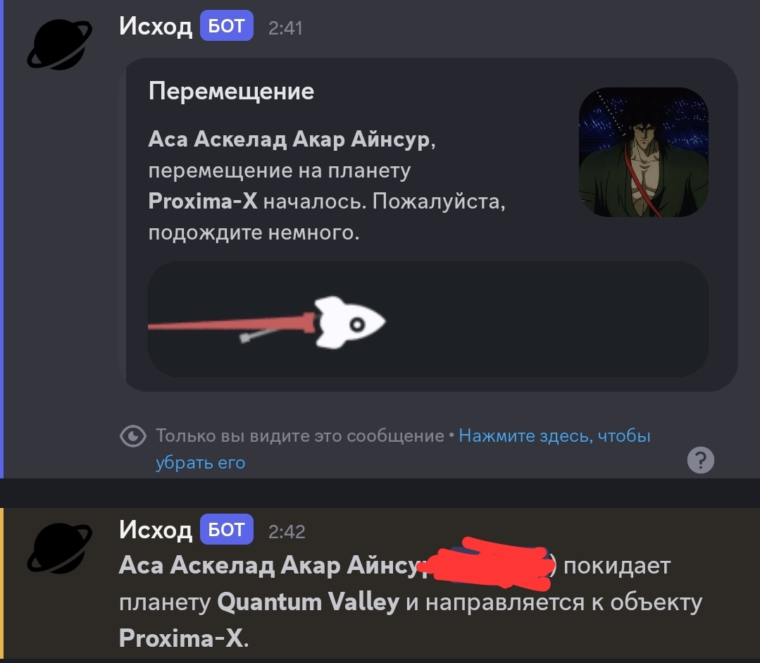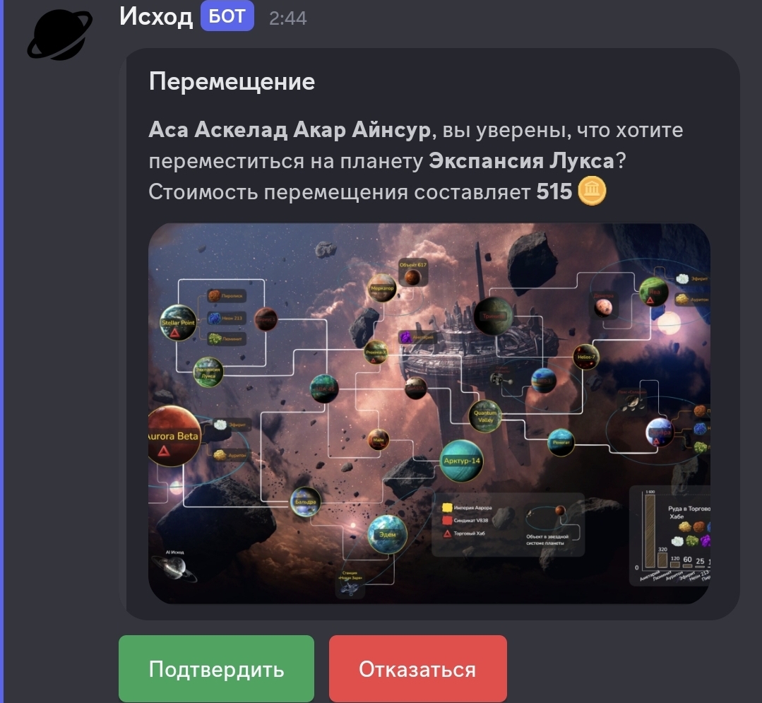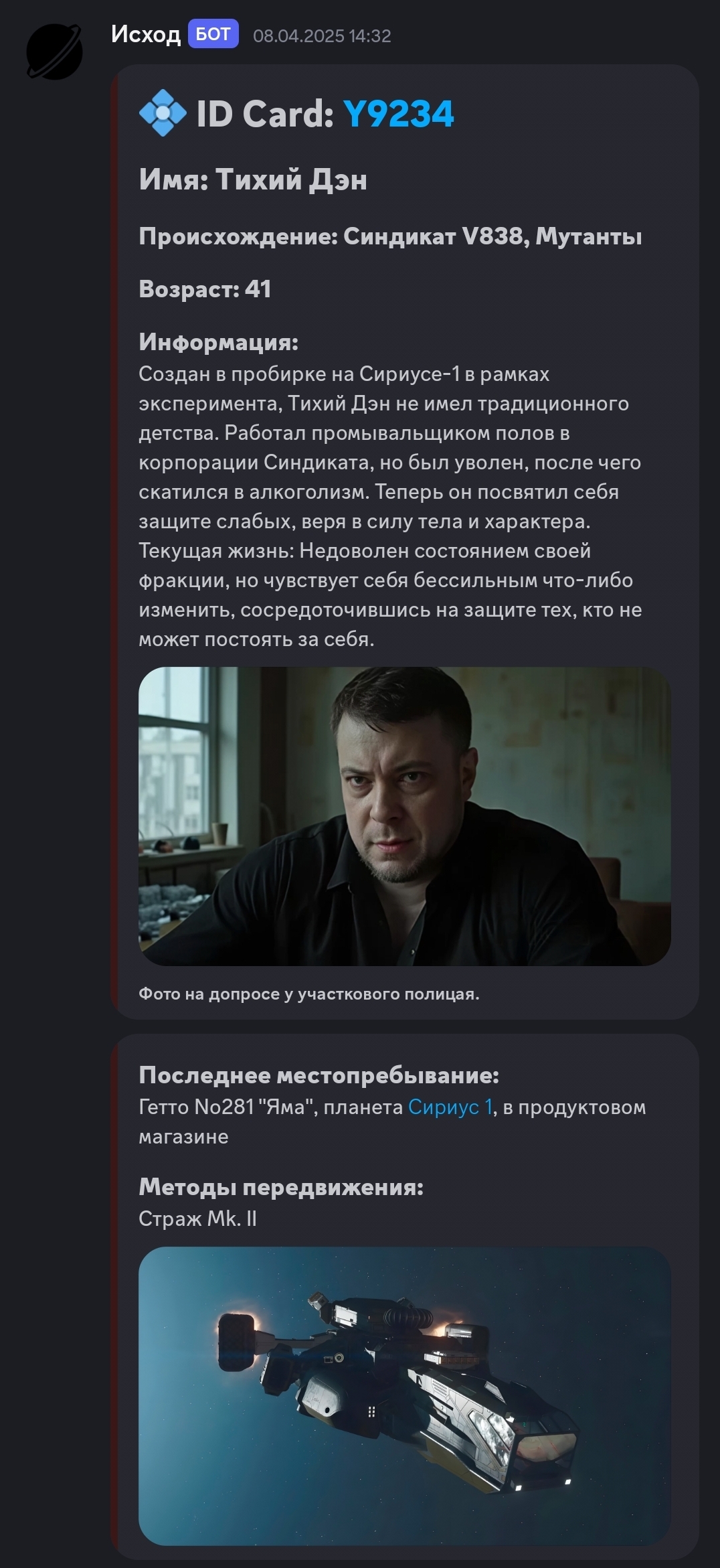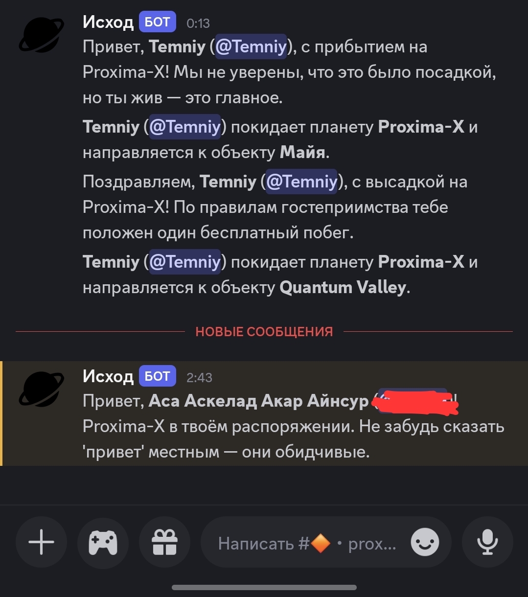 - играть в РП пробовали. Поняли что мы слишком ушли в механики, реализацию игры(она полностю в боте дс на питоне, 10к строк кода до чистки), и что стоило делать с 0 на норм движке просто тупо настоящую игру, или настолку хотябы. Результат игр, РП идеально для тех кто любит БРП проекты и фанат фантастики. РПшить новичку пришедшему от эльфиек и фуррихуйзнаетчего сложно адаптироваться. Мы начали многое казуалить, упрощать и делать понятнее. Сейчас на стадии бета теста - правила полностью готовы. Но это те правила, котоые мы написали опираясь на другие трп проекты, не исходил из наших ситуаций. Тоесть, это не претензионные правила, а первичные, базовые так сказать. Но если ты имеешь ввиду механики игры, они прописаны в коде бота - ИИ. Ее вклад на уровне редакции синтаксиса финальных текстов(с вложенным мною детальным смыслом, алгоритмом и постановкой). Возможно где то поленился. Но я сознательно искоренял любые следы ии, если таковые оставались после работы с ней и текстом. - все завязано к сожалению на одно площадке, из за того что мы делали бота там, в дискорде. Поэтому планеты равно каналы, делаешь варп прыжок, у тебя скрывается один канал,появляется другой. Выглядит примерно так: картинки из треда (я хуй знает как в середине текста прикреплять). Так что ответ звучит - можно. Лор будет двигаться даже если не участвовать в ивентах. Короче все завязано на том, что игроки сами будут летать и делать себе контент между собой(РПшить). Хотя и задания есть полети туда сделай то итд. Но ивенты и действия игроков, будут влиять на лор. Да и обычные хорошие посты вне ивента тоже думаю будут. - я на дваче первый раз, это мой первый пост. Я заебался от малолетних дегров в дс, и хочу пообщаться со взрослыми (мне 25+). Откуда взялся? Хз, ищу тех кому понравится что я стараюсь сделать.